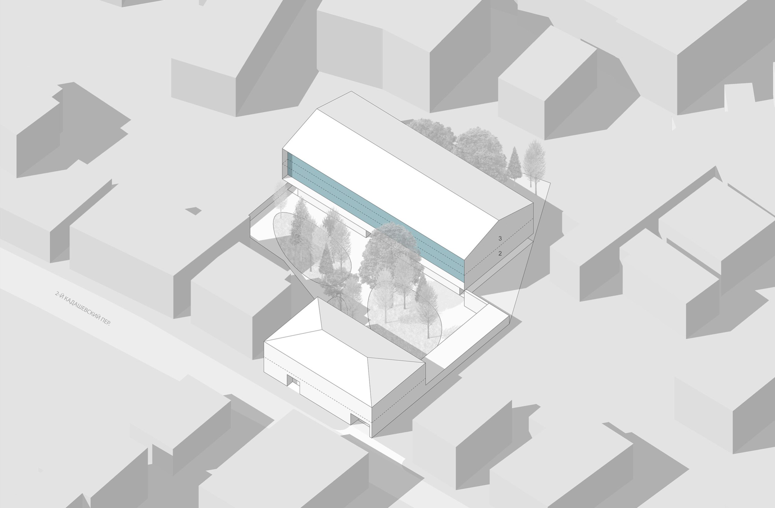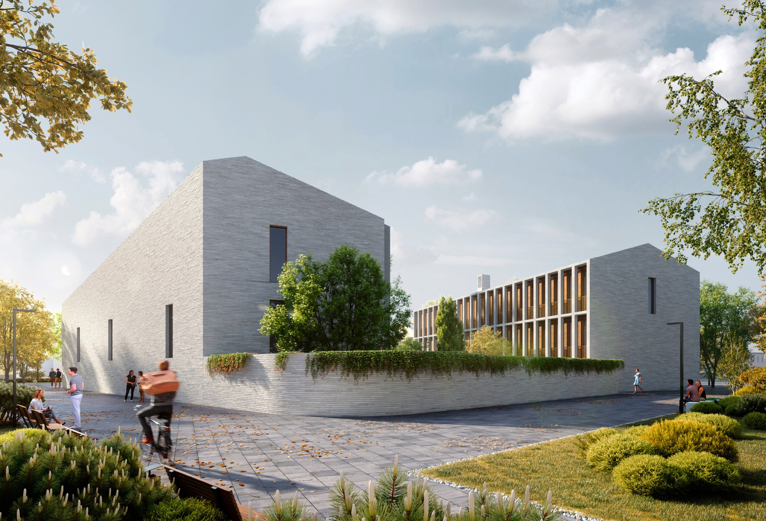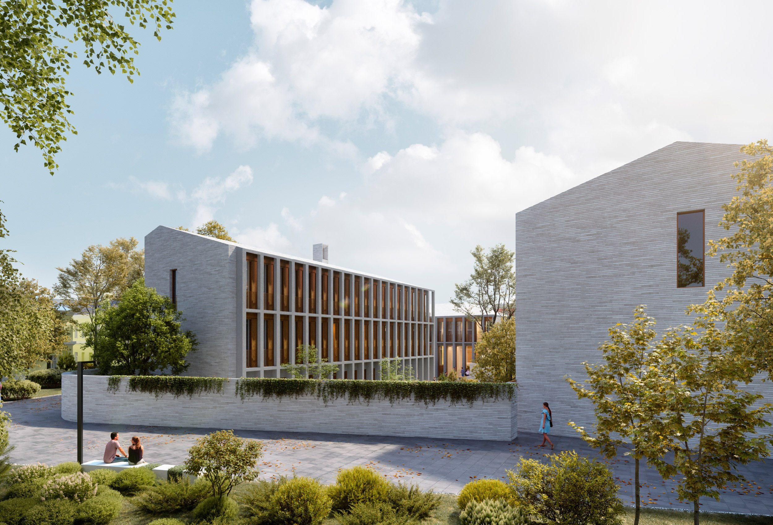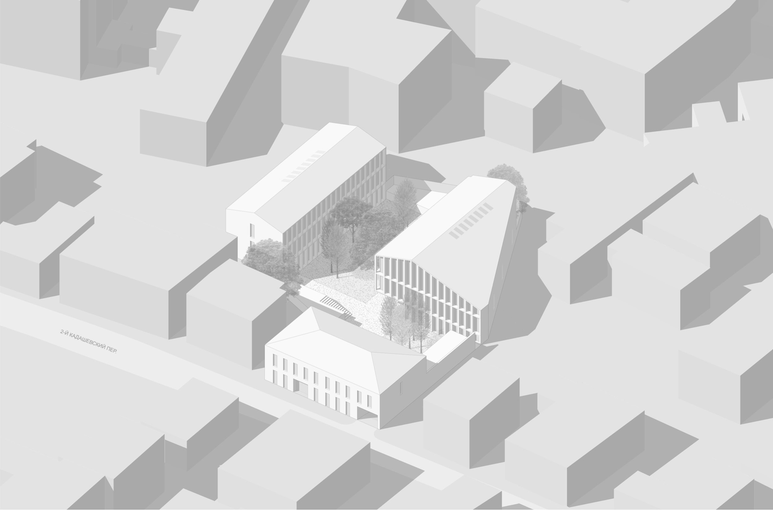 Два 3-этажных корпуса в глубине участка расположены вокруг центрального ландшафтного пространства. Их общий архитектурно-пространственный облик определяется вытянутой с юга на север формой и силуэтом скатных крыш.
