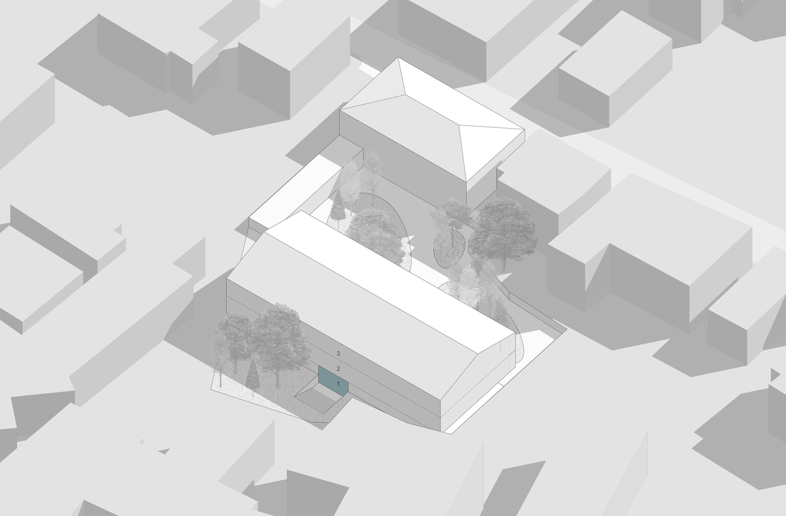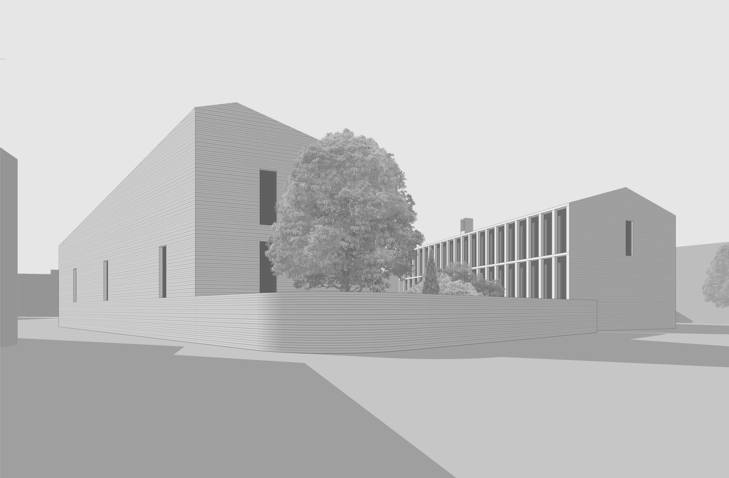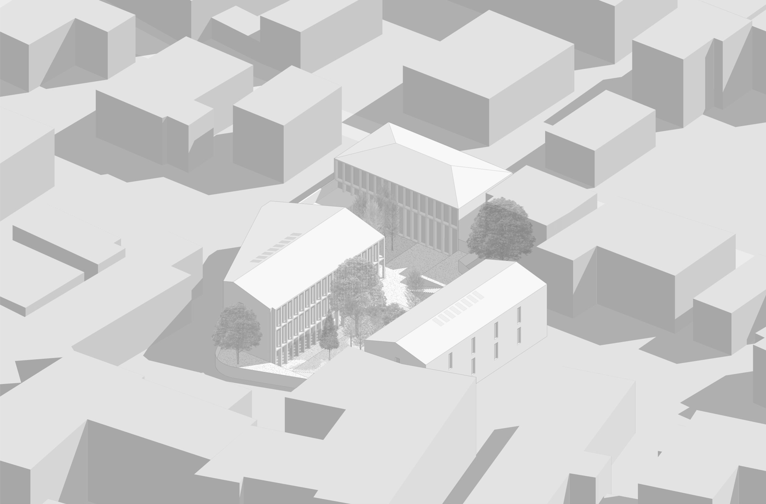 Два 3-этажных корпуса в глубине участка расположены вокруг центрального ландшафтного пространства. Их общий архитектурно-пространственный облик определяется вытянутой с юга на север формой и силуэтом скатных крыш.