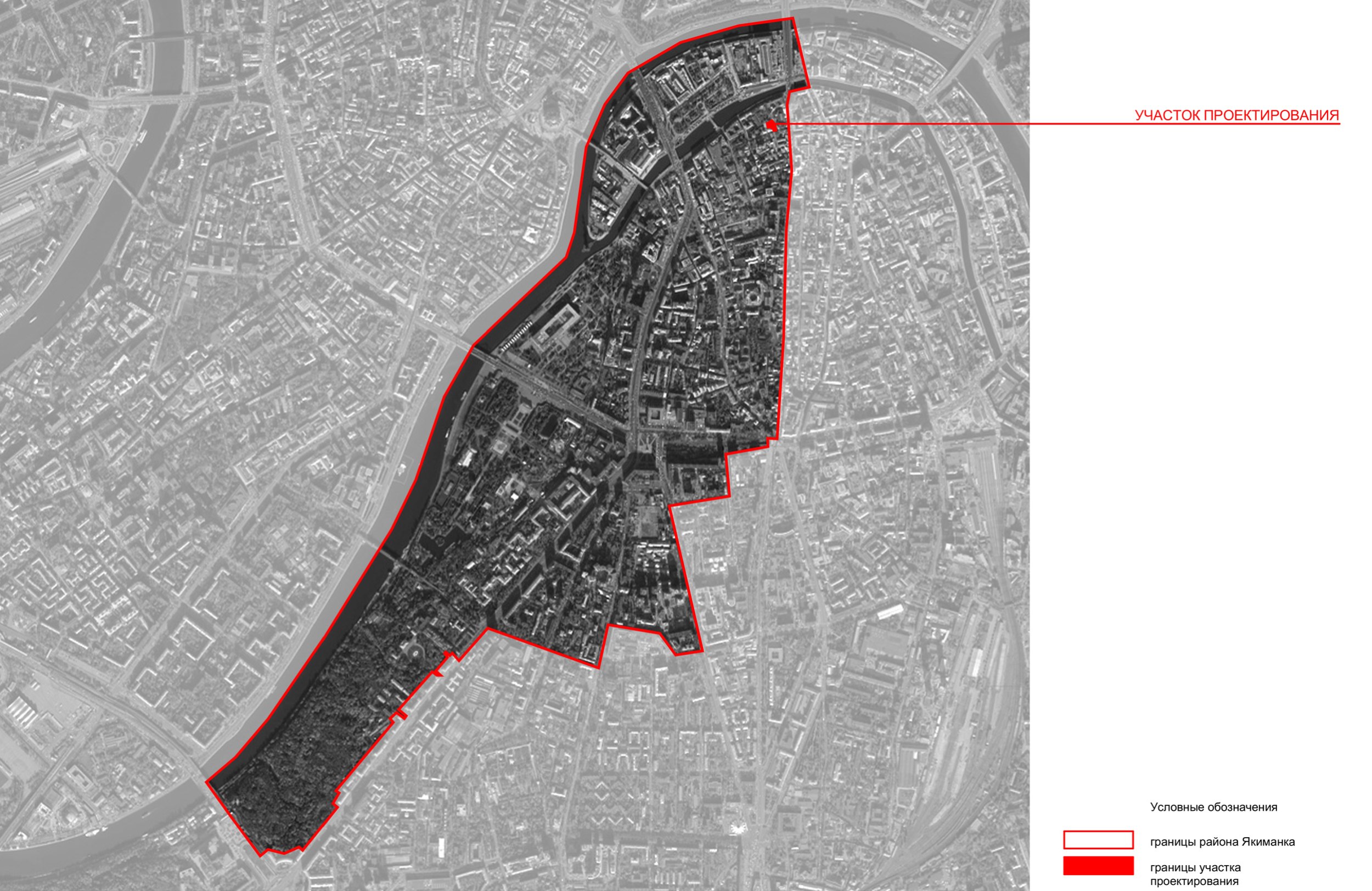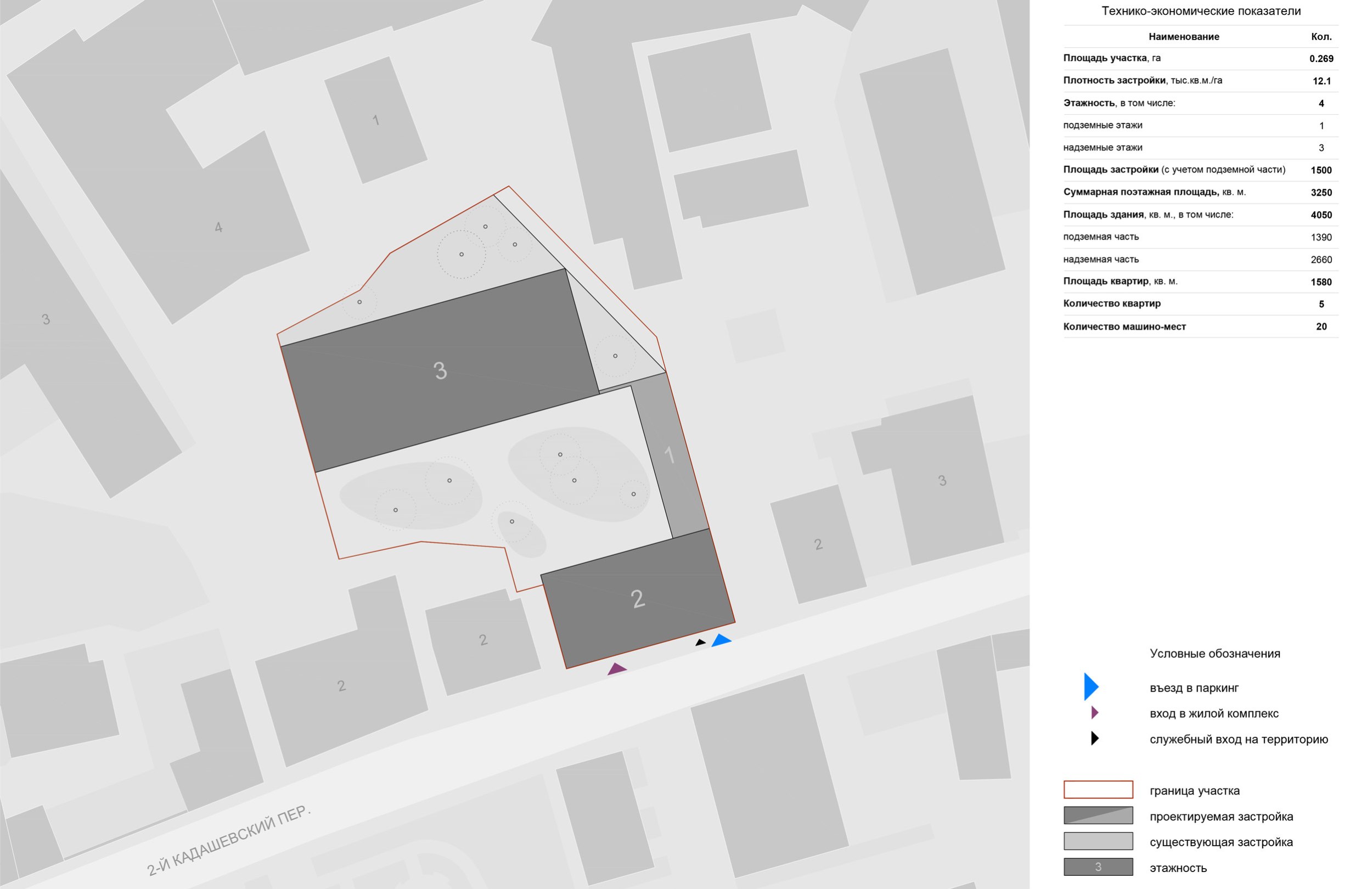 Территория проектируемого жилого комплекса является частью бывшей производственной зоны, расположенной между 2-м Кадашевским переулком и Кадашевской набережной. Земельный участок имеет сложную криволинейную форму, вытянутую преимущественно с юга на север – от Кадашевского переулка в глубину квартала. Площадь участка составляет 0,269 га.