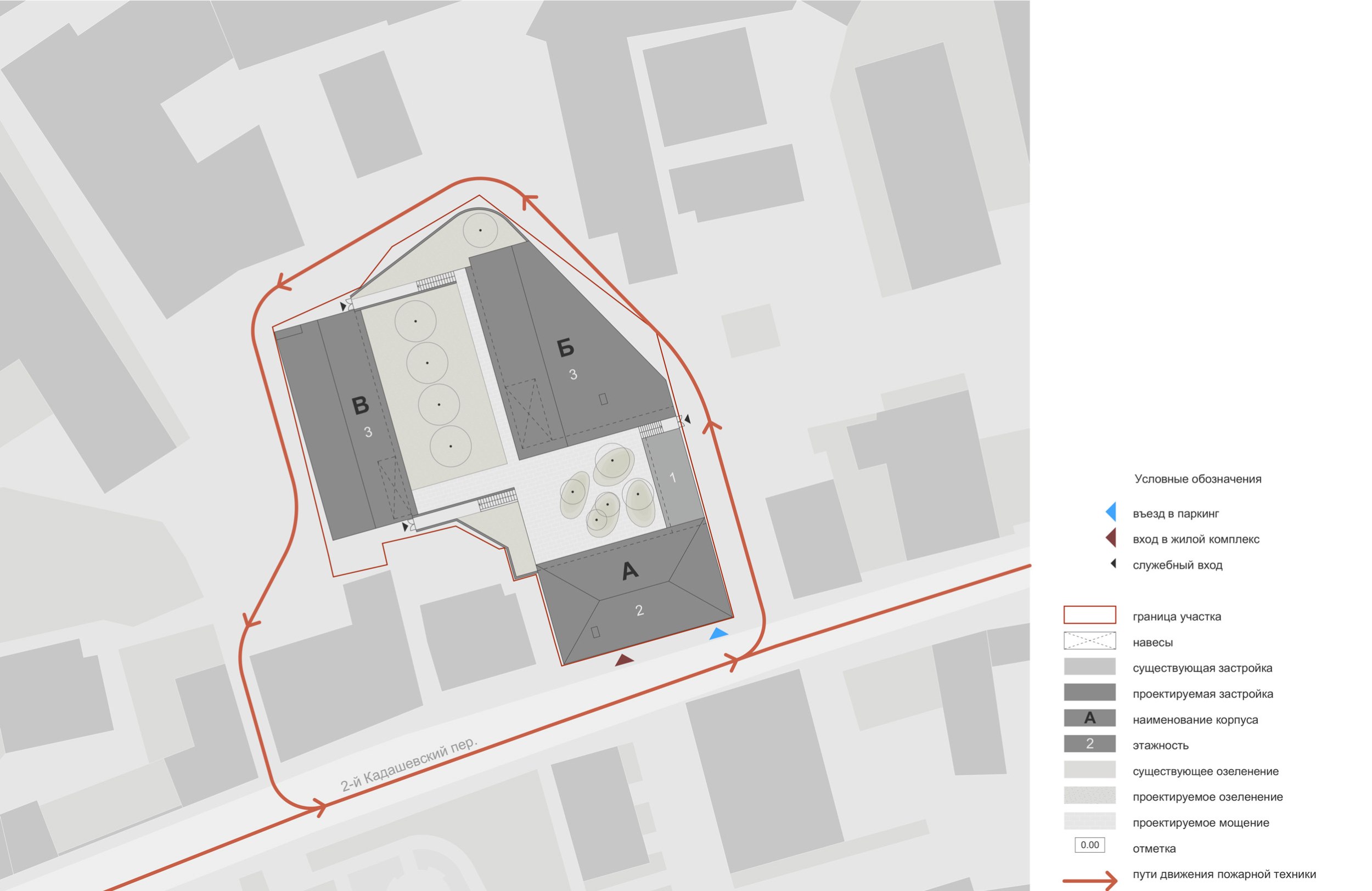 Главный вход на территорию комплекса расположен в южной части участка со стороны 2-го Кадашевского переулка. Входы в жилые корпуса организованы с внутренней придомовой территории. Служебные входы для обслуживающего персонала и уборки территории распределены по периметру. Подъезд пожарной и специальной техники предусмотрен со стороны 2-го Кадашевского переулка и Кадашевской набережной.