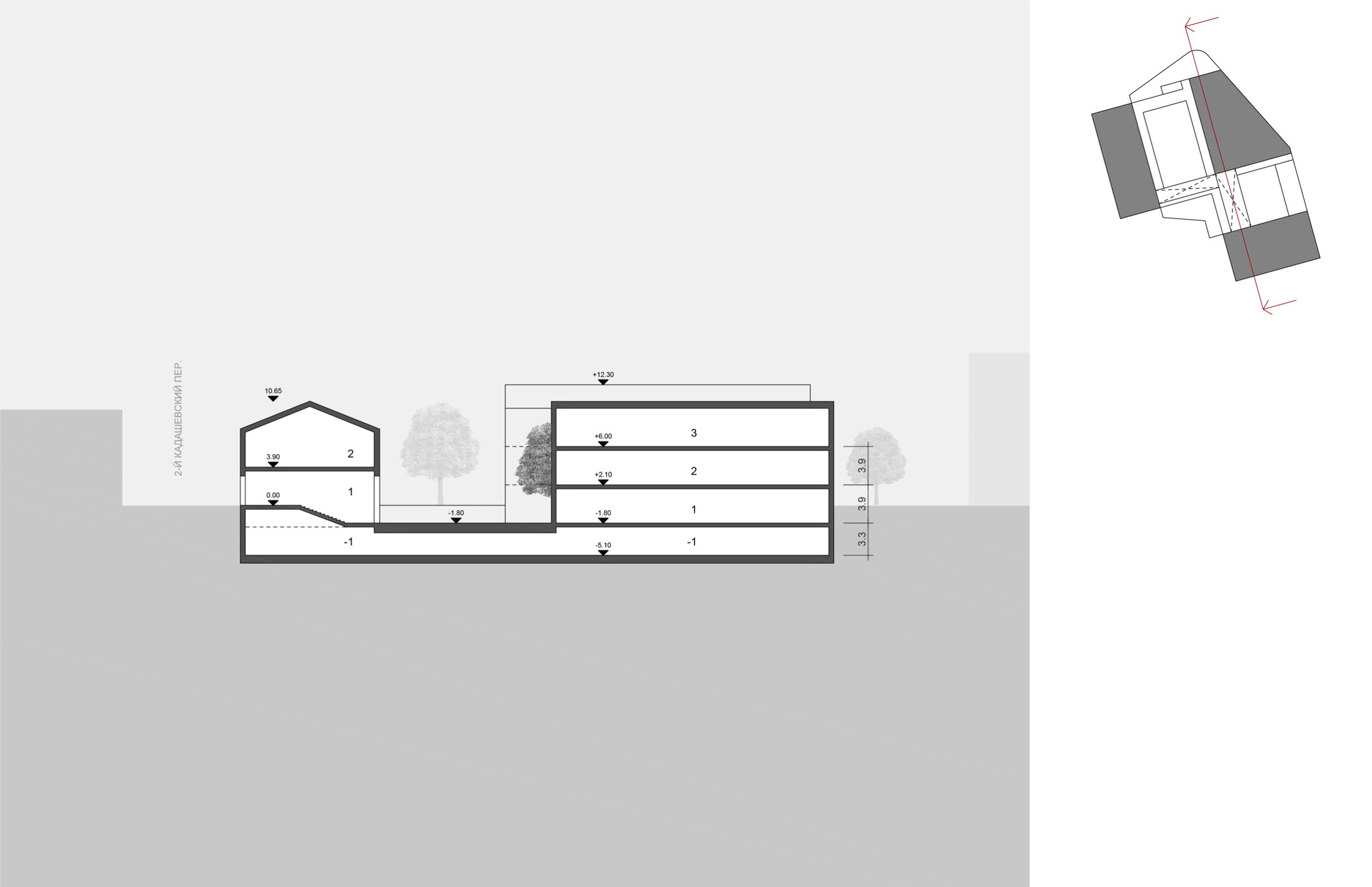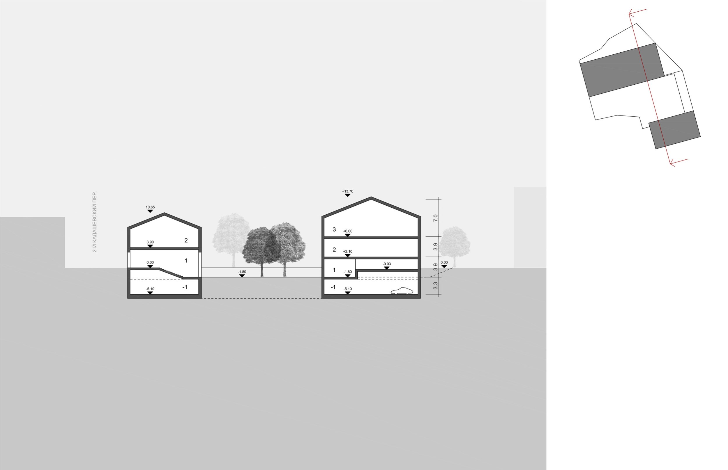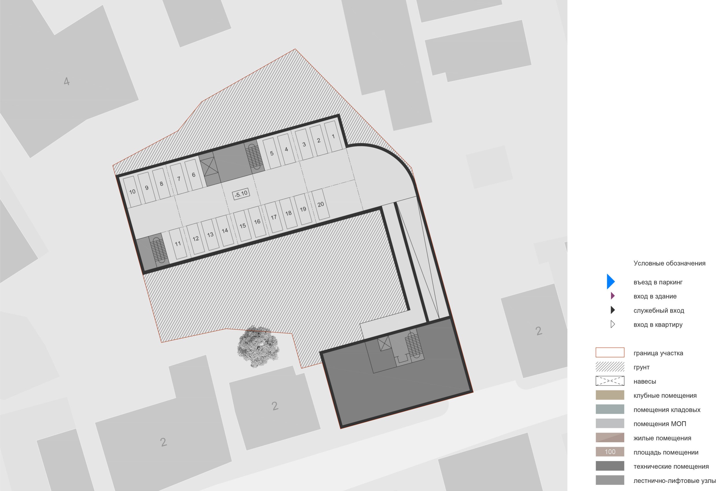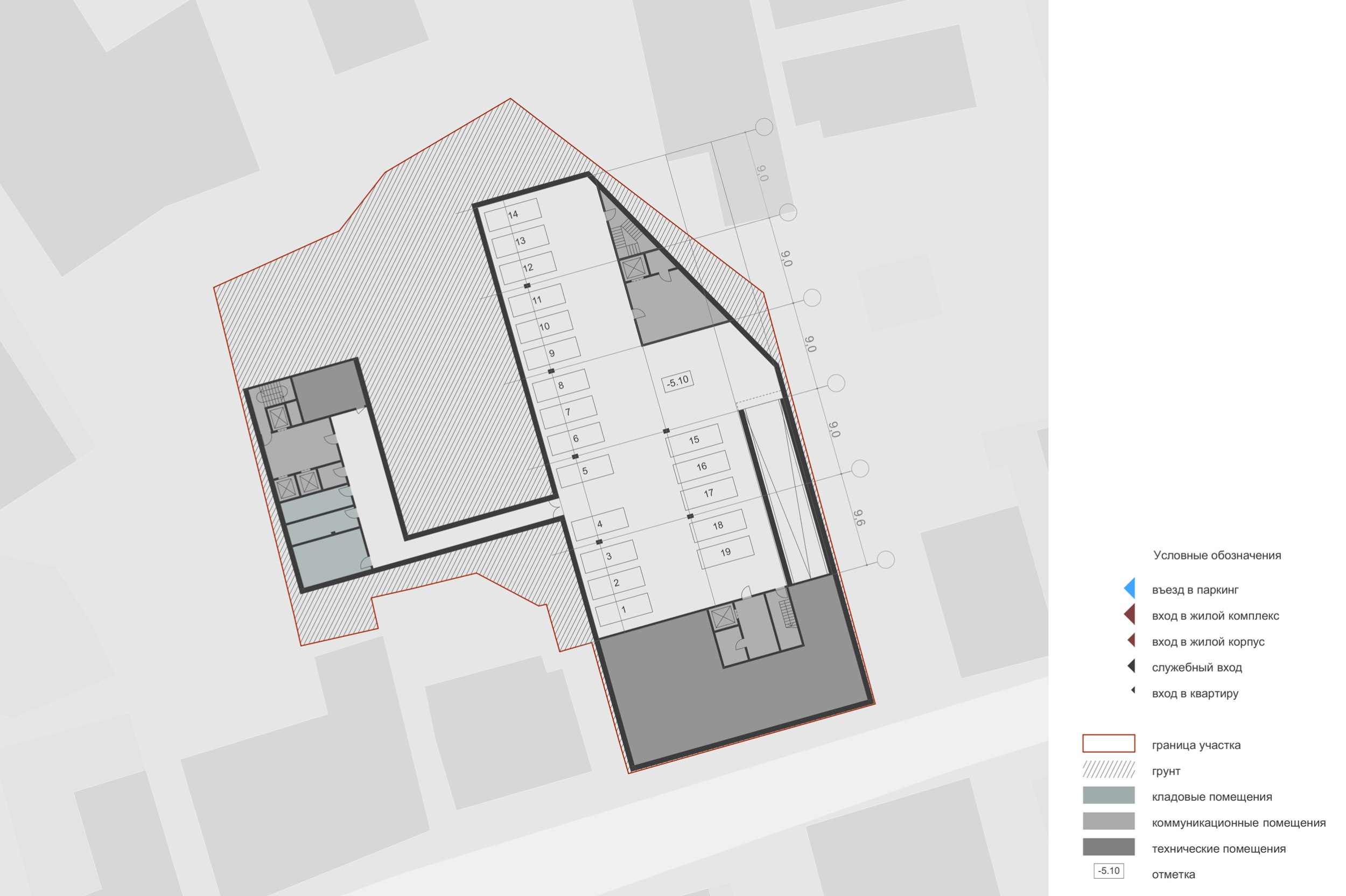 В подземной части комплекса размещается автомобильный паркинг на 20 машиномест для автомобилей большого класса, кладовые и технические помещения. Въезд организован по крытой однопутной рампе со стороны 2-го Кадашевского переулка.