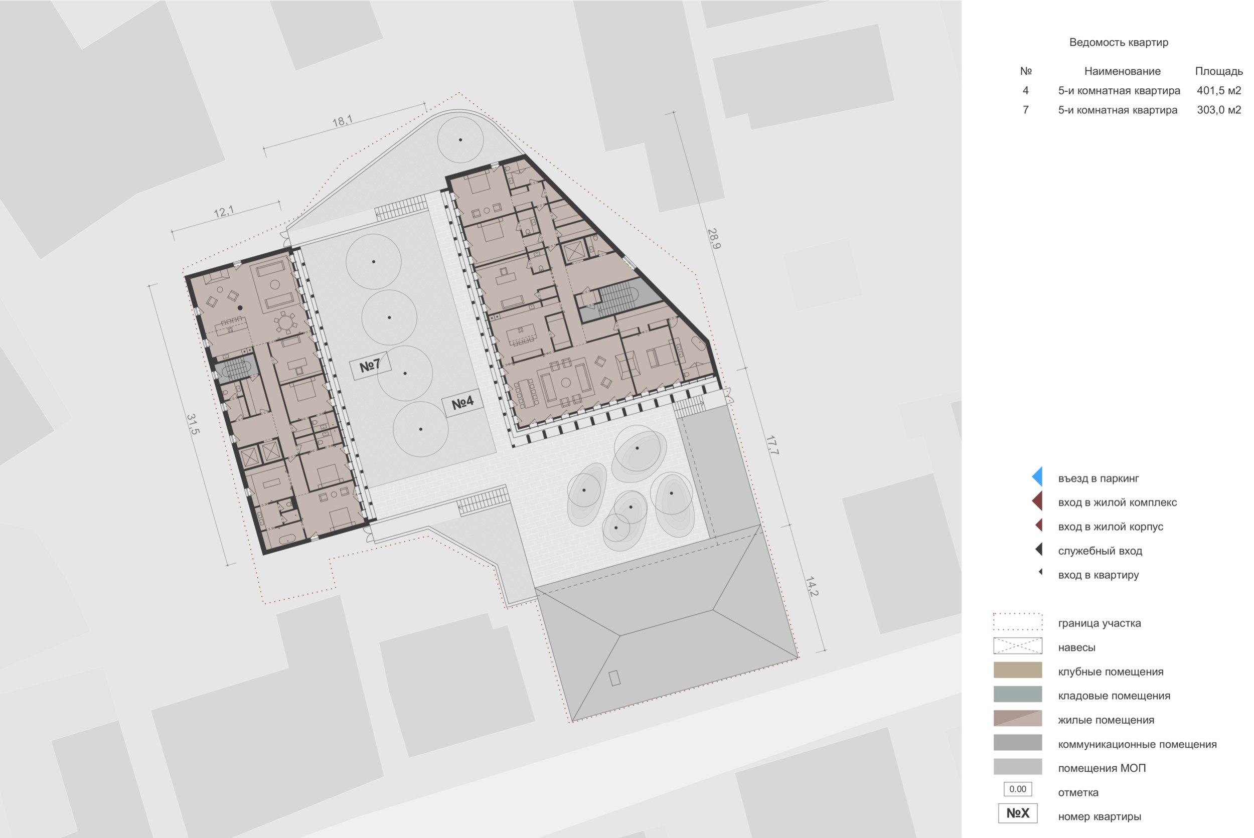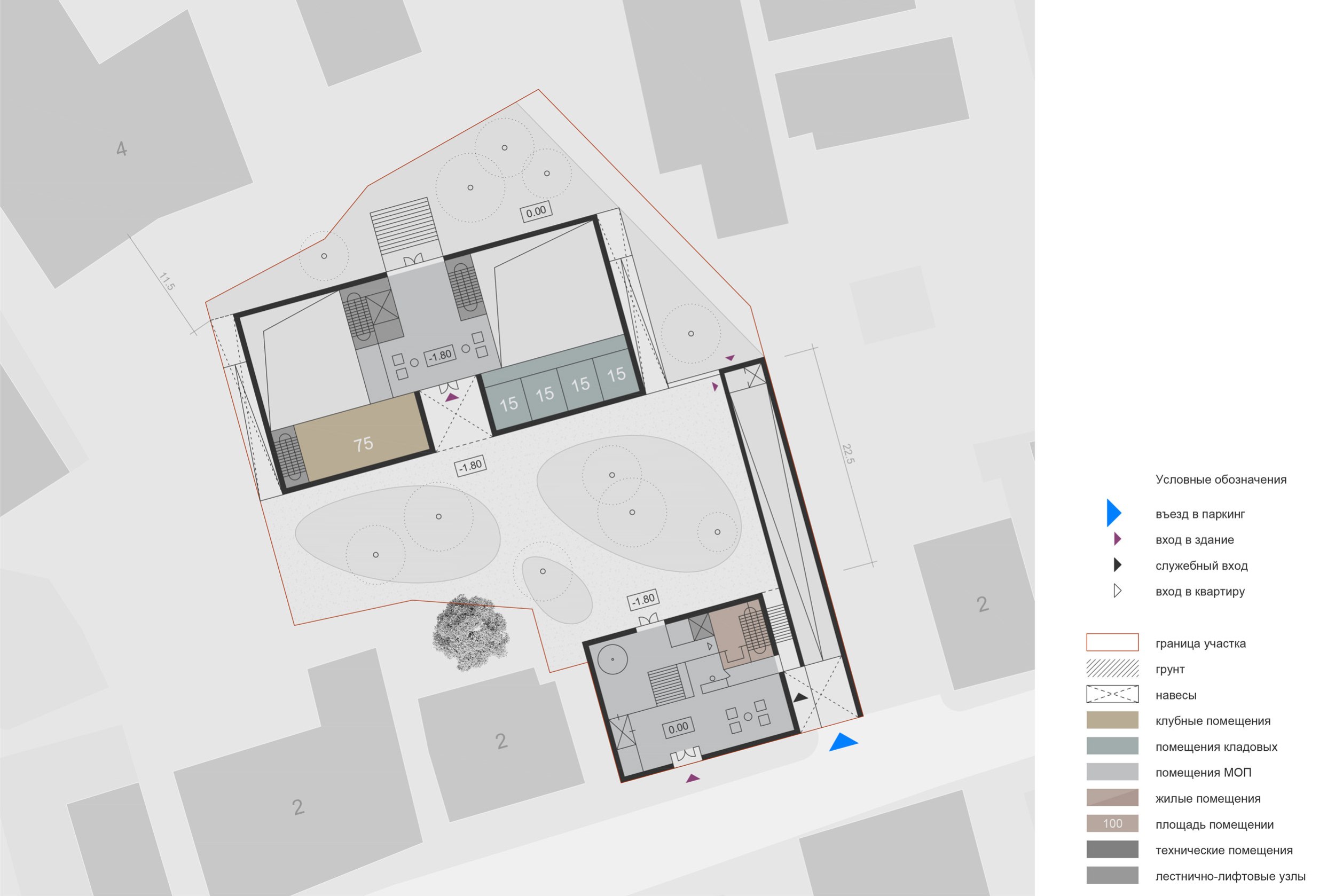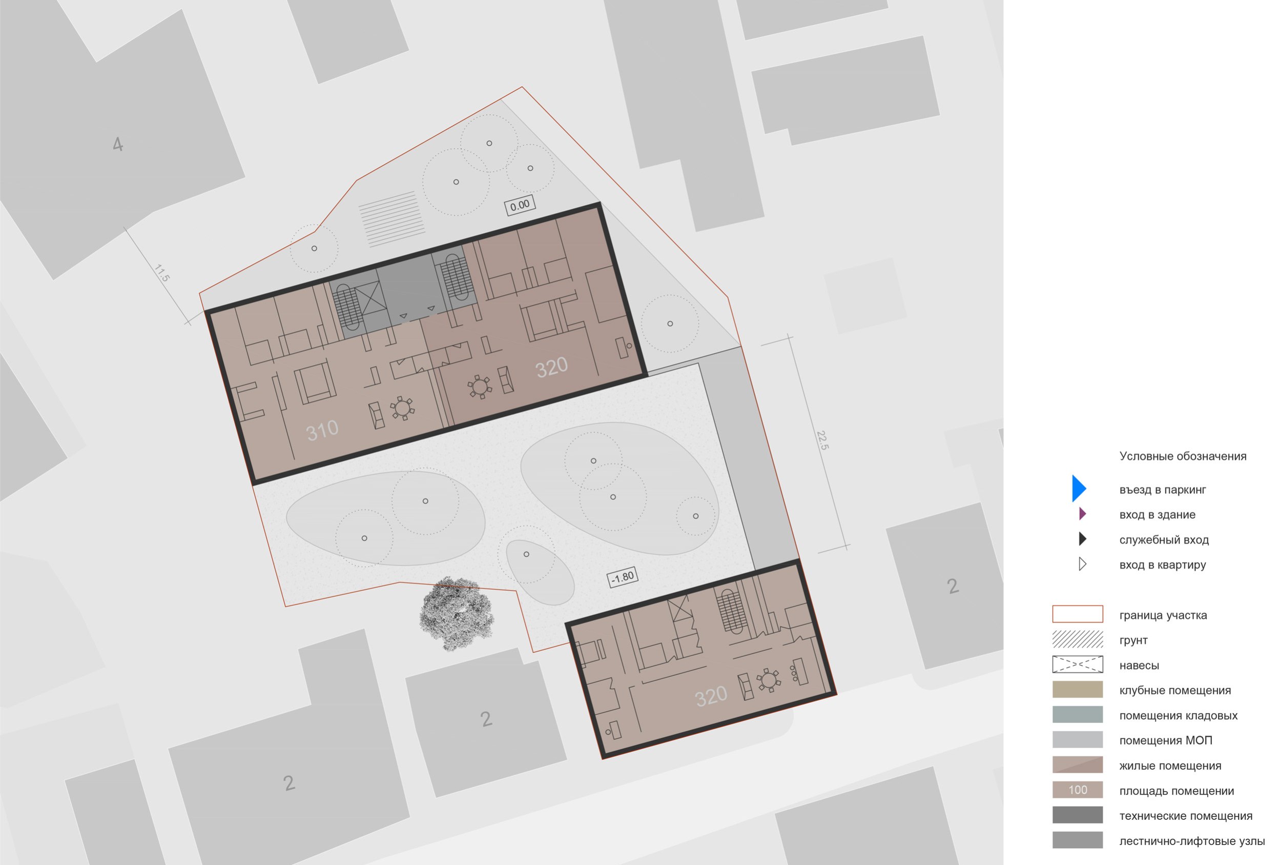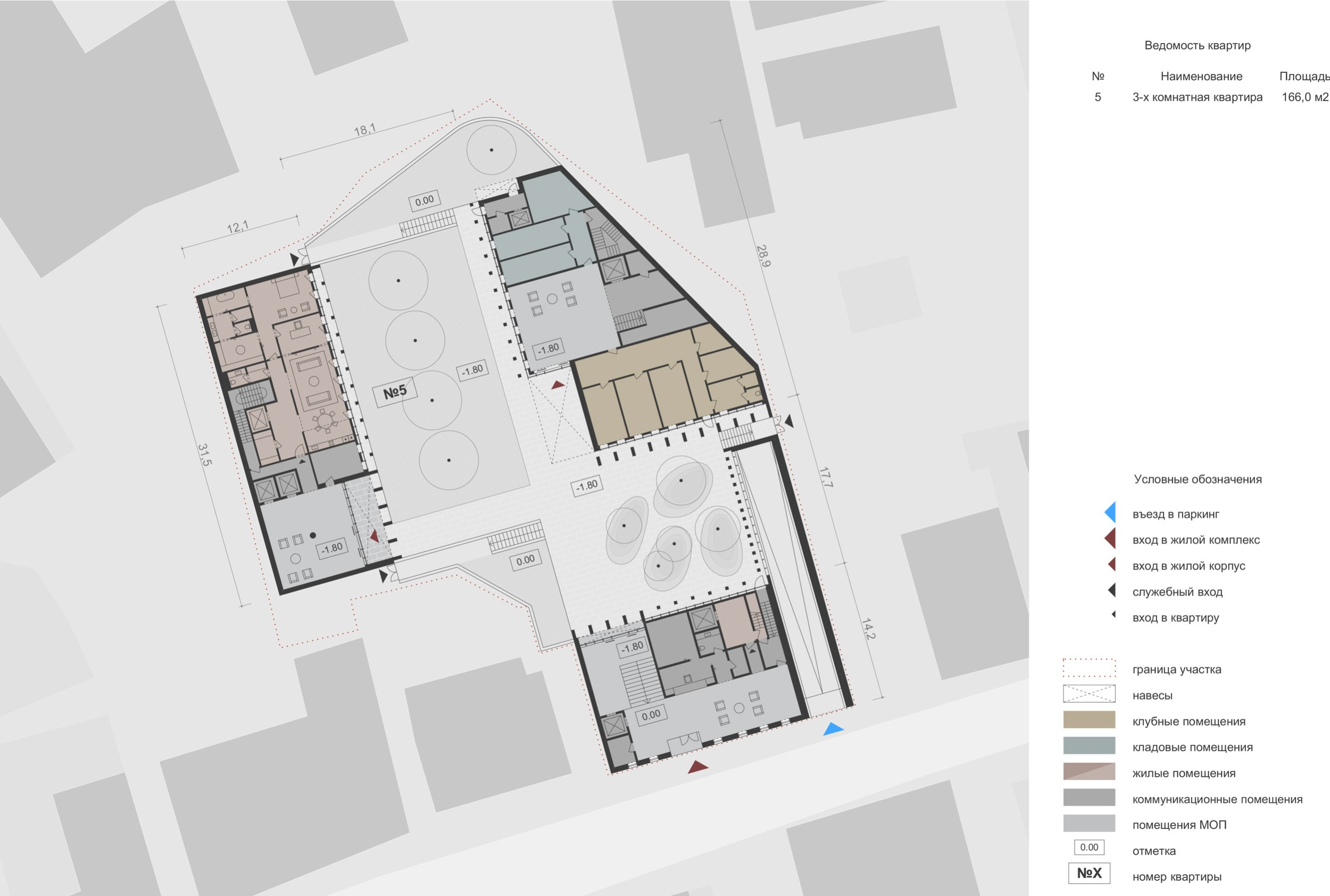 Внутренние дворы формируются искусственно спланированным рельефом: нижняя отметка опущена на 1,8 м относительно окружающей территории. Центральное дворовое пространство решено как сад с деревьями-крупномерами высотой от 3 до 12 м, включая вечнозелёные породы.
