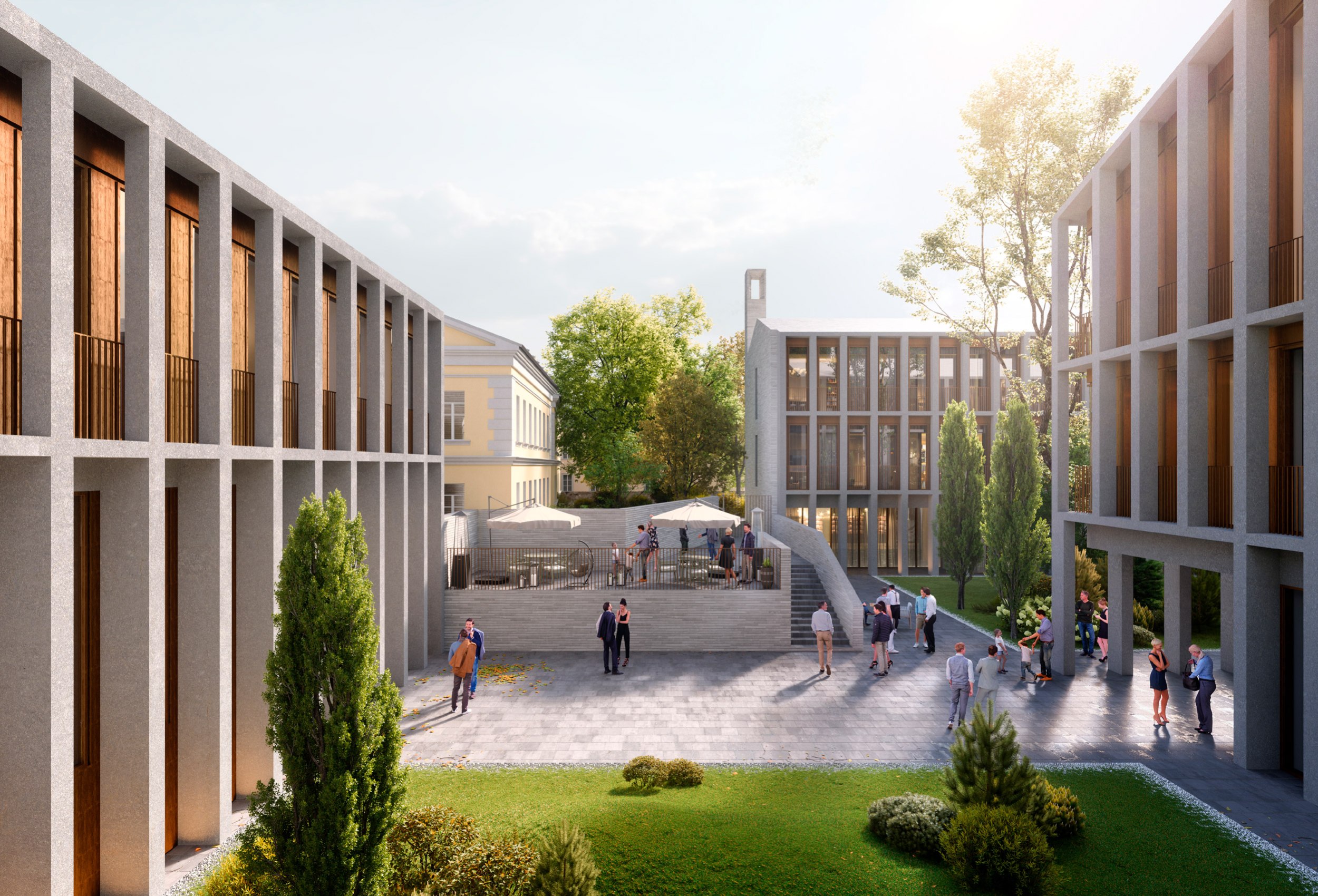 Периметральная композиция корпусов и перепад рельефа создают камерную жилую среду, визуально и физически защищённую от внешнего окружения.