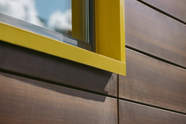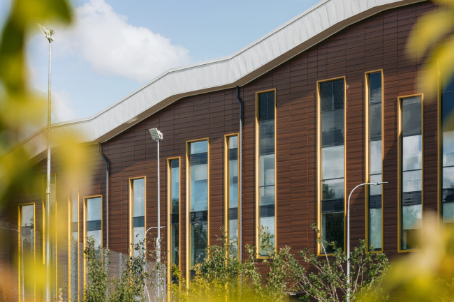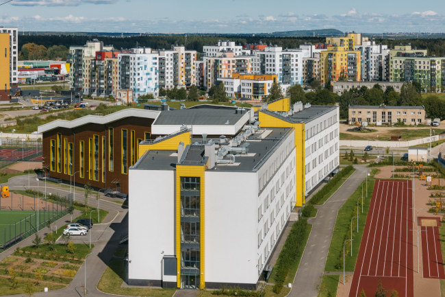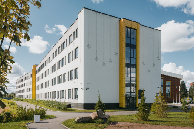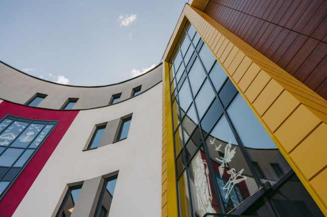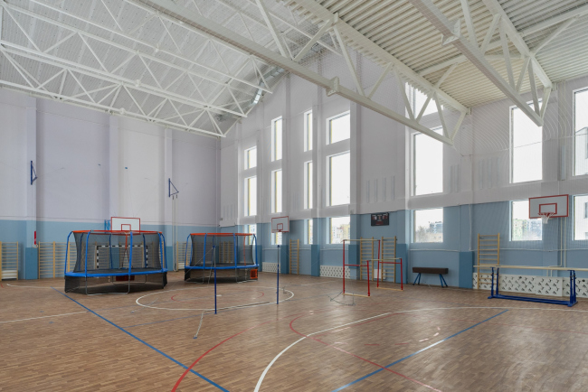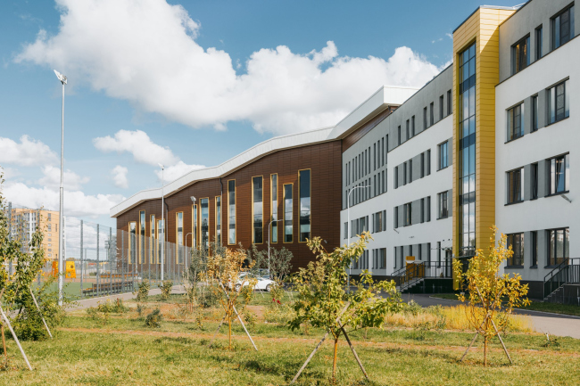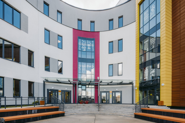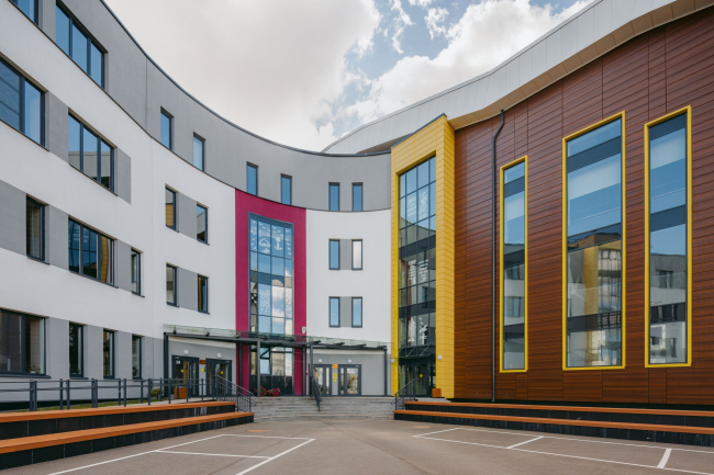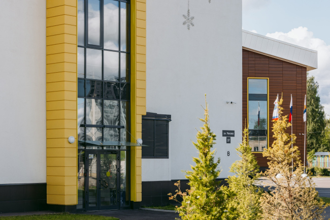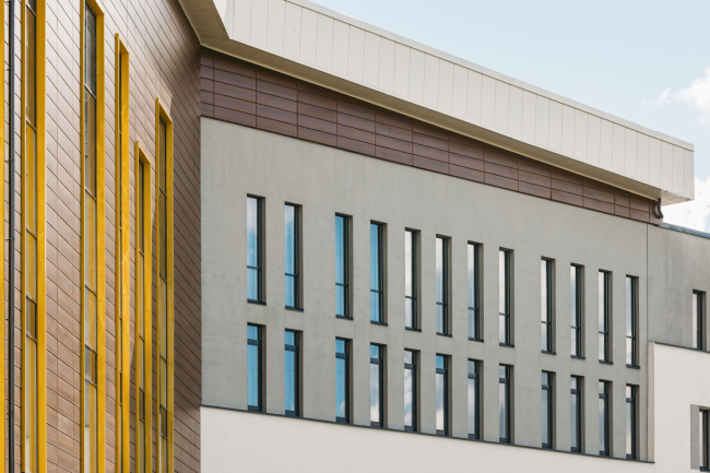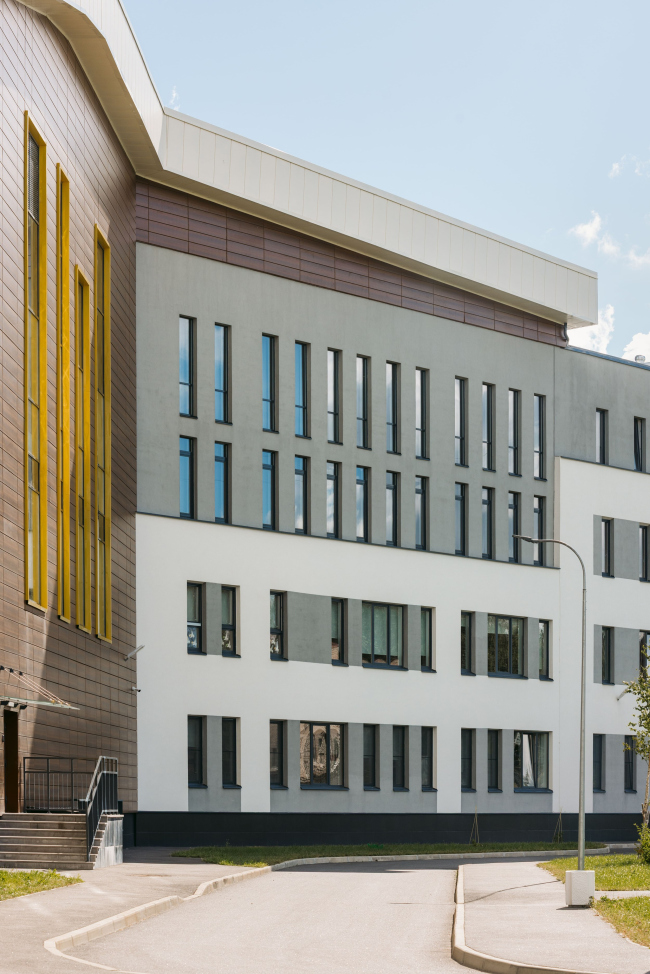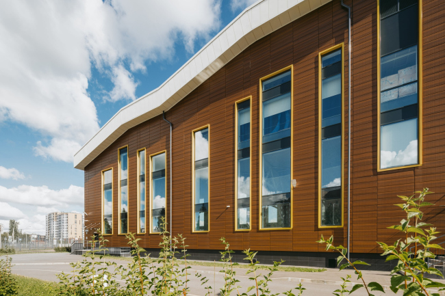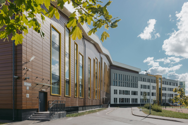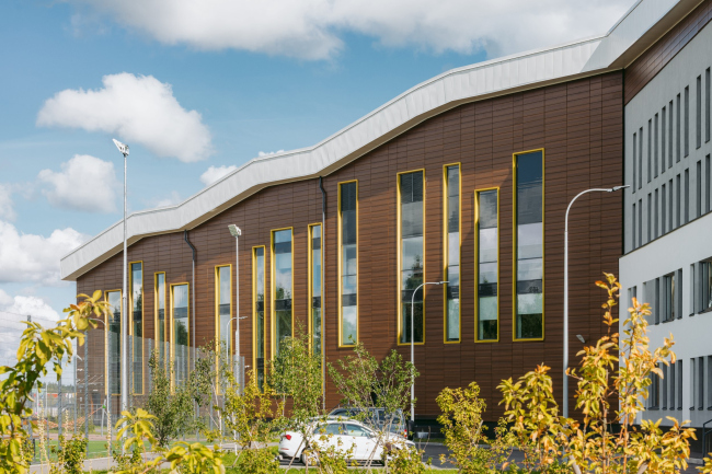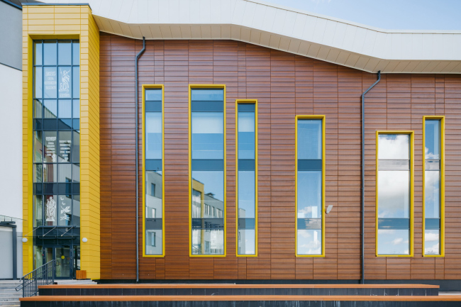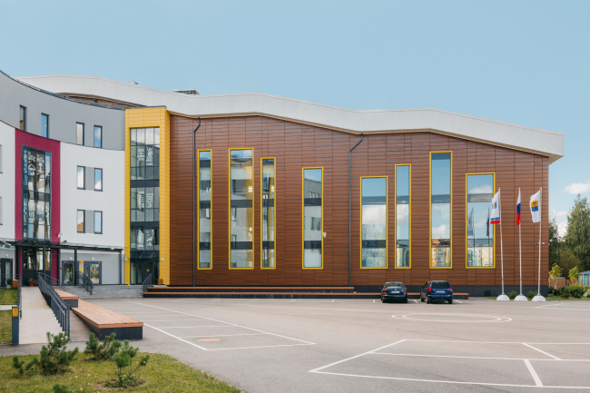 Особое внимание уделено спортивному залу. Его объем противопоставлен строгой геометрии основных корпусов: фасады облицованы кассетами с текстурой дерева и витражным остеклением, дополненным желтыми декоративными элементами. Ступенчатый силуэт кровли формирует пластичную композицию и добавляет легкости массивному объему.