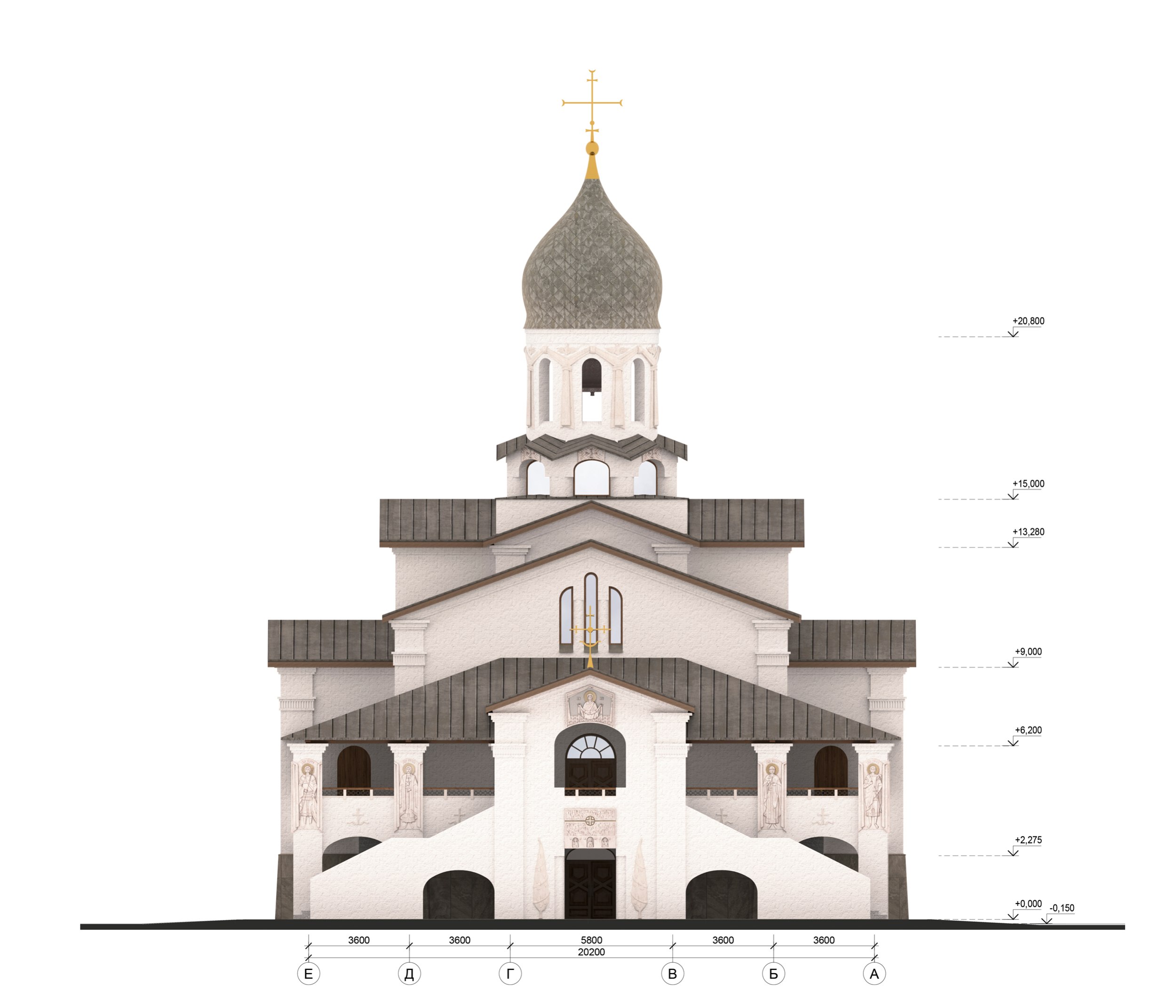 Архитектура храма решена аскетично, но в то же время отражает идею монументальности, отсылая к типологии храмов-памятников. Тектоника выстроена по строгой сетке и представляет собой выраженную каркасную структуру. Относительно оси запад–восток храм имеет симметричную композицию. На первом и втором уровнях спроектированы характерные для южных регионов открытые галереи.