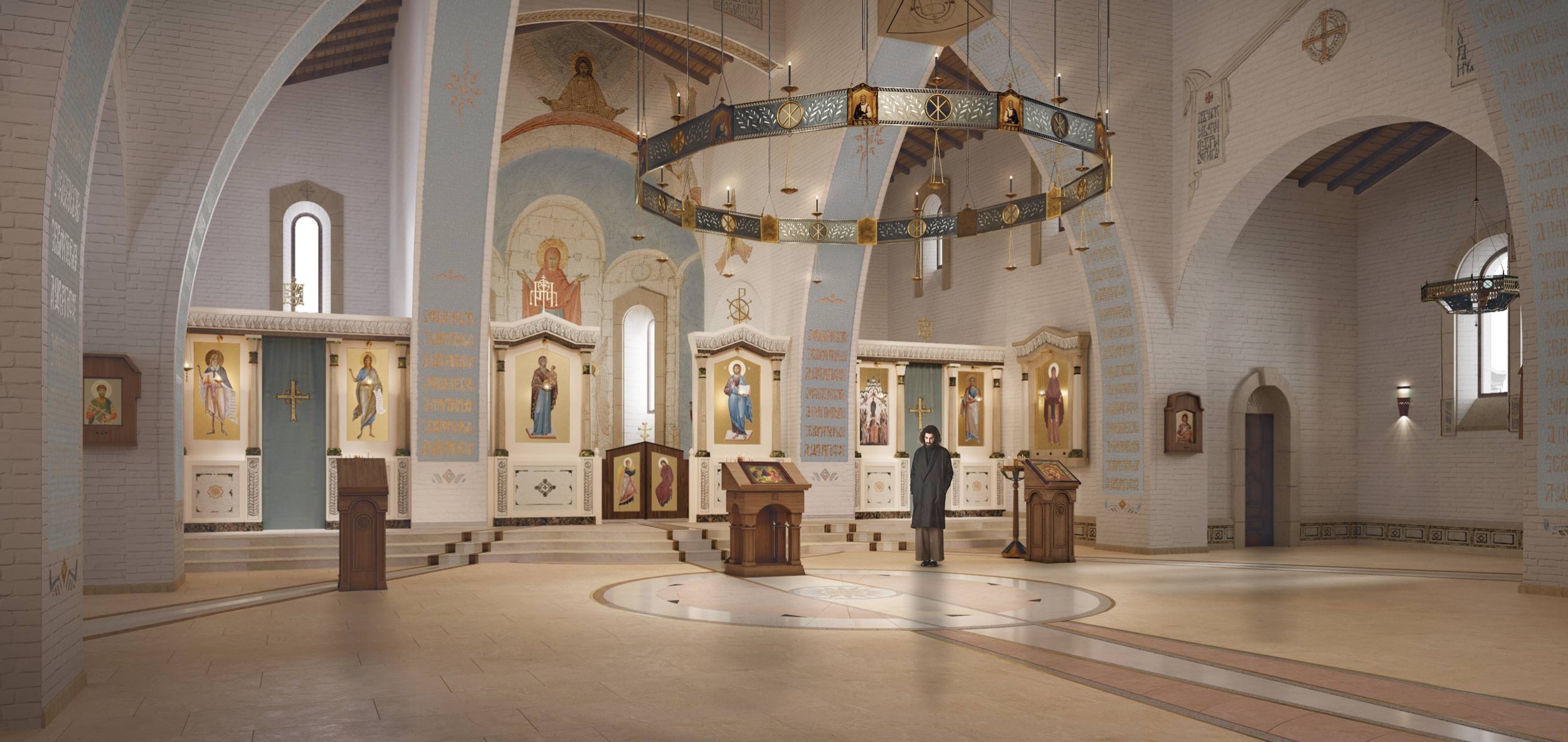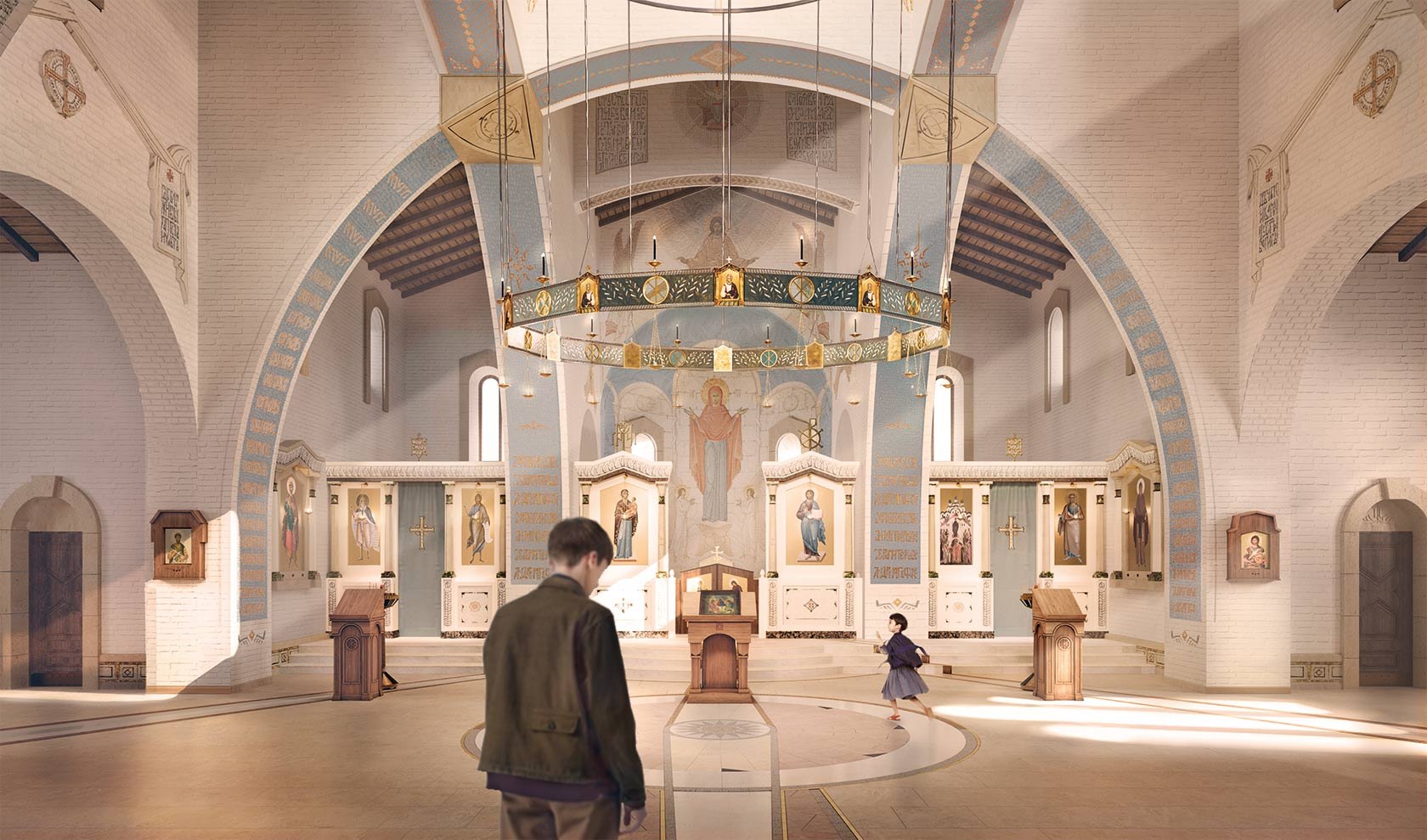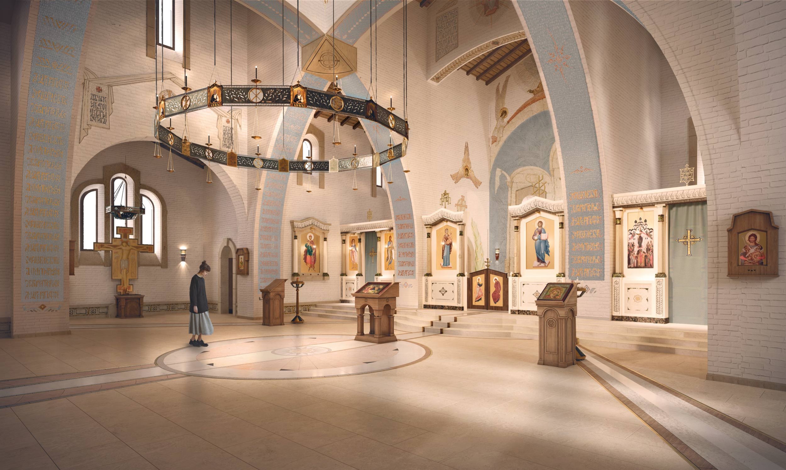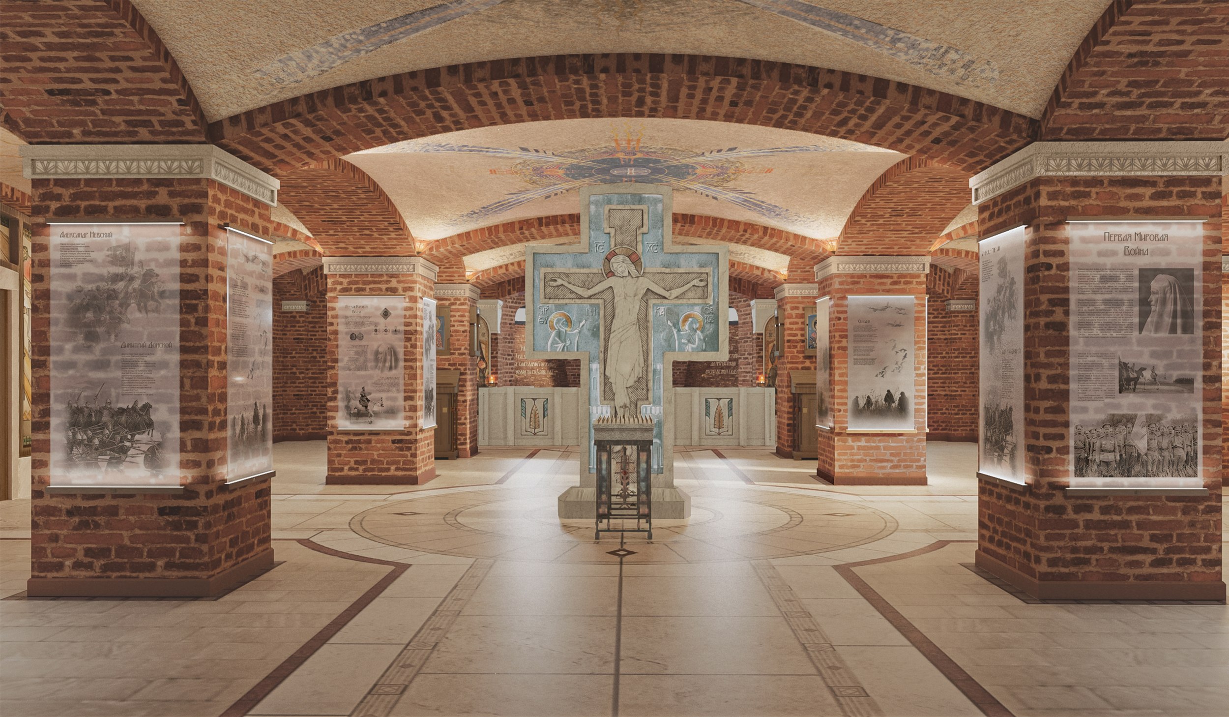 Нижний храм представляет собой мемориальное пространство. Одним из характерных типов захоронений данного региона являлись курганы, мотив которых нашел свое отражение на первом уровне храмового комплекса посредством поднятого на всю высоту каменного цоколя. Проемы в интерьере расположены непосредственно под линией сводов, создавая впечатление пространства, находящегося ниже уровня земли. Пространство будет разделено на сакральное (в восточной части) и экспозиционное (в боковых и западной частях).