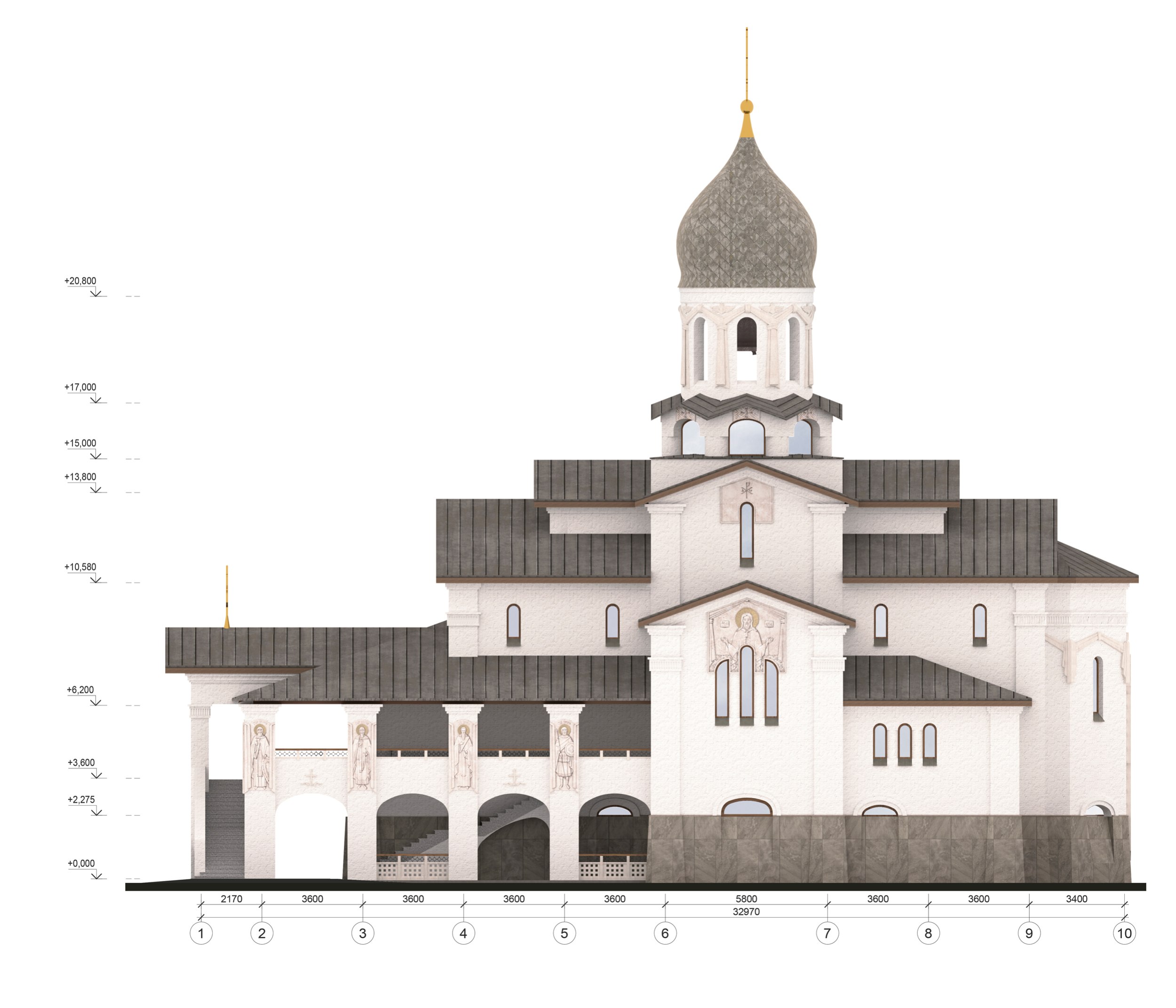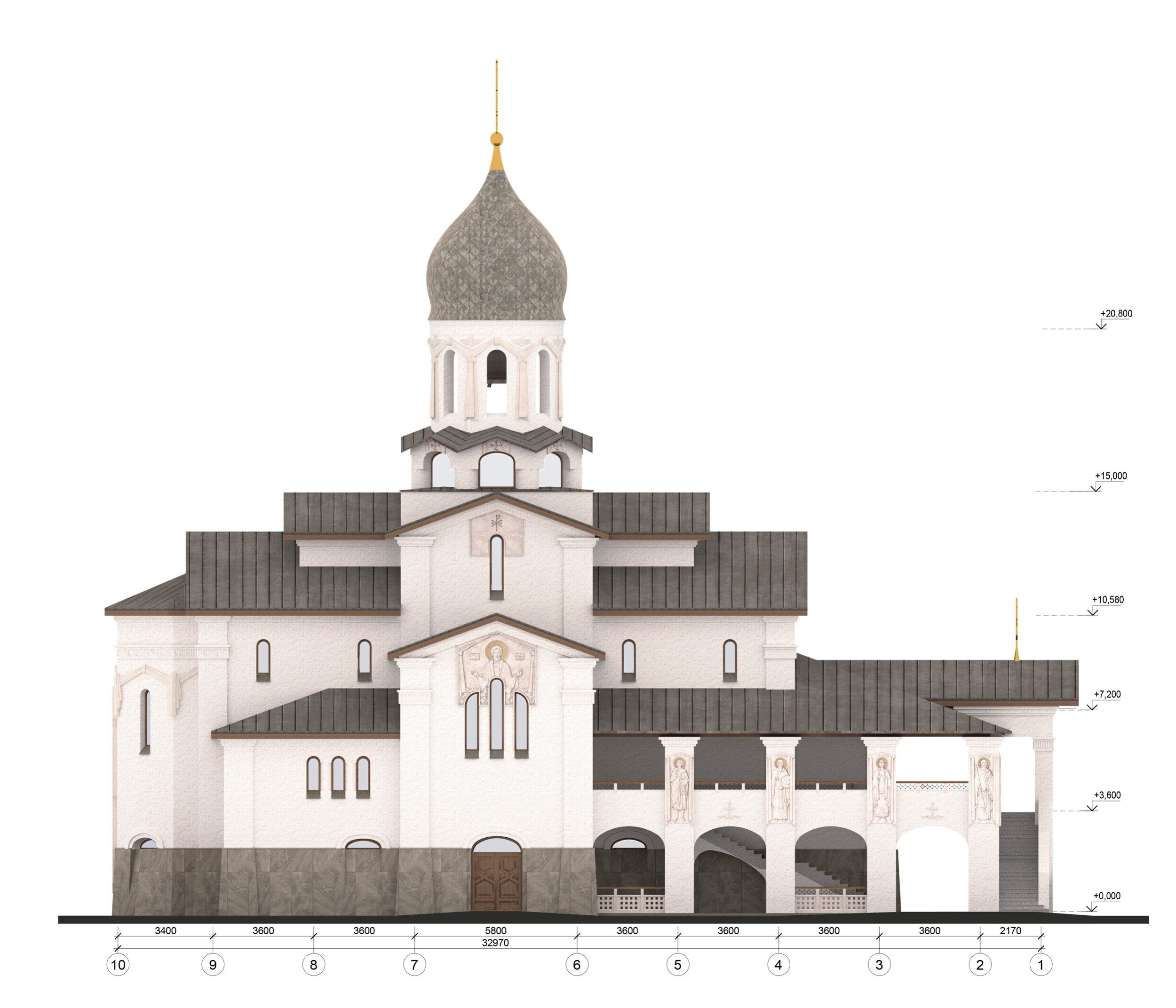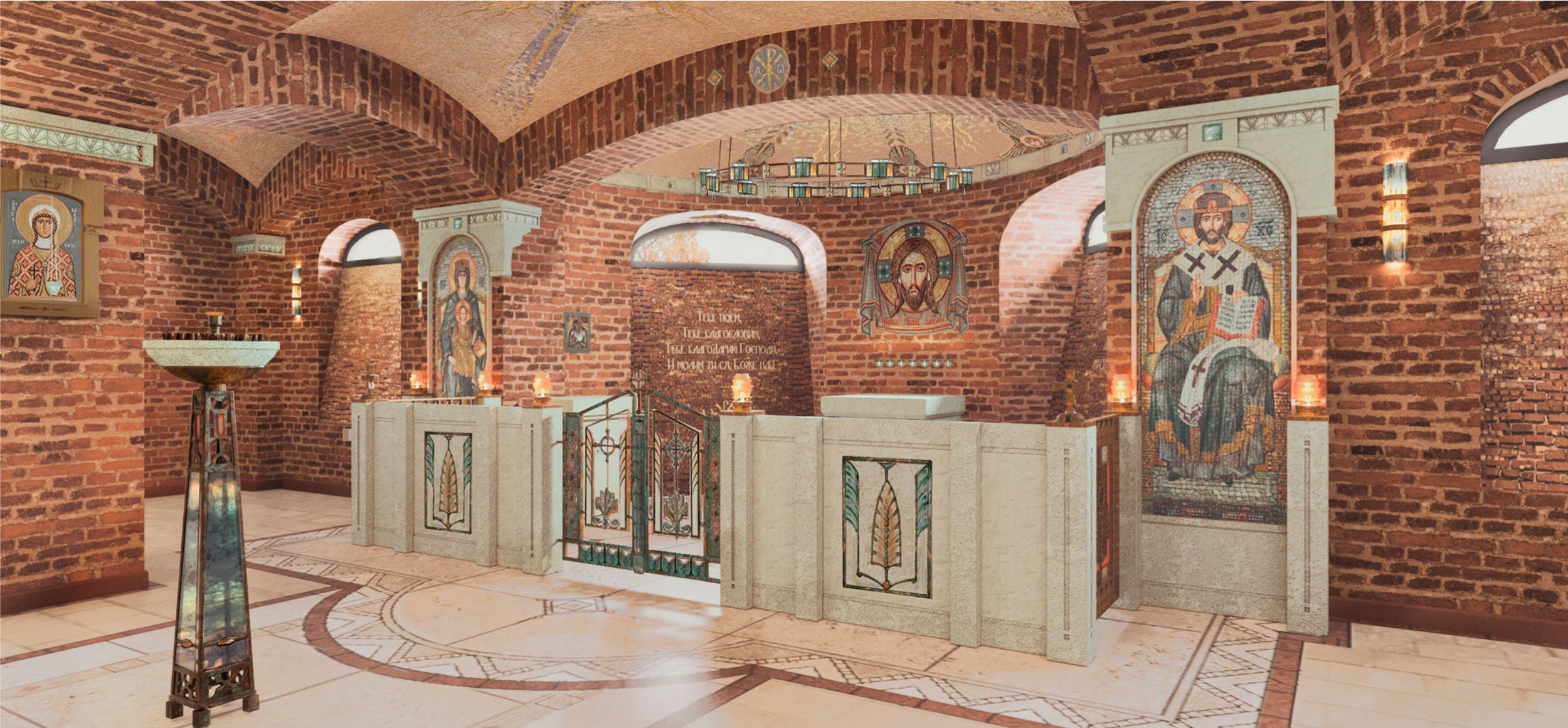 Нижний храм представляет собой мемориальное пространство. Одним из характерных типов захоронений данного региона являлись курганы, мотив которых нашел свое отражение на первом уровне храмового комплекса посредством поднятого на всю высоту каменного цоколя. Проемы в интерьере расположены непосредственно под линией сводов, создавая впечатление пространства, находящегося ниже уровня земли. Пространство будет разделено на сакральное (в восточной части) и экспозиционное (в боковых и западной частях).