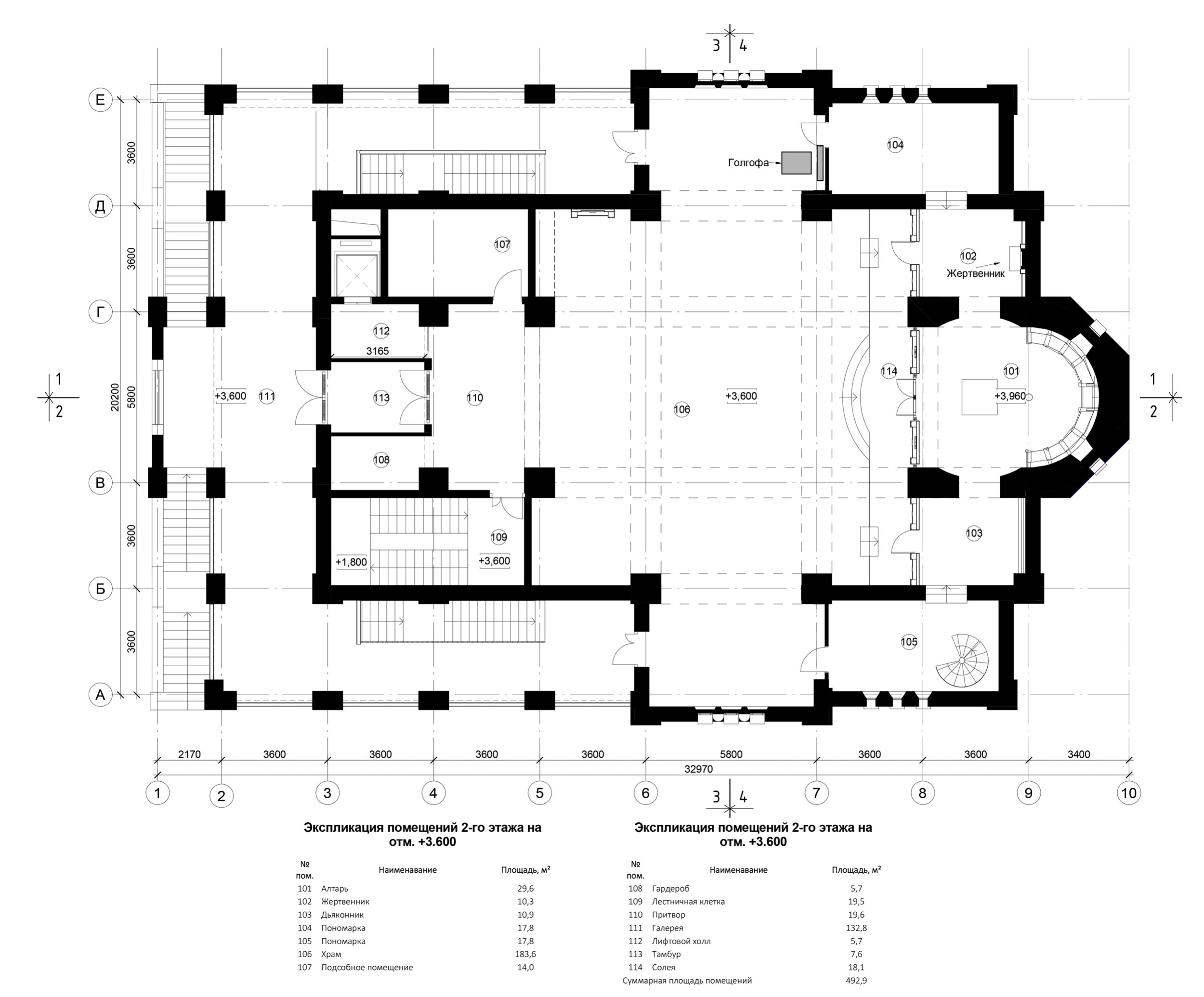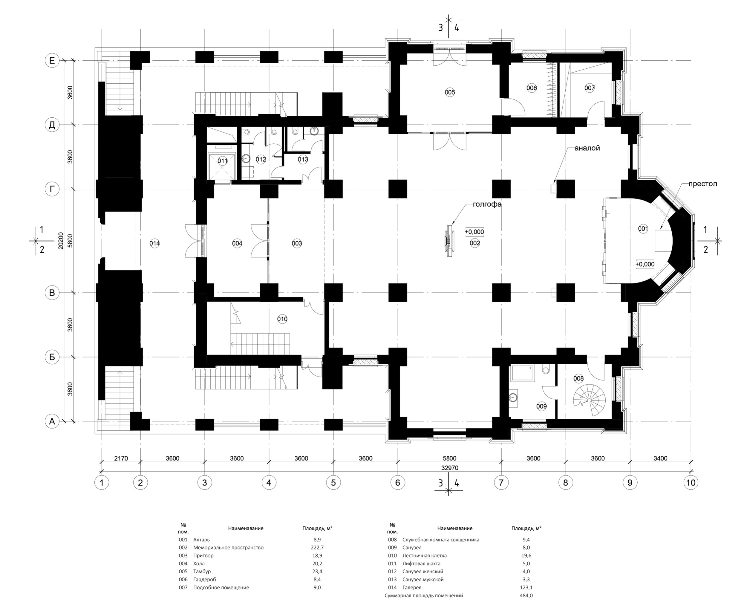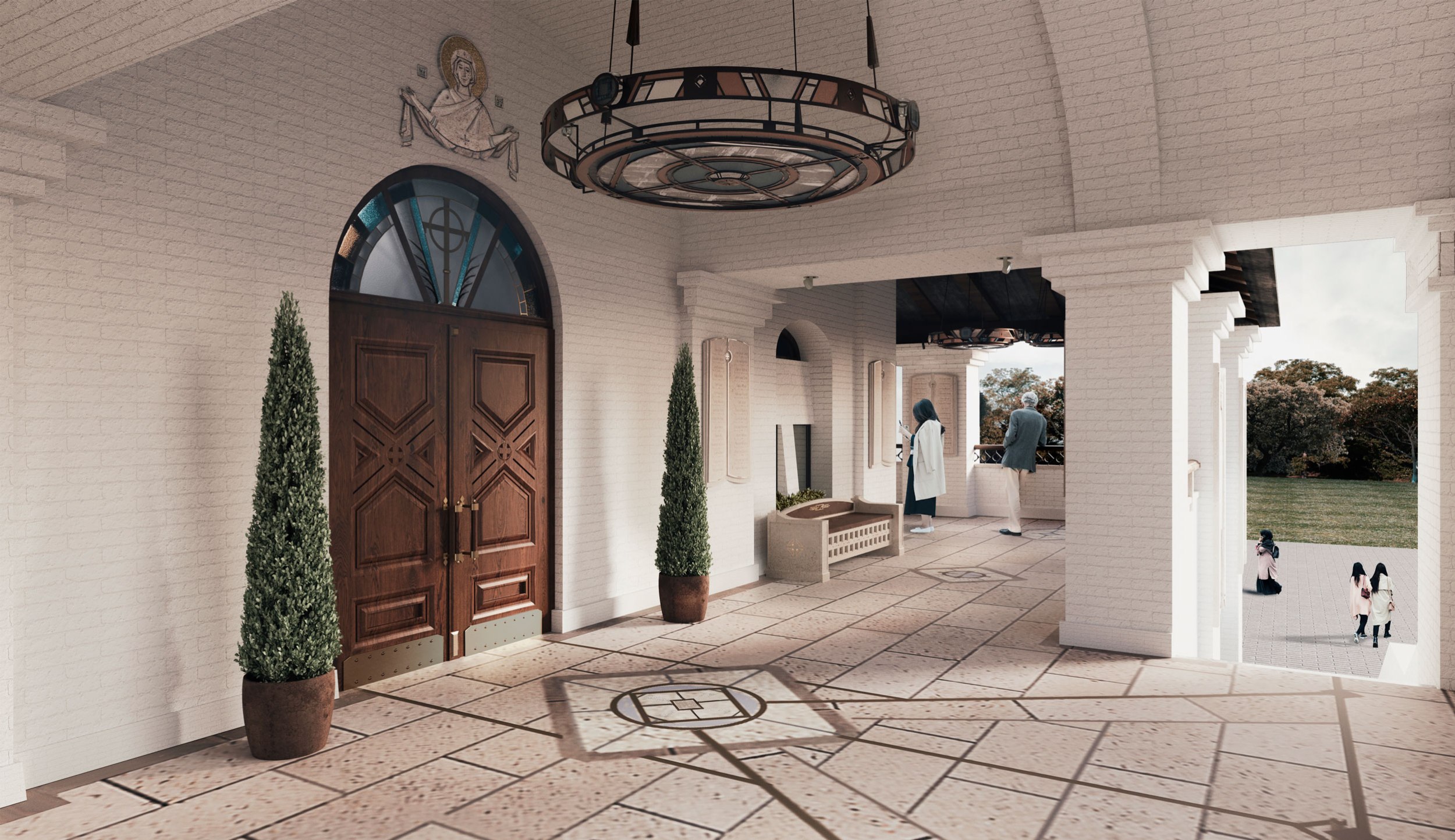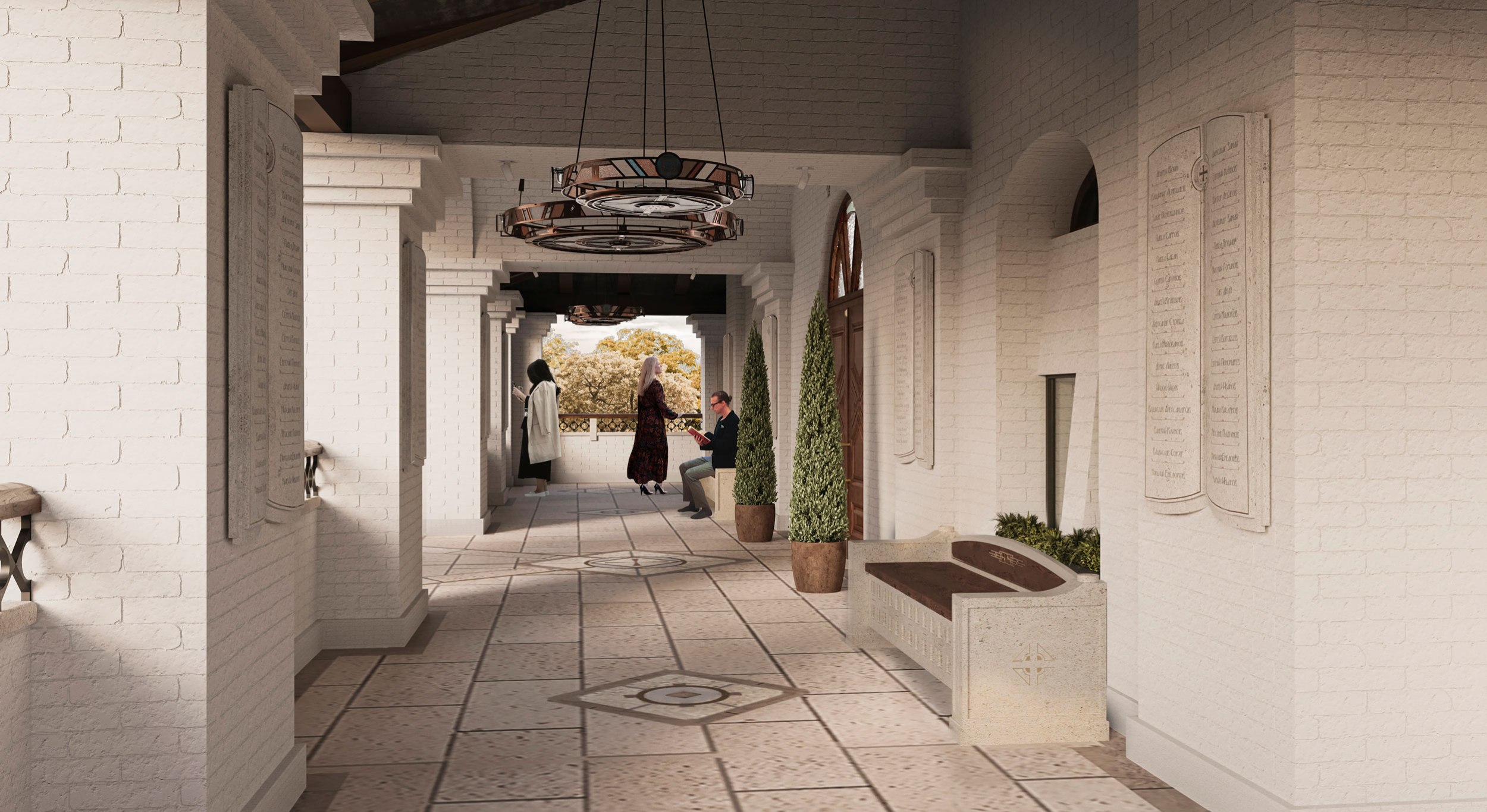 Нижний храм представляет собой мемориальное пространство. Одним из характерных типов захоронений данного региона являлись курганы, мотив которых нашел свое отражение на первом уровне храмового комплекса посредством поднятого на всю высоту каменного цоколя. Проемы в интерьере расположены непосредственно под линией сводов, создавая впечатление пространства, находящегося ниже уровня земли. Пространство будет разделено на сакральное (в восточной части) и экспозиционное (в боковых и западной частях).