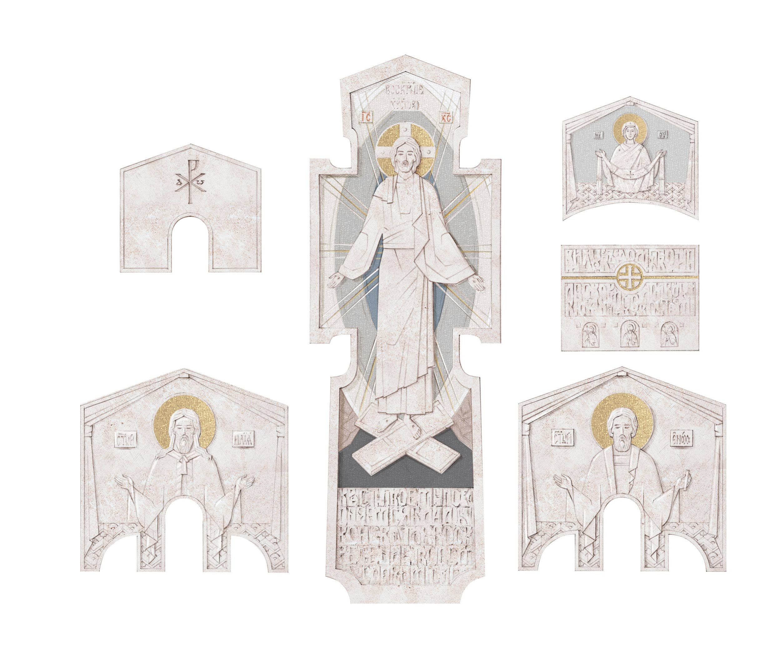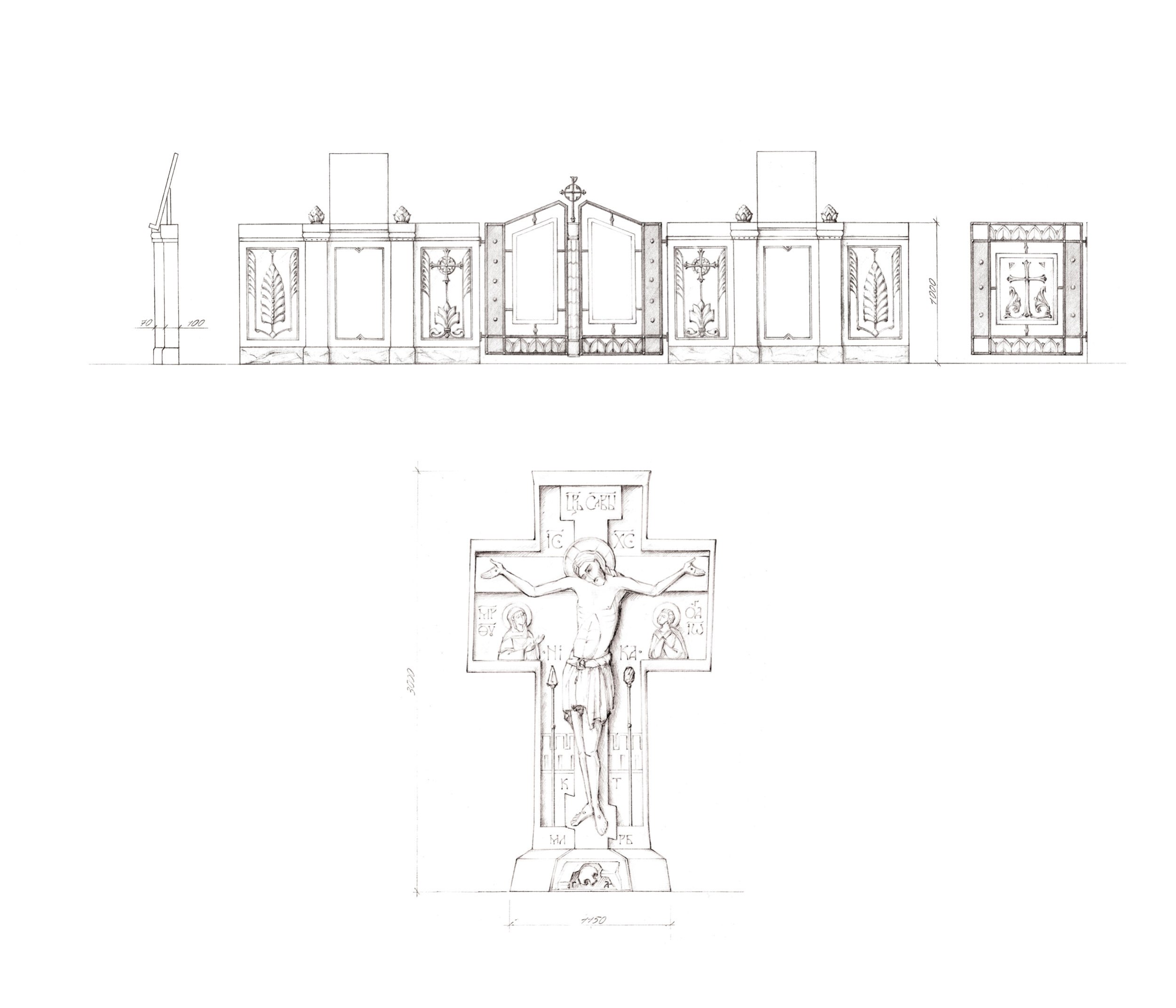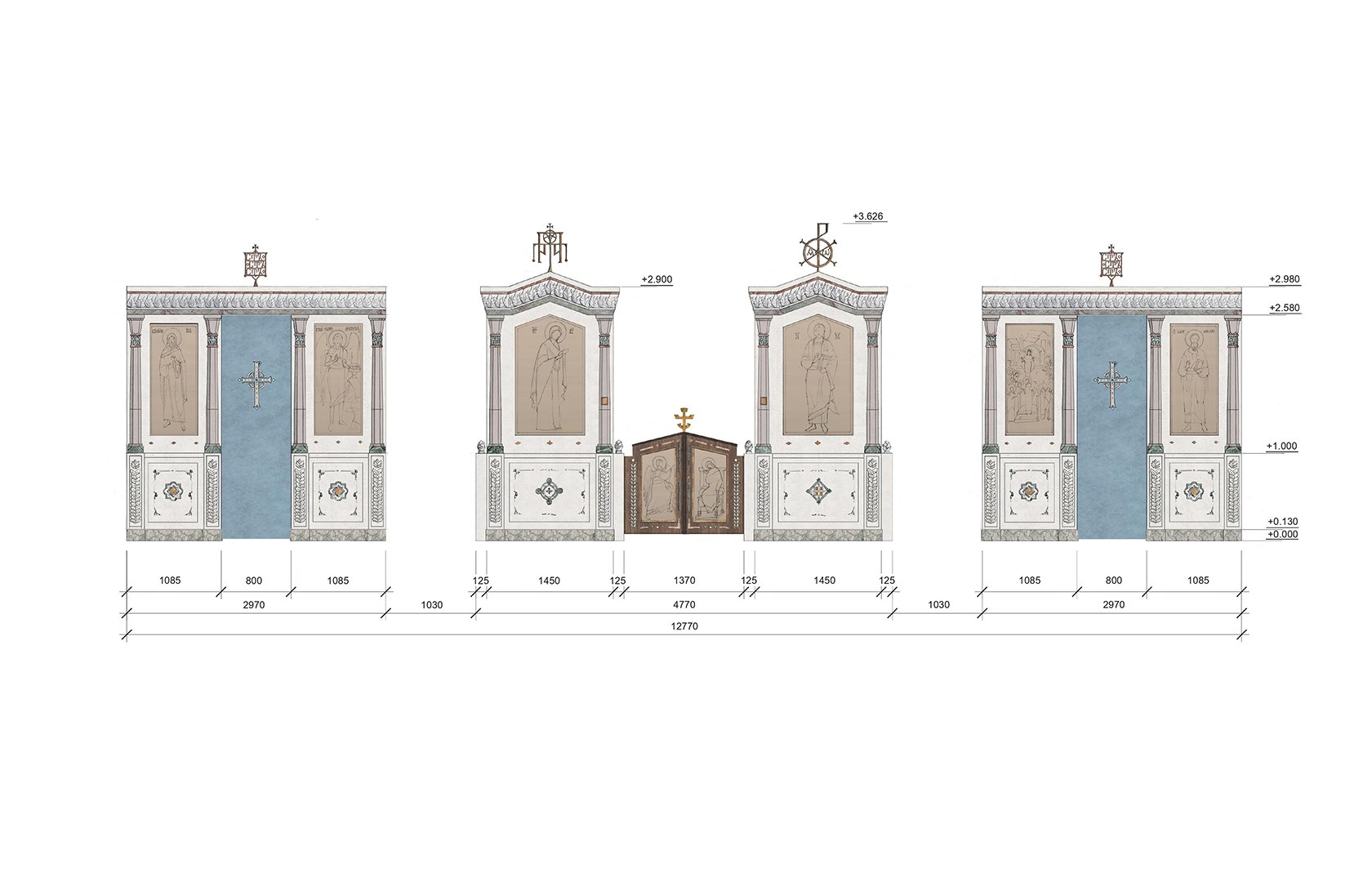 Иконостас центральной части представляет собой, по сути, два каменных киота, между которыми расположены Царские врата. Боковые части алтаря – жертвенник и диаконник (пономарка) – более закрыты и имеют сверху архитрав; диаконские врата оформлены как завесы, цвет которых перекликается с мозаиками. На западной стене – сцены Рождества и Успения Богородицы.