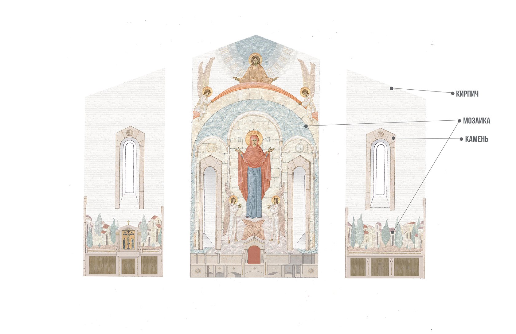 Центром композиции является образ Богородицы в алтарной апсиде, всегда открытый взору благодаря отсутствию катапетасмы. Мозаики по сторонам жертвенника отсылают к явлению Богородицы во Влахернской церкви, где Она распростерла Свой Покров над народом.