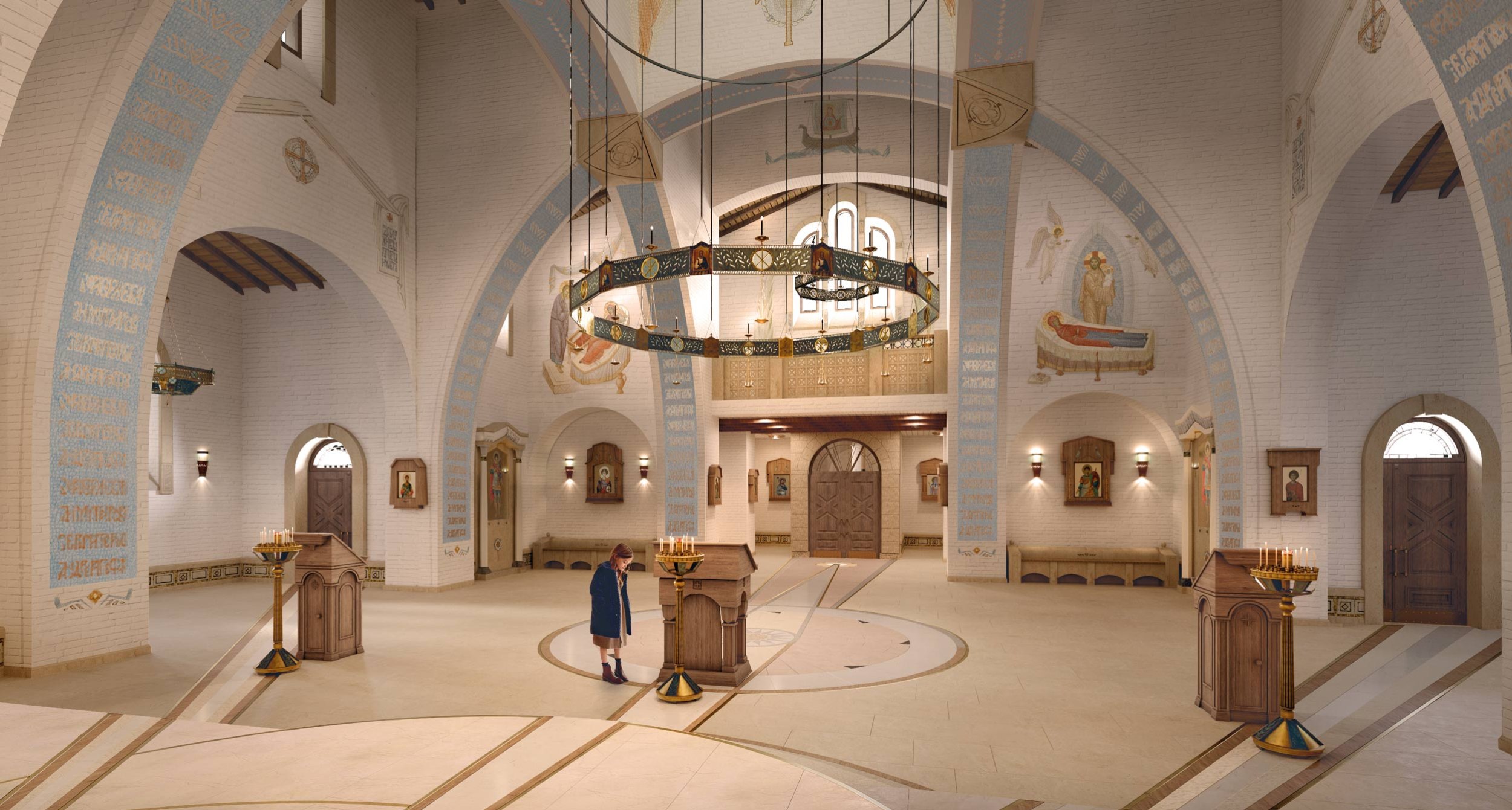 Интерьер верхнего храма посвящен Покрову Пресвятой Богородицы: бело-голубая гамма и пространственная композиция отражают образ Покрова.