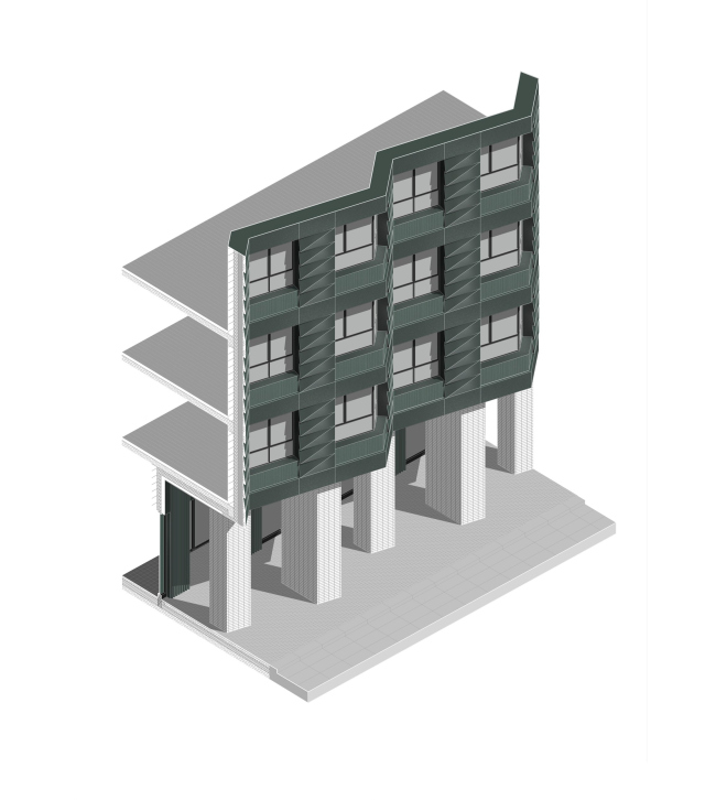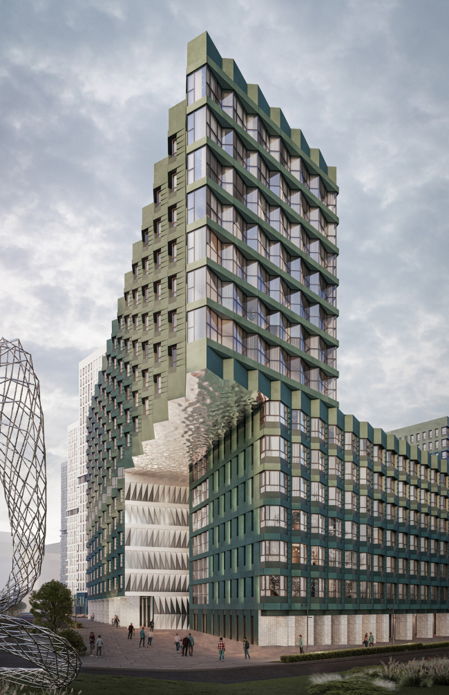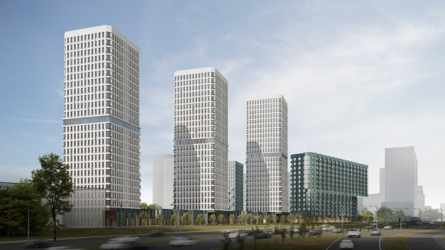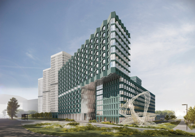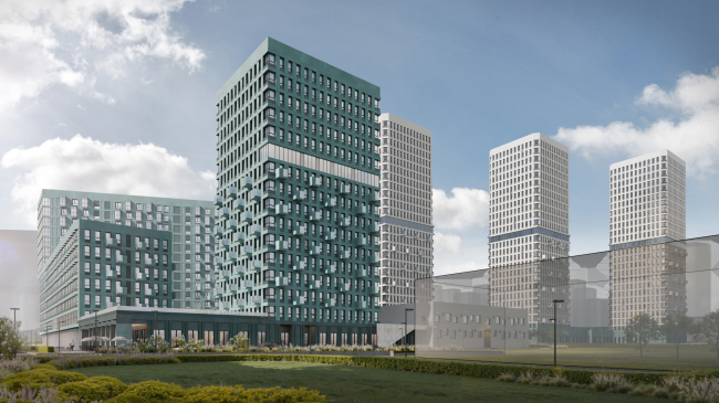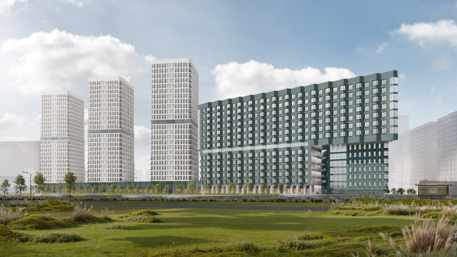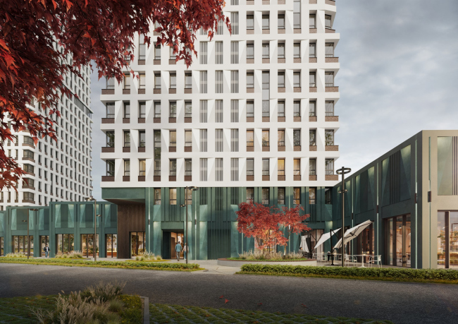 На эксплуатируемой кровле подземной автостоянки размещается благоустройство: площадки для отдыха взрослых, игры детей дошкольного и школьного возраста, спортивные зоны и озеленение. Вход на уровень благоустройства осуществляется непосредственно из подъездов жилых секций. Практически весь периметр участка сформирован встроенно-пристроенными помещениями, что обеспечивает естественное разделение общественной и частной зон, отвечая современным тенденциям формирования устойчивой и комфортной городской среды.