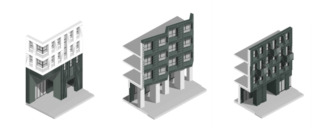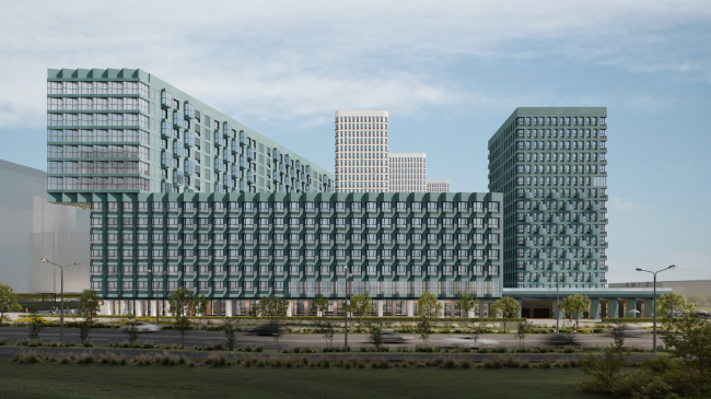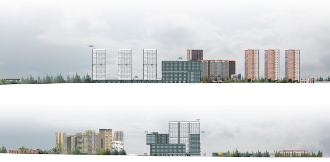 Застройка визуально разделена на две сопоставимые по масштабу части: блок из шести разновысотных секций в западной части участка и группу из трёх высотных секций в восточной части. Секции располагаются с понижением этажности в сторону ул. Назиба Жиганова.