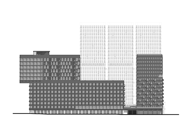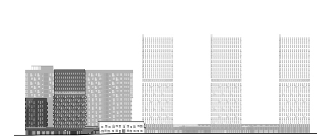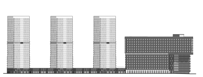 Застройка участка представляет собой группу из девяти жилых секций переменной этажности (от 8 до 25 этажей), объединённых одноэтажными надземными пристройками коммерческого назначения. С южной стороны застройки, в секции №1, предусмотрен встроенно-пристроенный детский сад в два этажа.