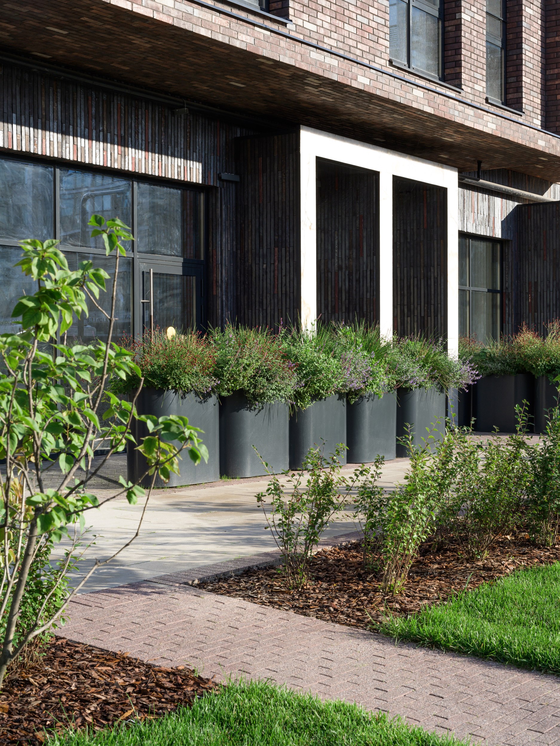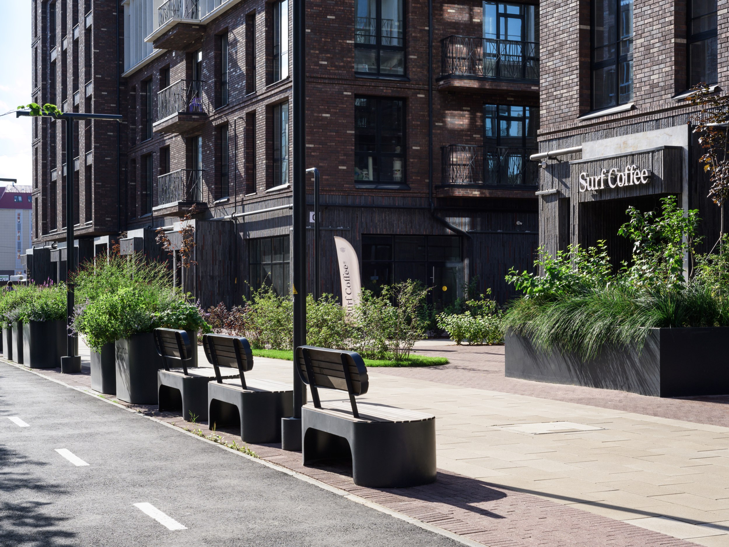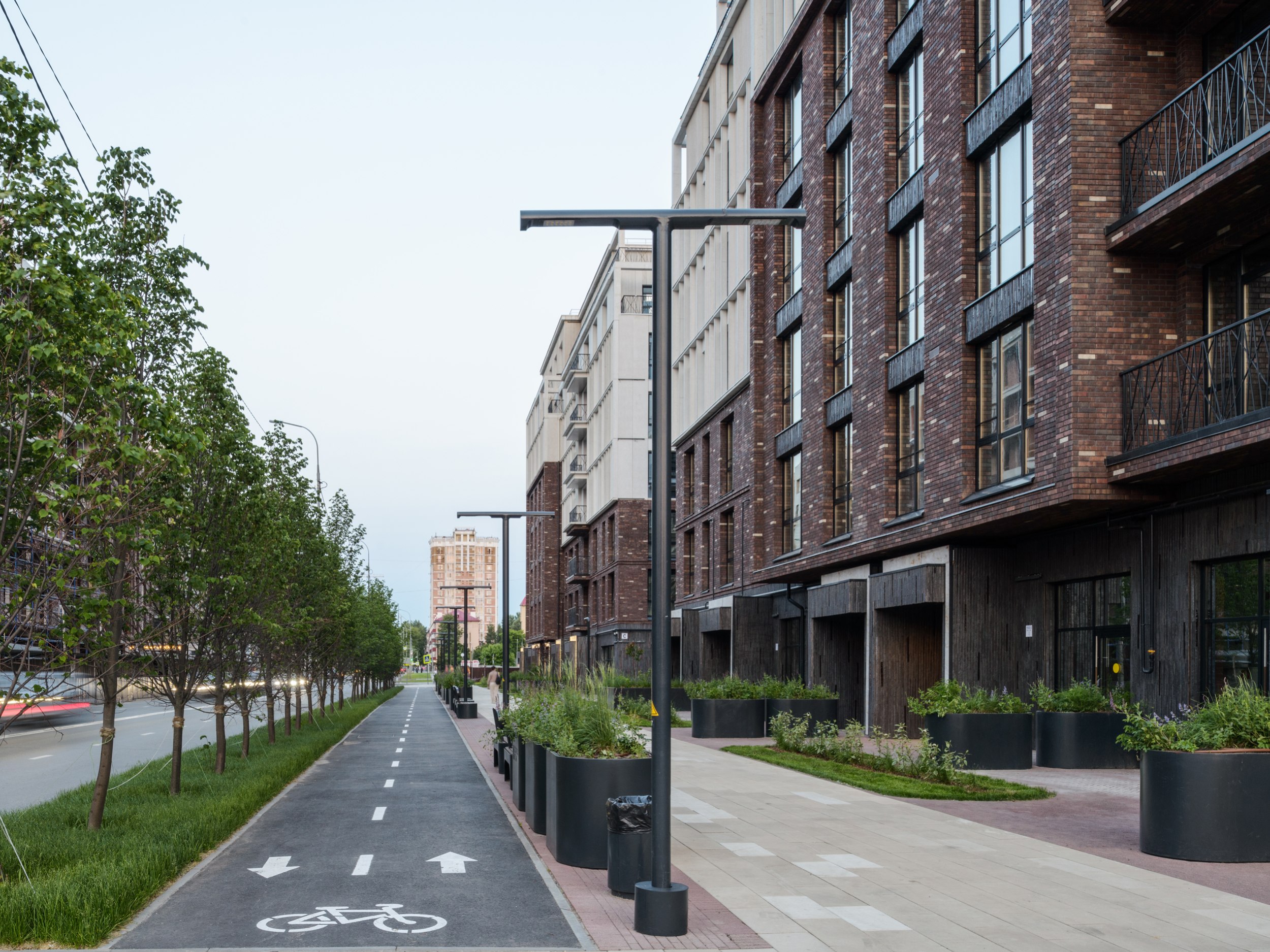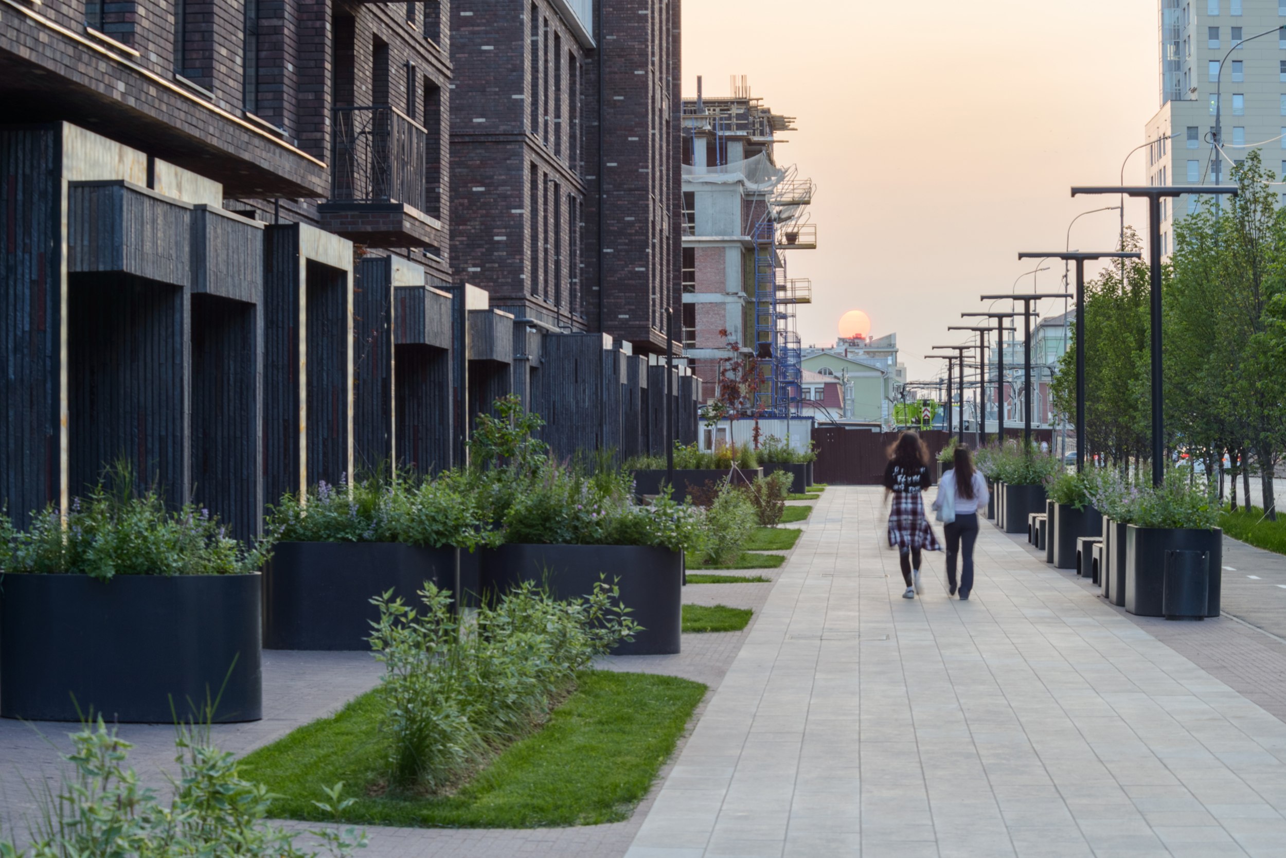 В сервисных зонах вдоль жилого комплекса сформированы уютные зелёные кулуары. Для вертикального озеленения вдоль улиц и проездов высажены деревья высотой около четырёх метров – клён сахаристый и липа мелколистная. Вдоль уличных кафе и боковых проездов появились ирга Ламарка и сирень обыкновенная. Такое разнообразие создаёт не только функциональное зонирование, но и меняющийся декоративный облик территории в зависимости от сезона.