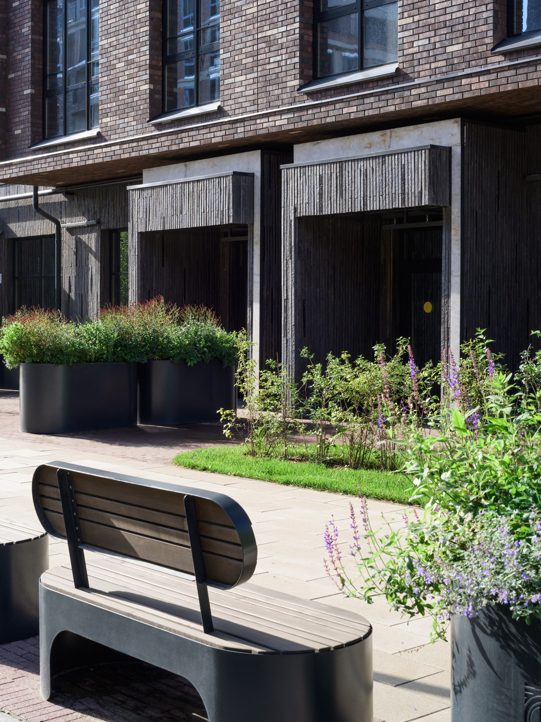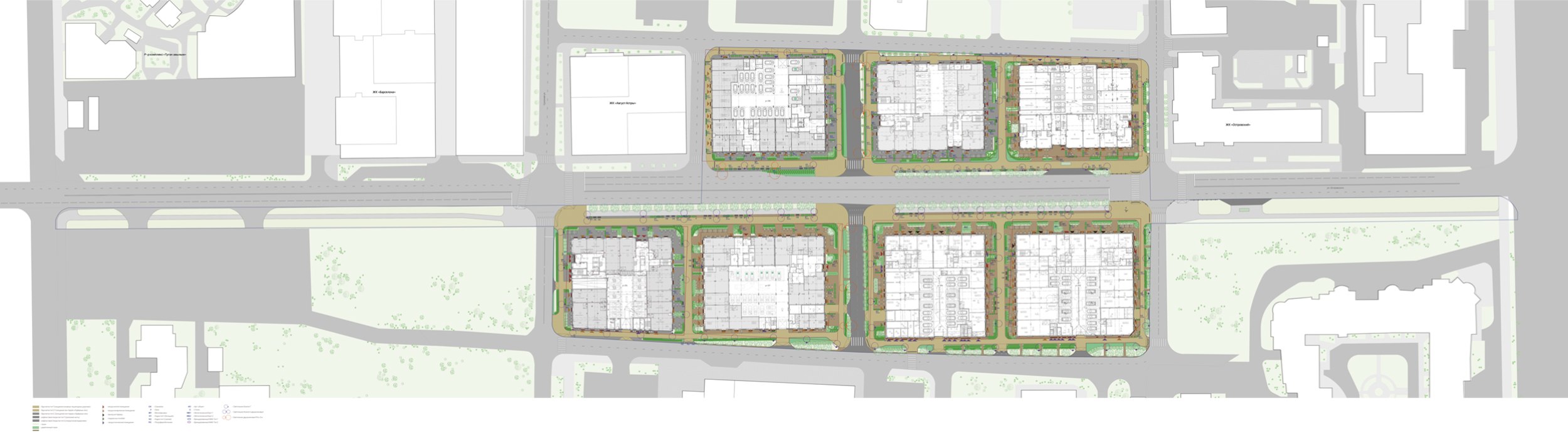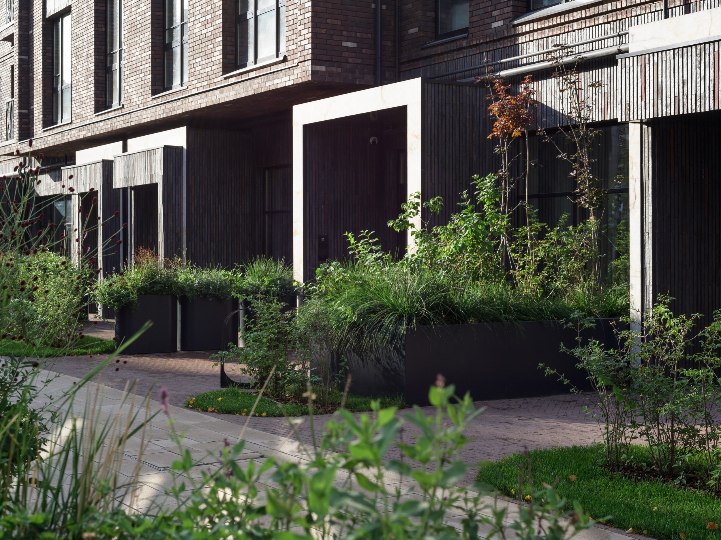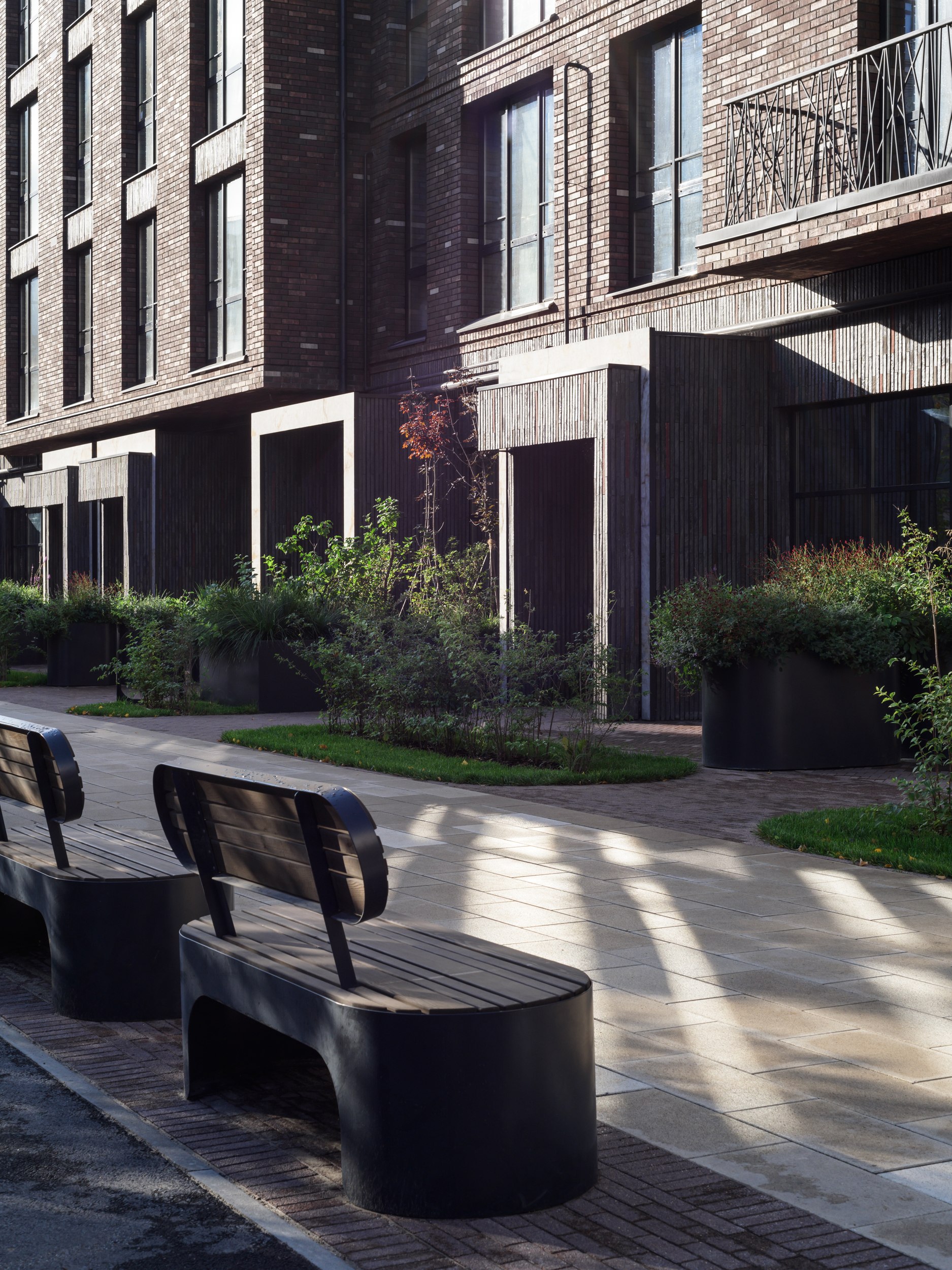 В сервисных зонах вдоль жилого комплекса сформированы уютные зелёные кулуары. Для вертикального озеленения вдоль улиц и проездов высажены деревья высотой около четырёх метров – клён сахаристый и липа мелколистная. Вдоль уличных кафе и боковых проездов появились ирга Ламарка и сирень обыкновенная. Такое разнообразие создаёт не только функциональное зонирование, но и меняющийся декоративный облик территории в зависимости от сезона.