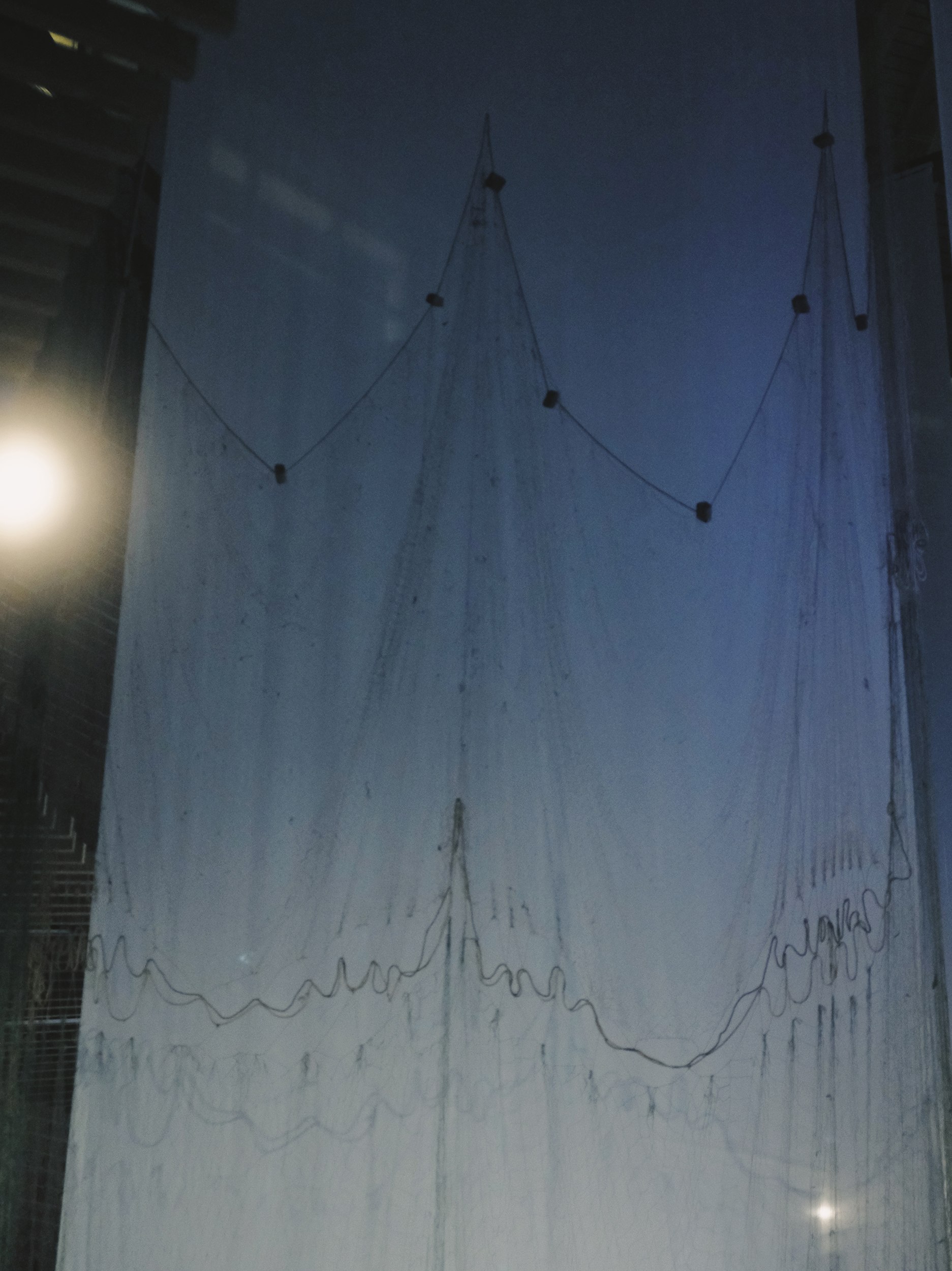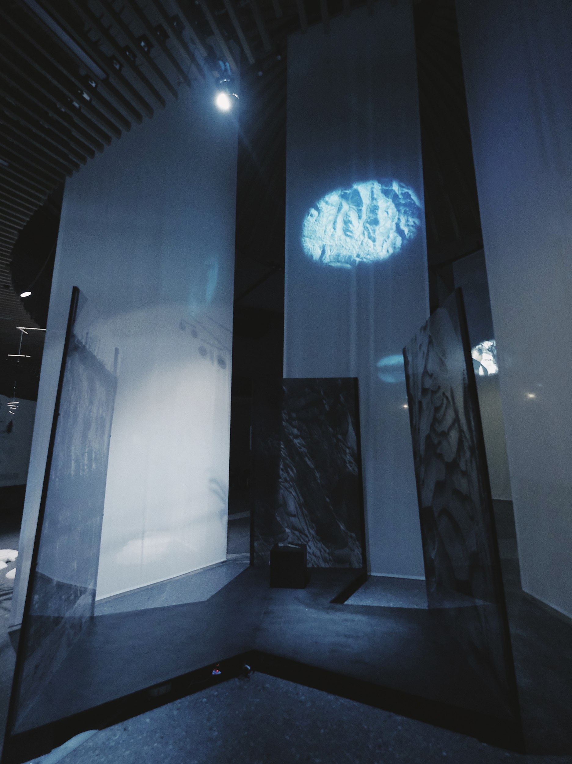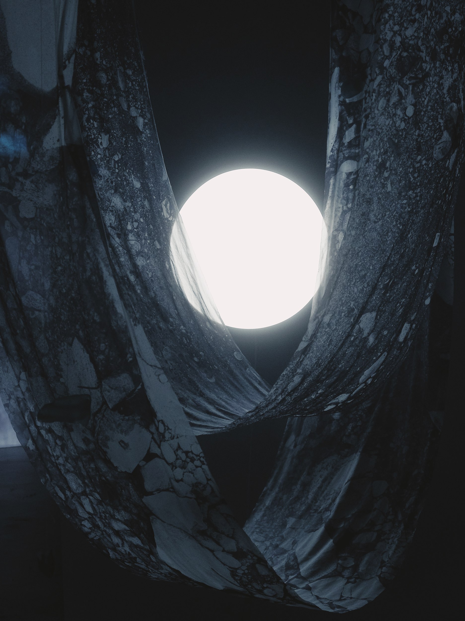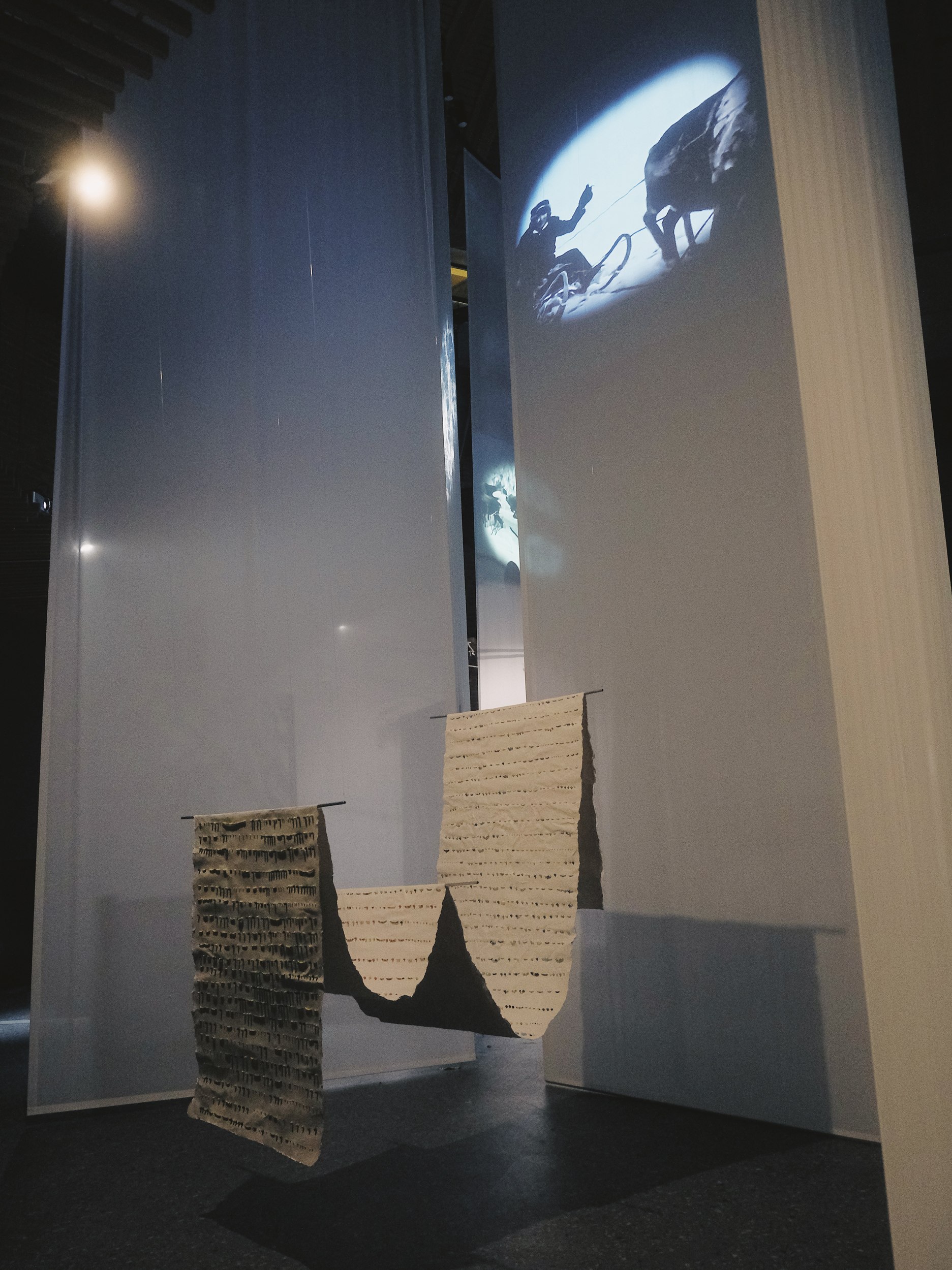 Днём и вечером мы наблюдали за дыханием развивающихся тканей и слушали медитации под глухой треск таяния льда, записанный одним из художников на диктофон. Маршрут осмотра экспозиции был задан по окружности, через последовательность семи секторов, но мог быть изменён зрителем в любой момент. Путь превращался в хождение по случайной траектории, созвучной колебаниям воздуха, которым следовали сами ткани. Эти грациозные белые полотна, свисающие с конструкции металлической рампы на высоте восьми метров, стали ещё одним элементом выставки, выразив кураторскую концепцию языком архитектурного образа.