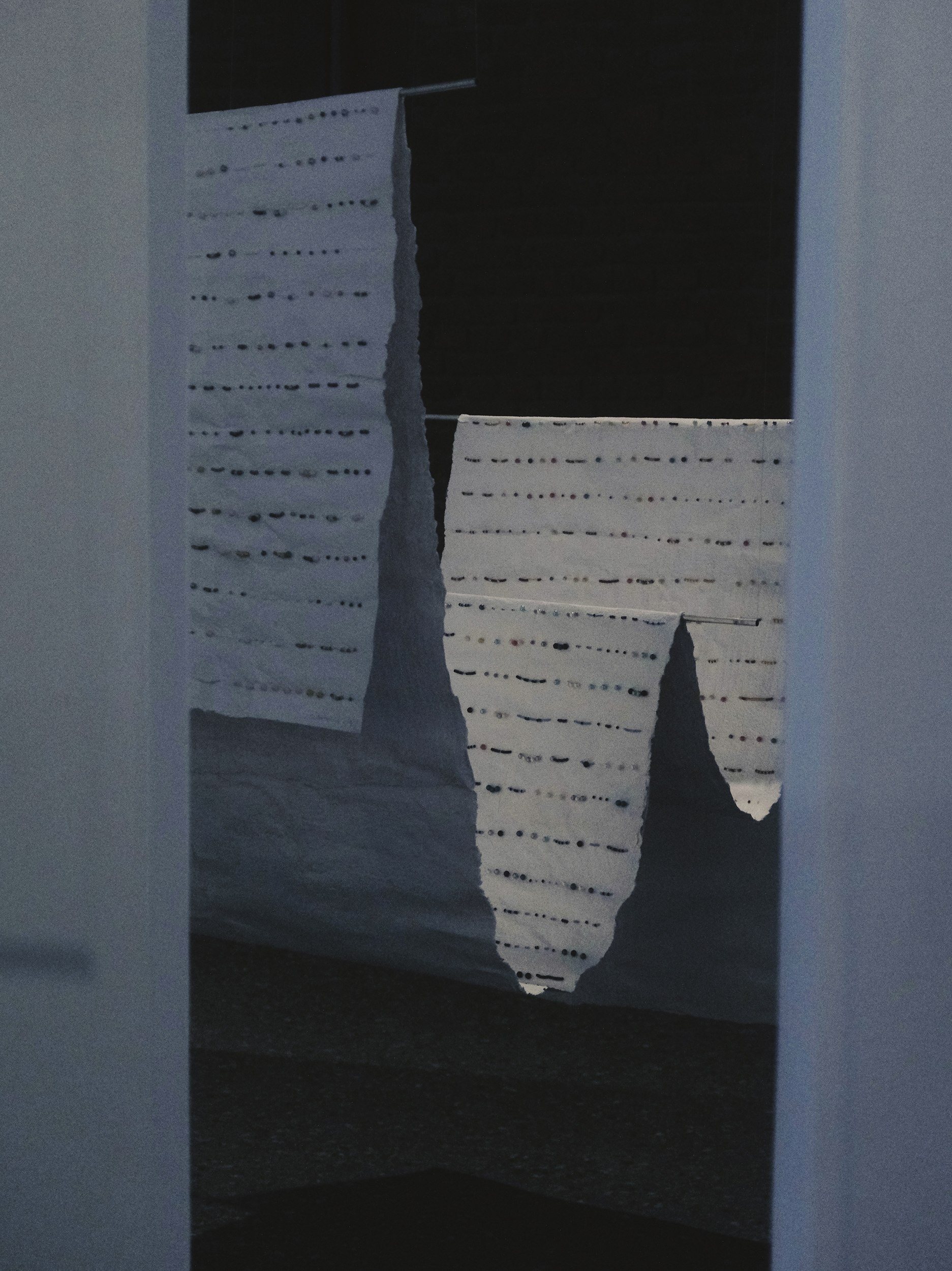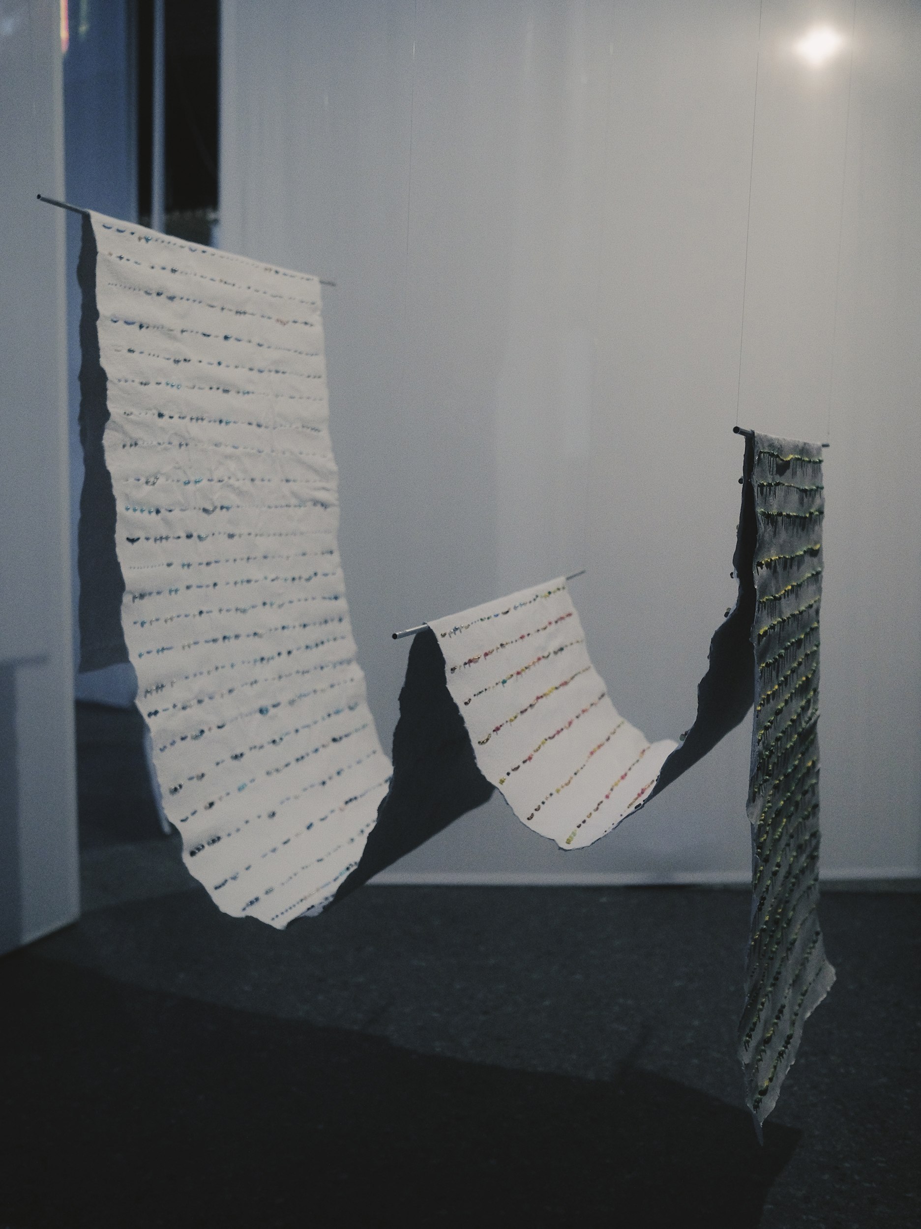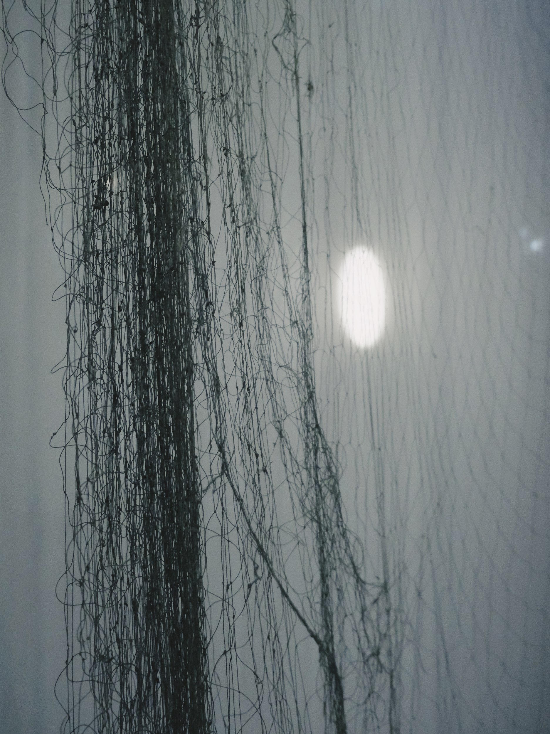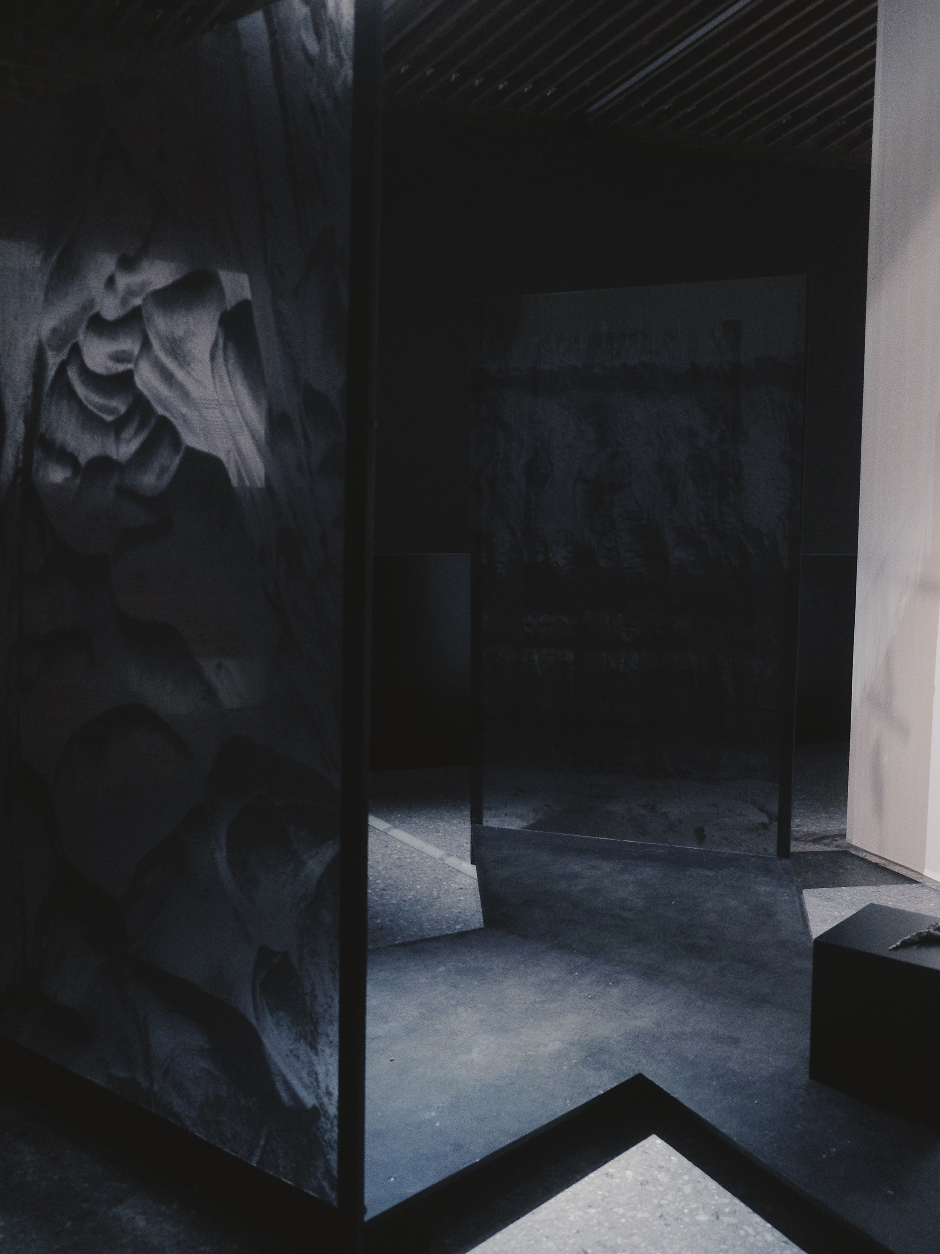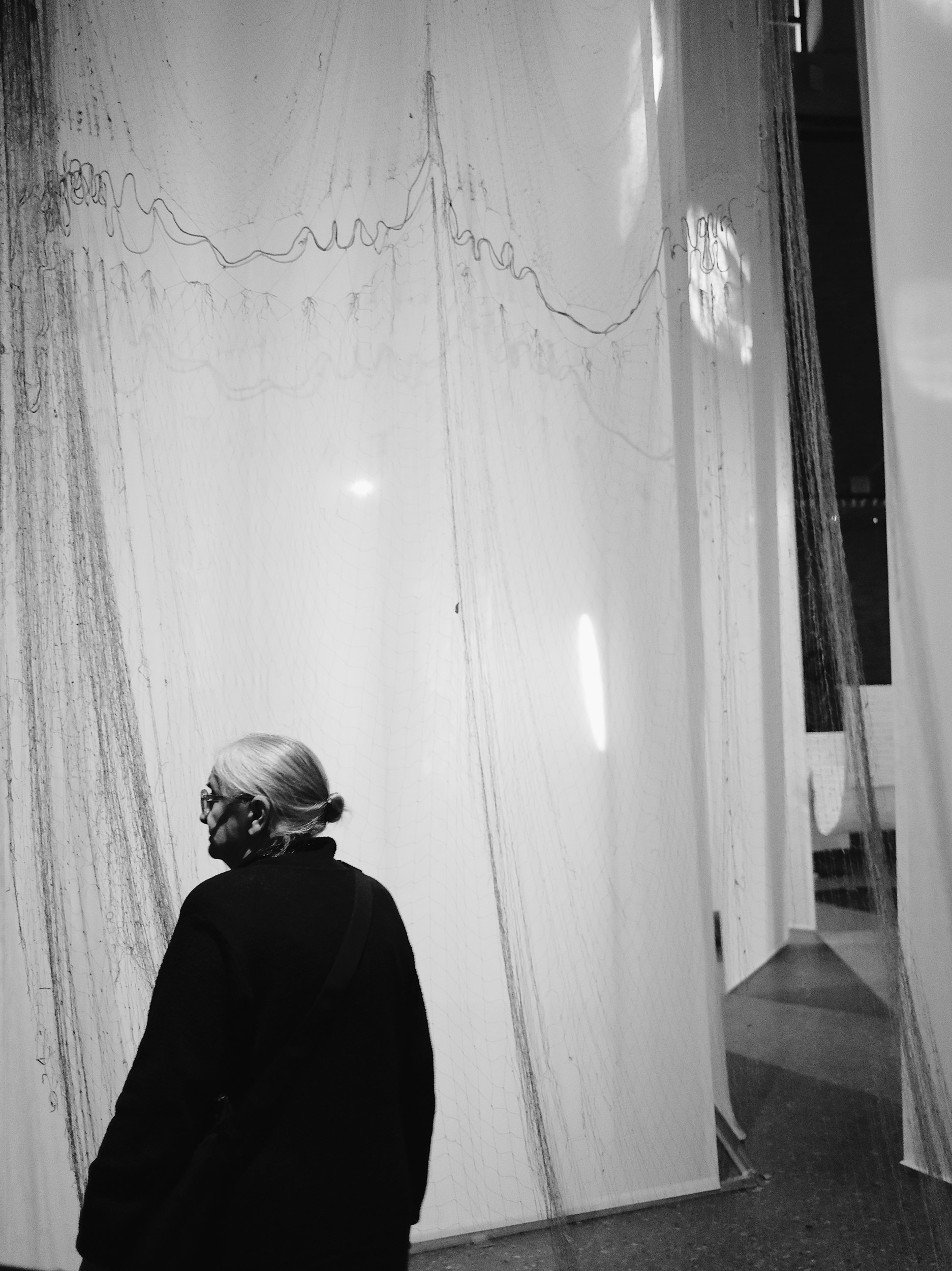 Днём и вечером мы наблюдали за дыханием развивающихся тканей и слушали медитации под глухой треск таяния льда, записанный одним из художников на диктофон. Маршрут осмотра экспозиции был задан по окружности, через последовательность семи секторов, но мог быть изменён зрителем в любой момент. Путь превращался в хождение по случайной траектории, созвучной колебаниям воздуха, которым следовали сами ткани. Эти грациозные белые полотна, свисающие с конструкции металлической рампы на высоте восьми метров, стали ещё одним элементом выставки, выразив кураторскую концепцию языком архитектурного образа.