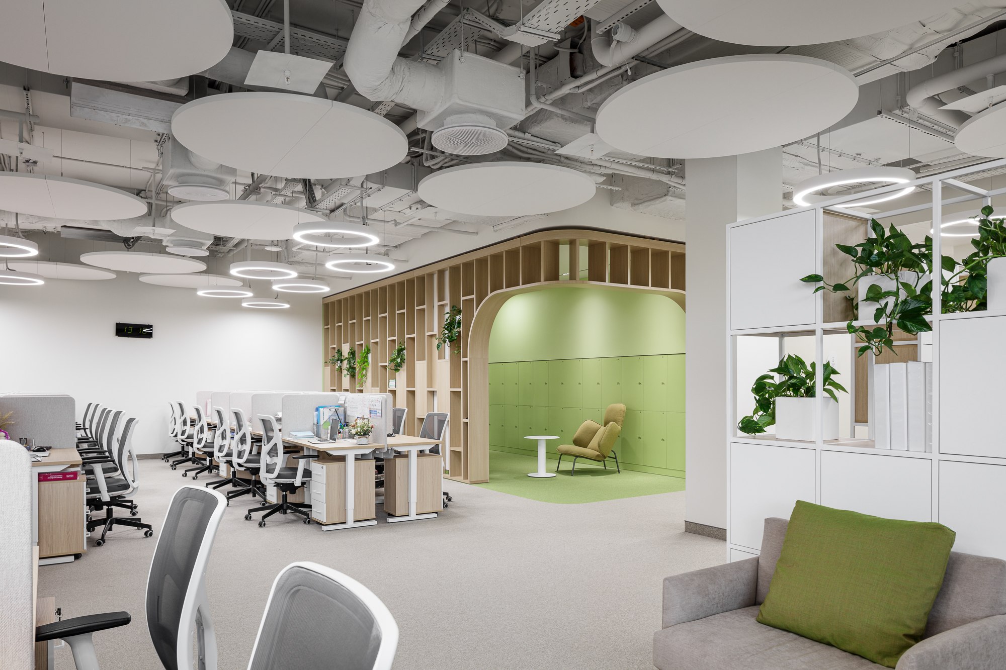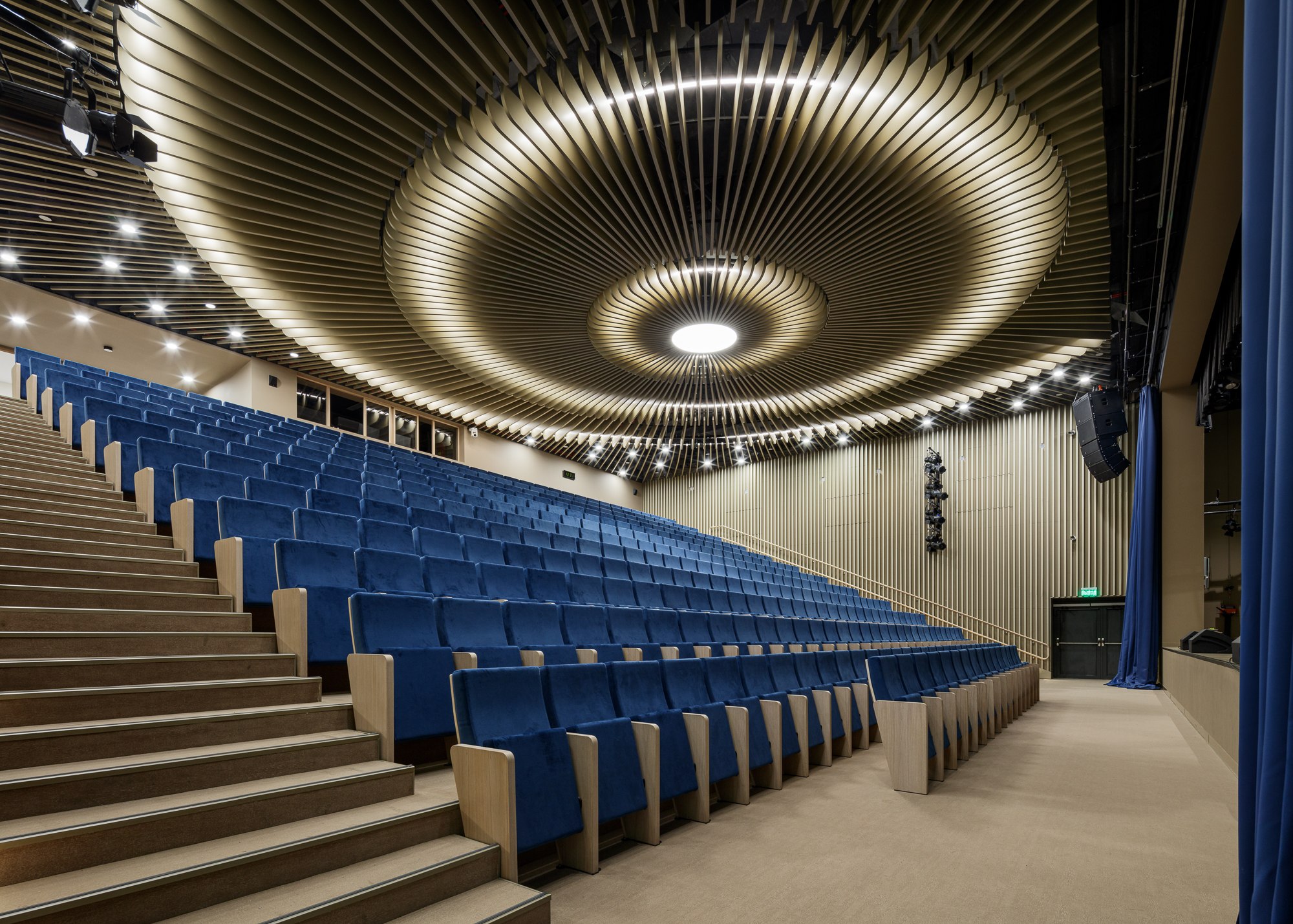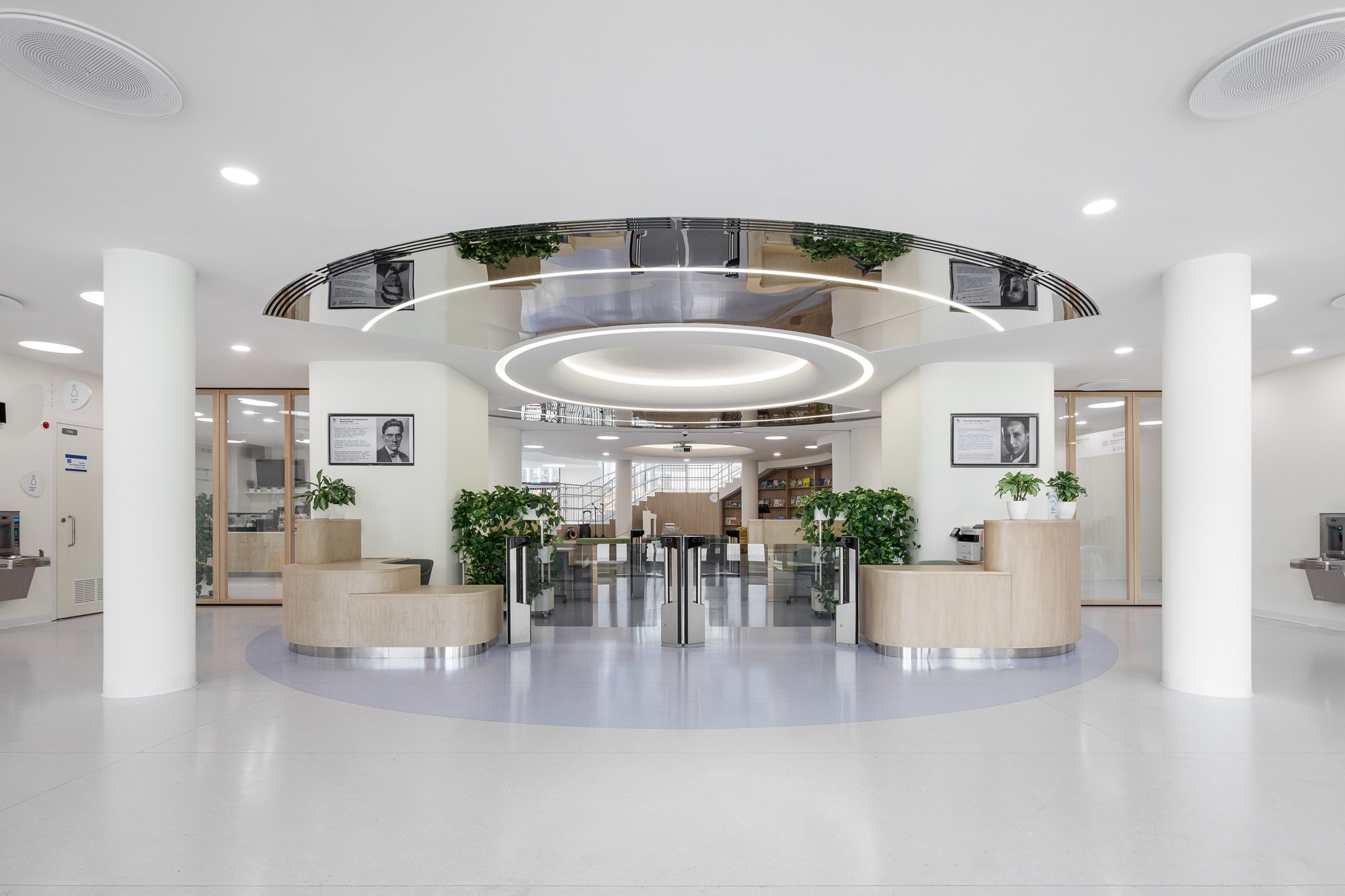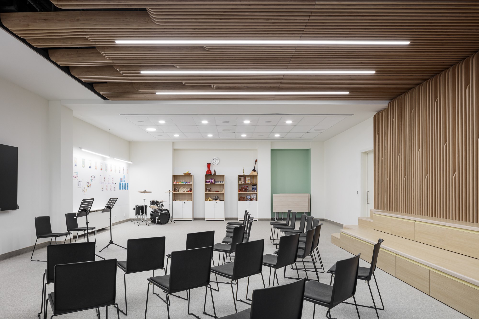 Средняя школа сфокусирована на развитии навыков через разнообразие форматов занятий. Помимо гибких учебных пространств в ней предусмотрены специализированные лаборатории, фаблаб, зоны для робототехники и творчества. Организация пространства стимулирует самостоятельность, исследовательский подход и командную работу. В основных учебных классах сохраняется принцип мобильности: одиночные рабочие места легко адаптируются под формат занятия – от лекции до группового проекта.
