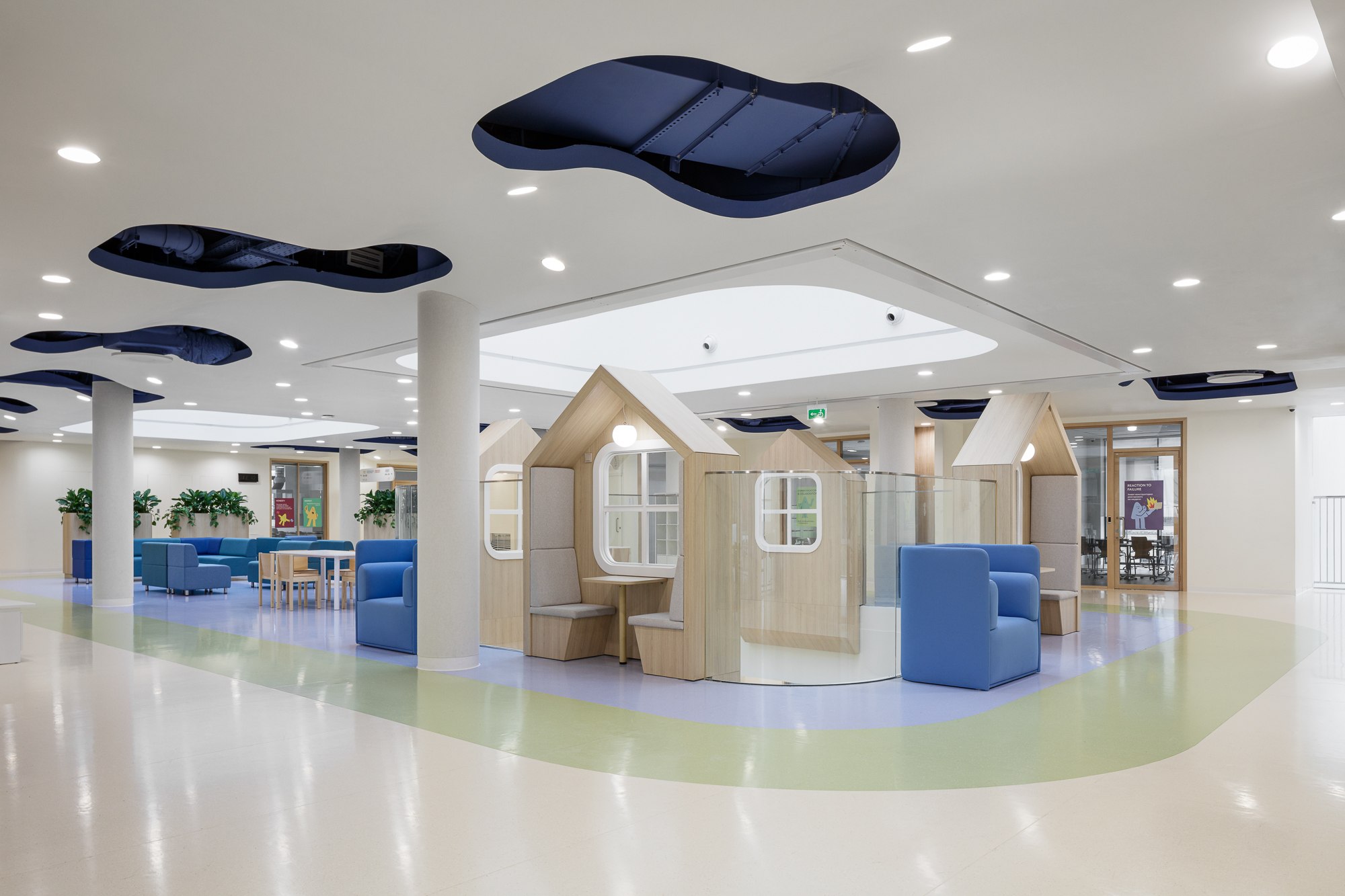 «Летово Джуниор» – это детский сад, школа для учеников 1–9 классов и центр дополнительного образования. Этим обусловлены типология и различия имеющихся рекреаций: они поделены по возрасту, находятся в разных архитектурных блоках и, главное, отличаются тем, что происходит внутри них – прежде всего подходами к работе с потоками детей. При проектировании школы Летово Junior специалисты Архитектурной студии NF опирались на лучший опыт существующего кампуса Летово и современные исследования в области детского развития.