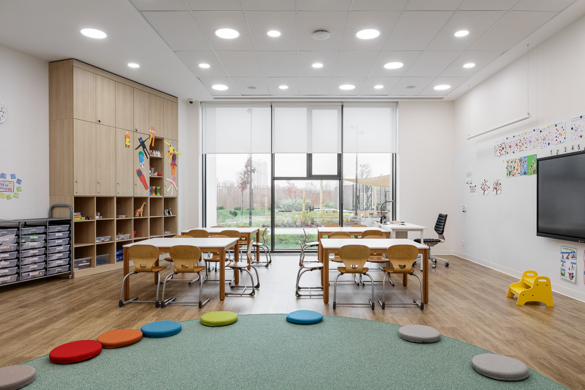 В каждом классе предусмотрены места для детей с синдромом дефицита внимания и гиперактивности. Такое рабочее место подразумевает изолированный стол, качающийся стул-табурет и акустическую перегородку, чтобы ребенок мог в случае необходимости отделиться от класса, сконцентрироваться и выполнить задание.