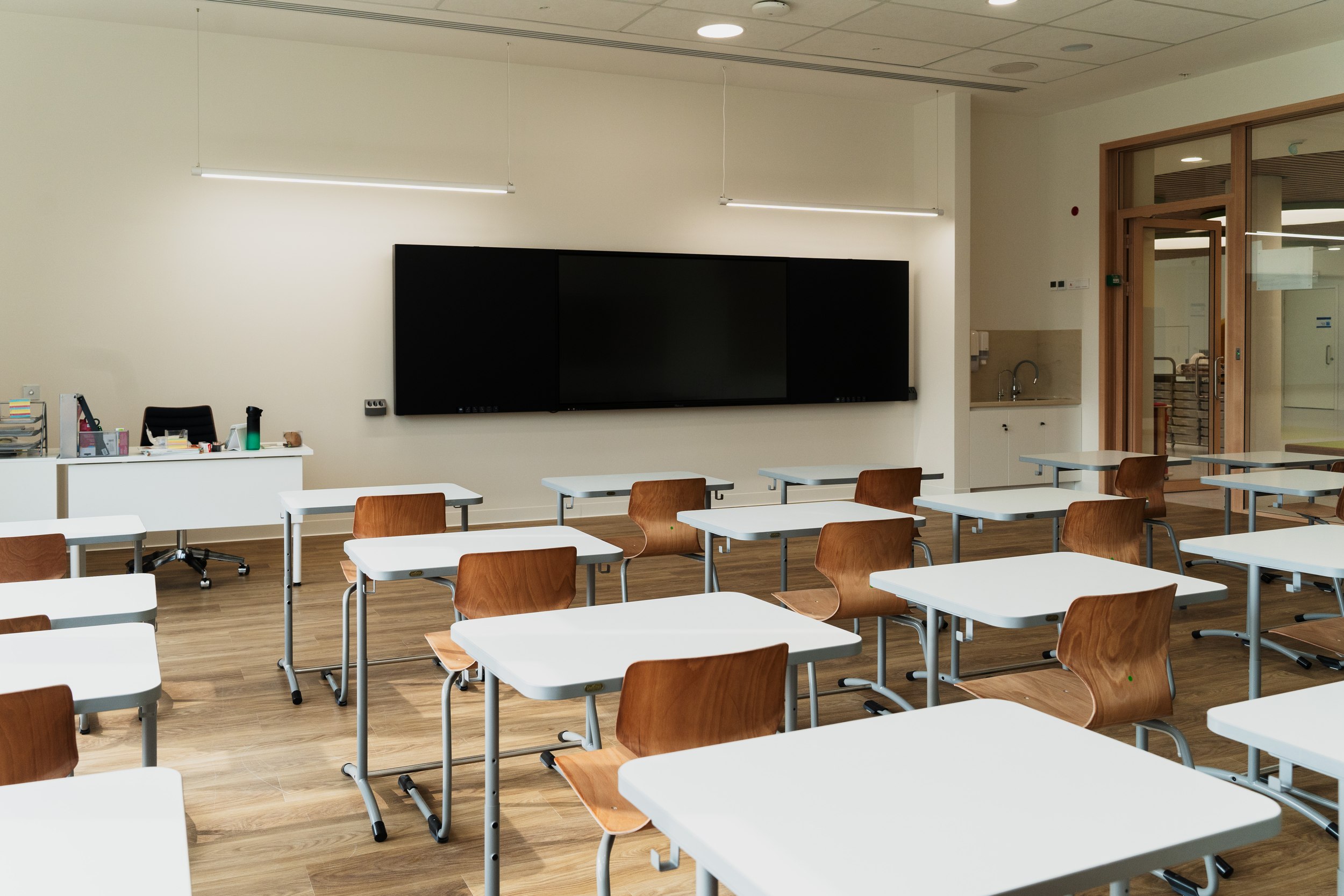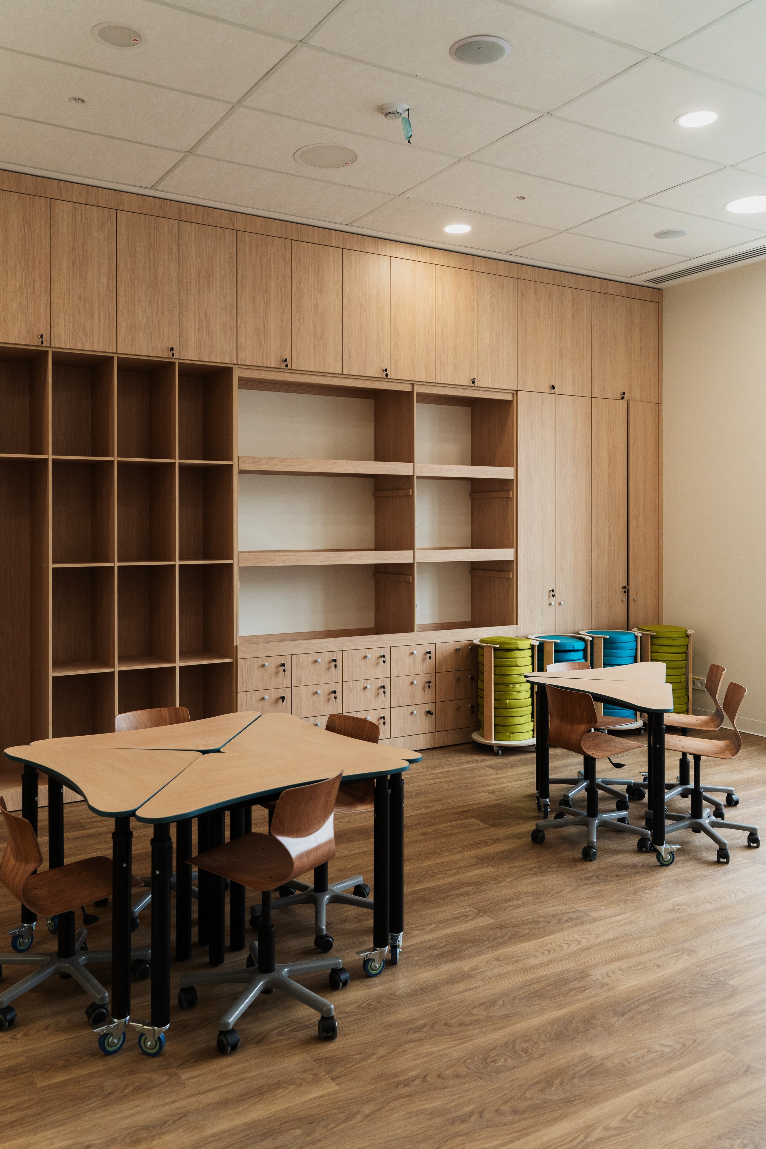 Средняя школа сфокусирована на развитии навыков через разнообразие форматов занятий. Помимо гибких учебных пространств в ней предусмотрены специализированные лаборатории, фаблаб, зоны для робототехники и творчества. Организация пространства стимулирует самостоятельность, исследовательский подход и командную работу. В основных учебных классах сохраняется принцип мобильности: одиночные рабочие места легко адаптируются под формат занятия – от лекции до группового проекта.