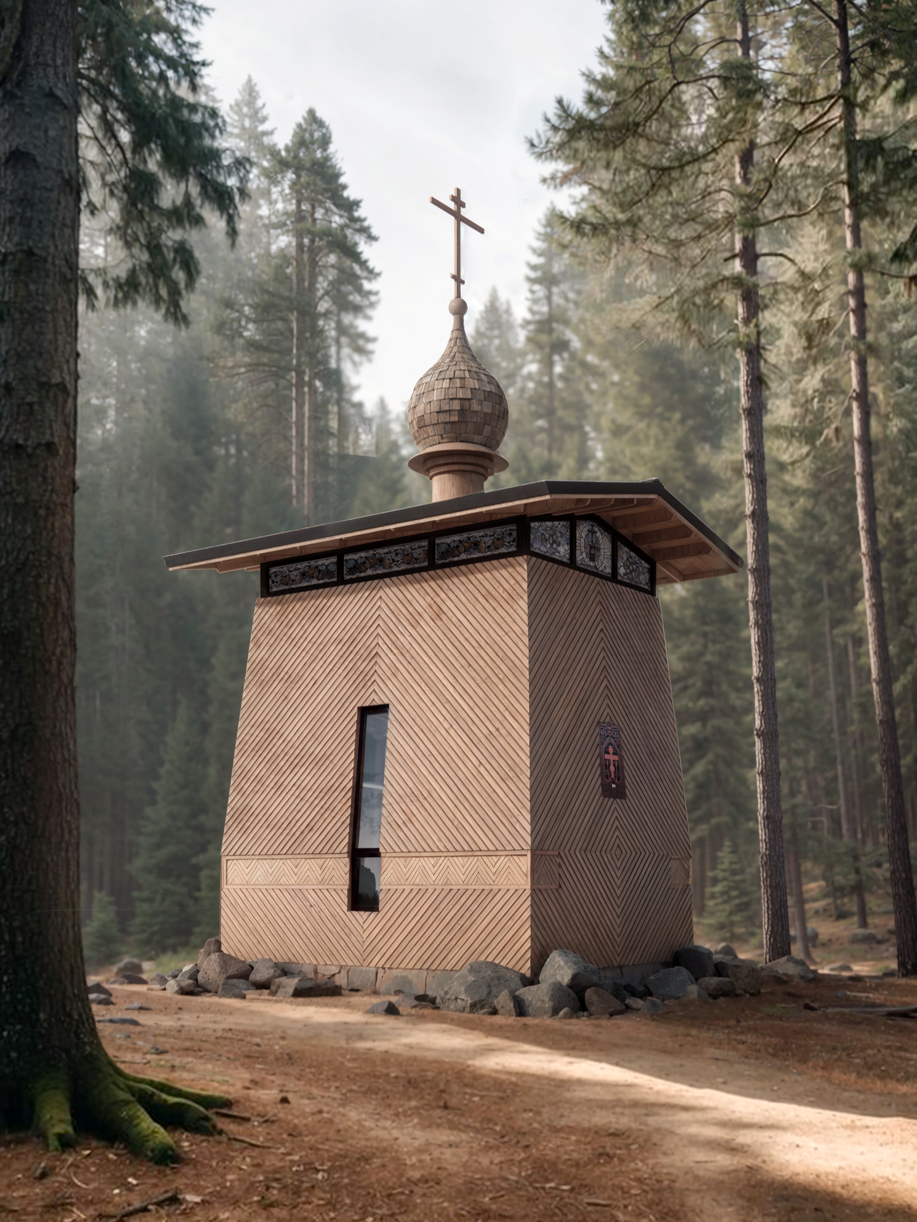 Эскизный проект деревянной часовни в честь святителя Николая Чудотворца разработан для Республики Карелия. Часовня разместится на участке со сложным рельефом, где преобладают скальные выходы и мох, а слой чернозёма минимален.