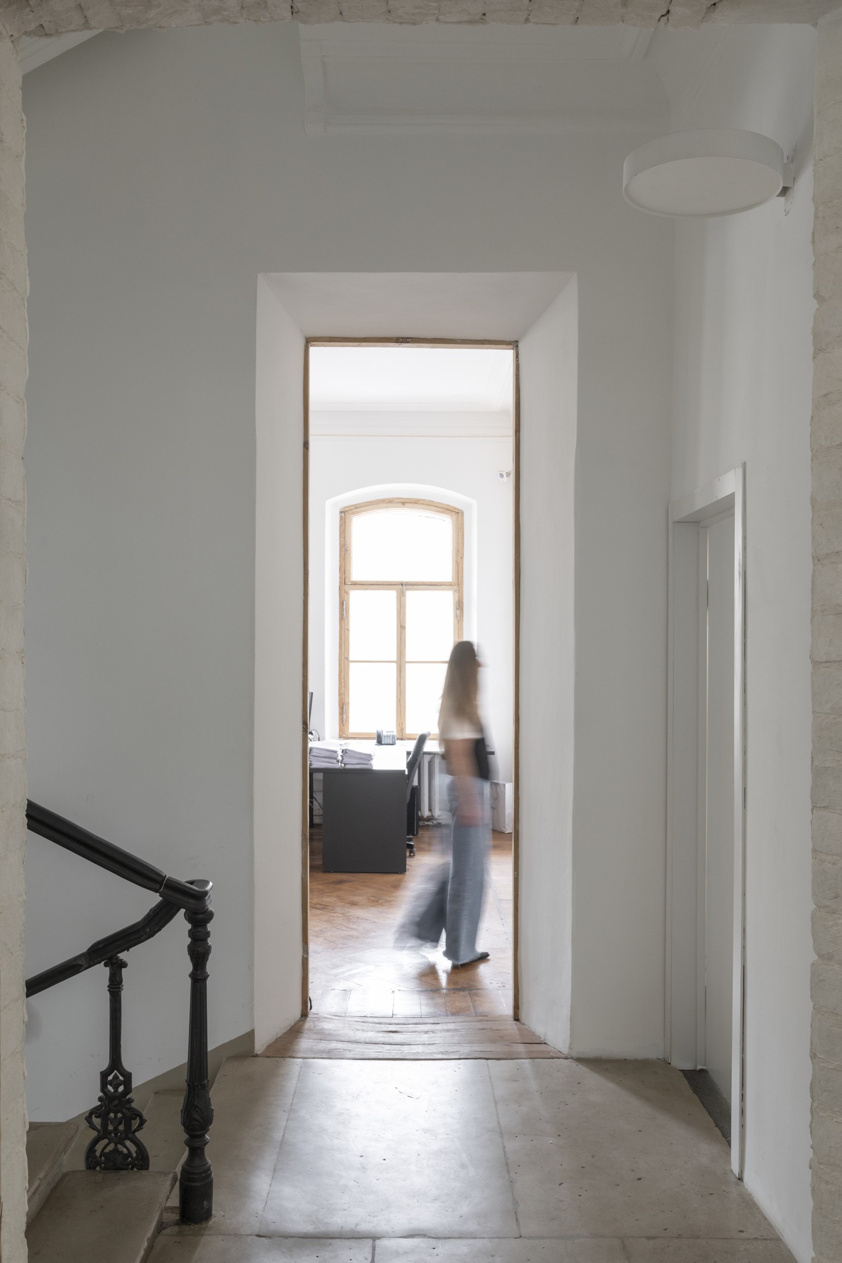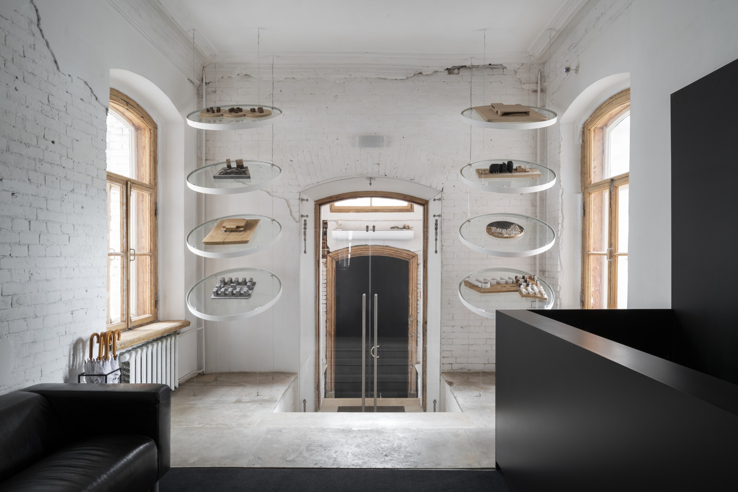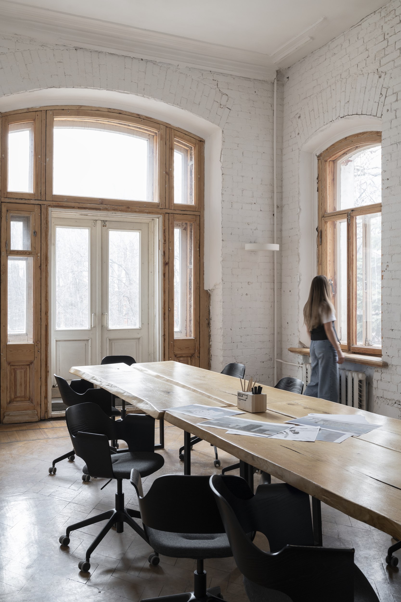 Объем и простор на первом этаже добавляет кольцевая планировка, пространство второй архитектурной мастерской легко пройти по кругу. Множество прямоугольных окон с сохранившимися рамами и крючками для их фиксации подчеркивают исторический контекст.