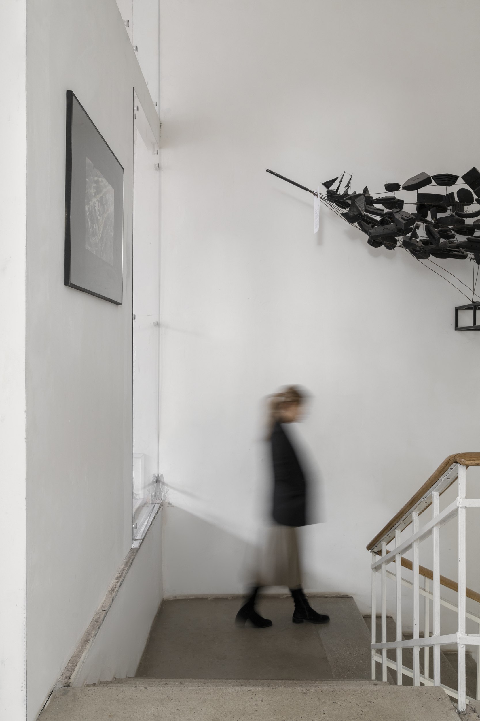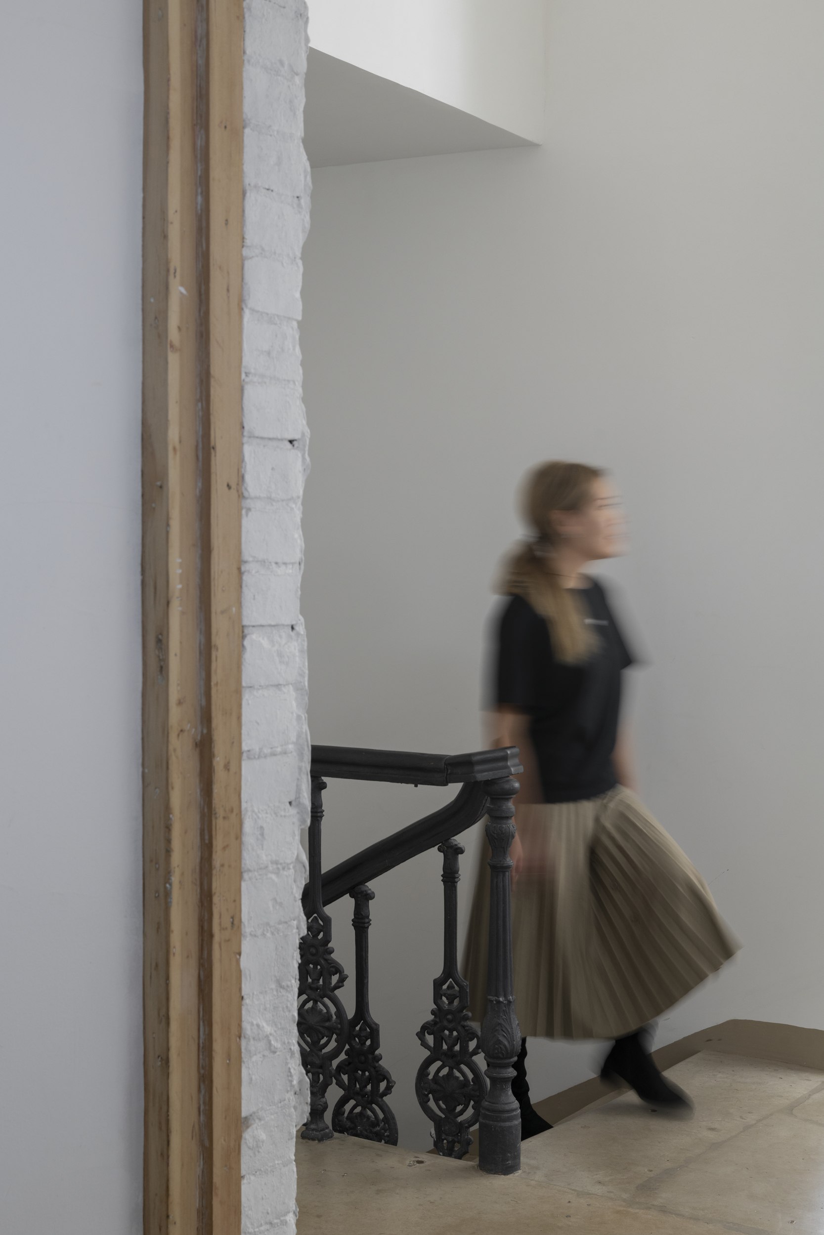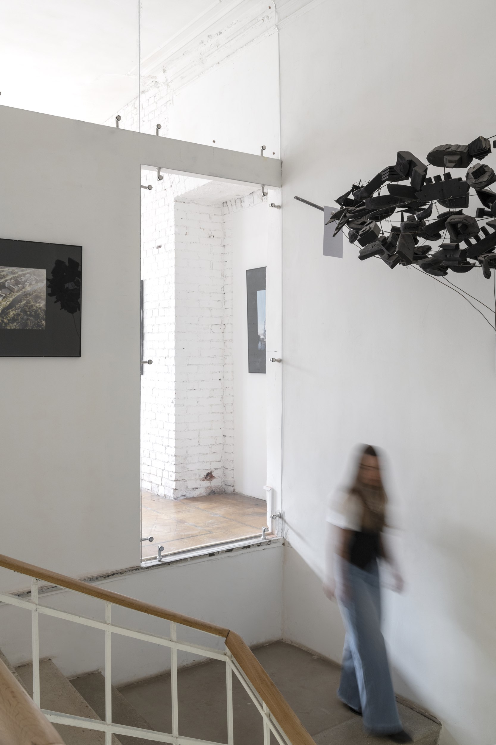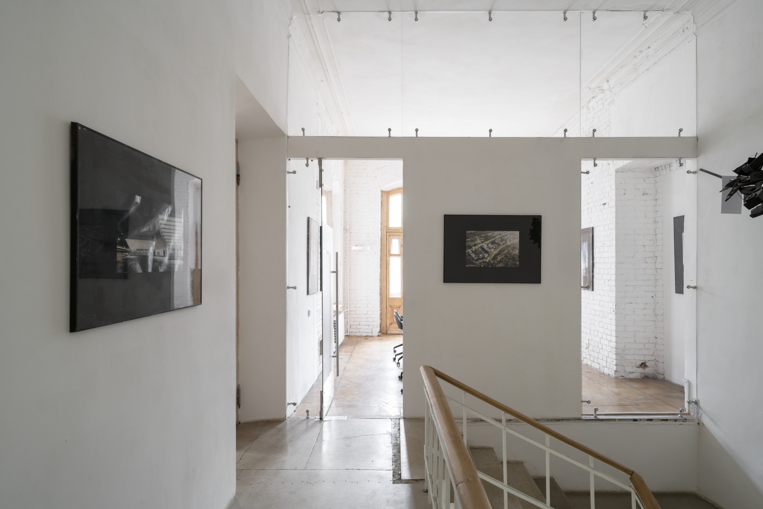 Объем и простор на первом этаже добавляет кольцевая планировка, пространство второй архитектурной мастерской легко пройти по кругу. Множество прямоугольных окон с сохранившимися рамами и крючками для их фиксации подчеркивают исторический контекст.