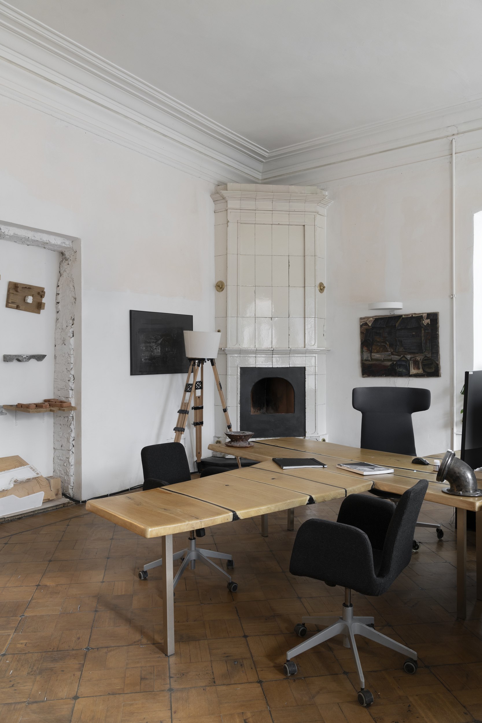 В офисе руководителей бюро, где раньше располагался кабинет главного инженера, отреставрировали изразцовую голландскую печь с камином и латунными элементами, которая остается центром интерьера и сегодня.