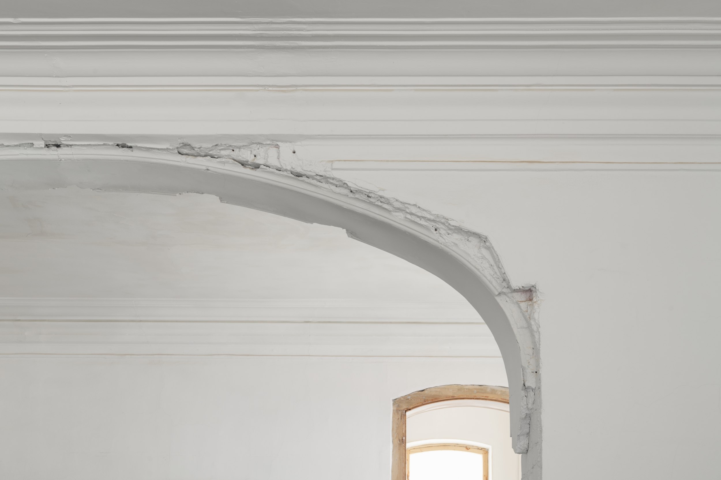Потолки были частично разрушены, а уцелевшие участки скрыты под подвесными плитами. Сейчас их украшает восстановленная лепнина, придающая пространству исторический шарм.
