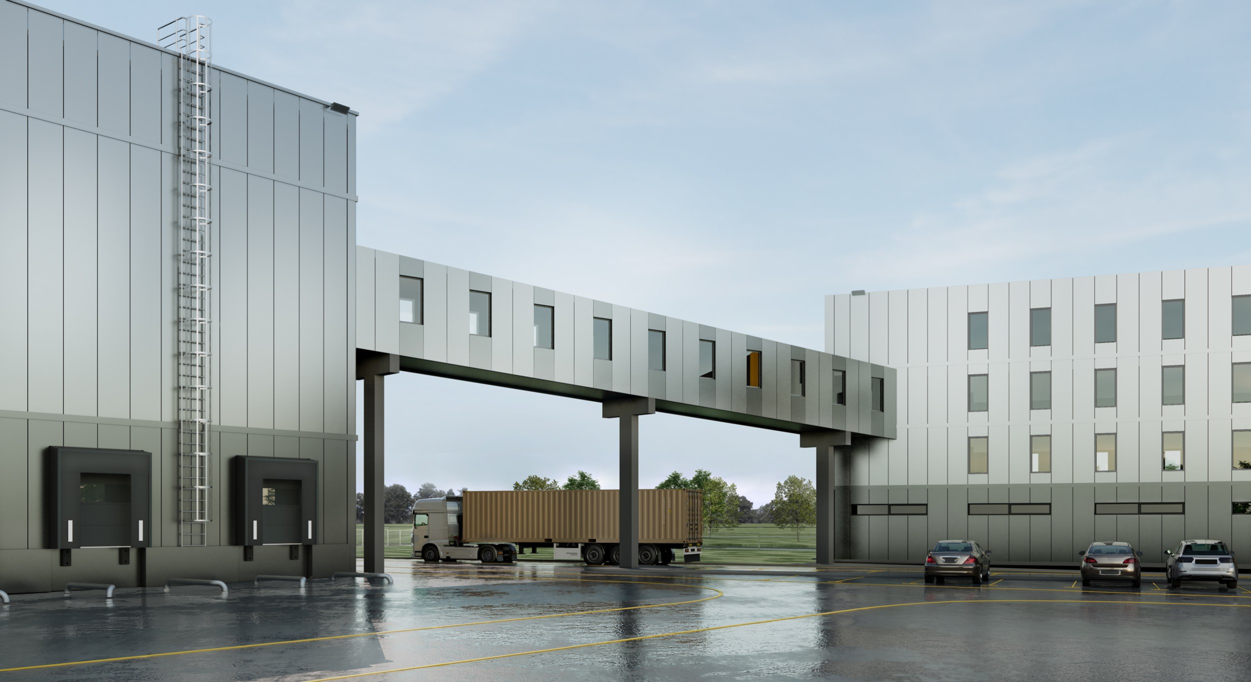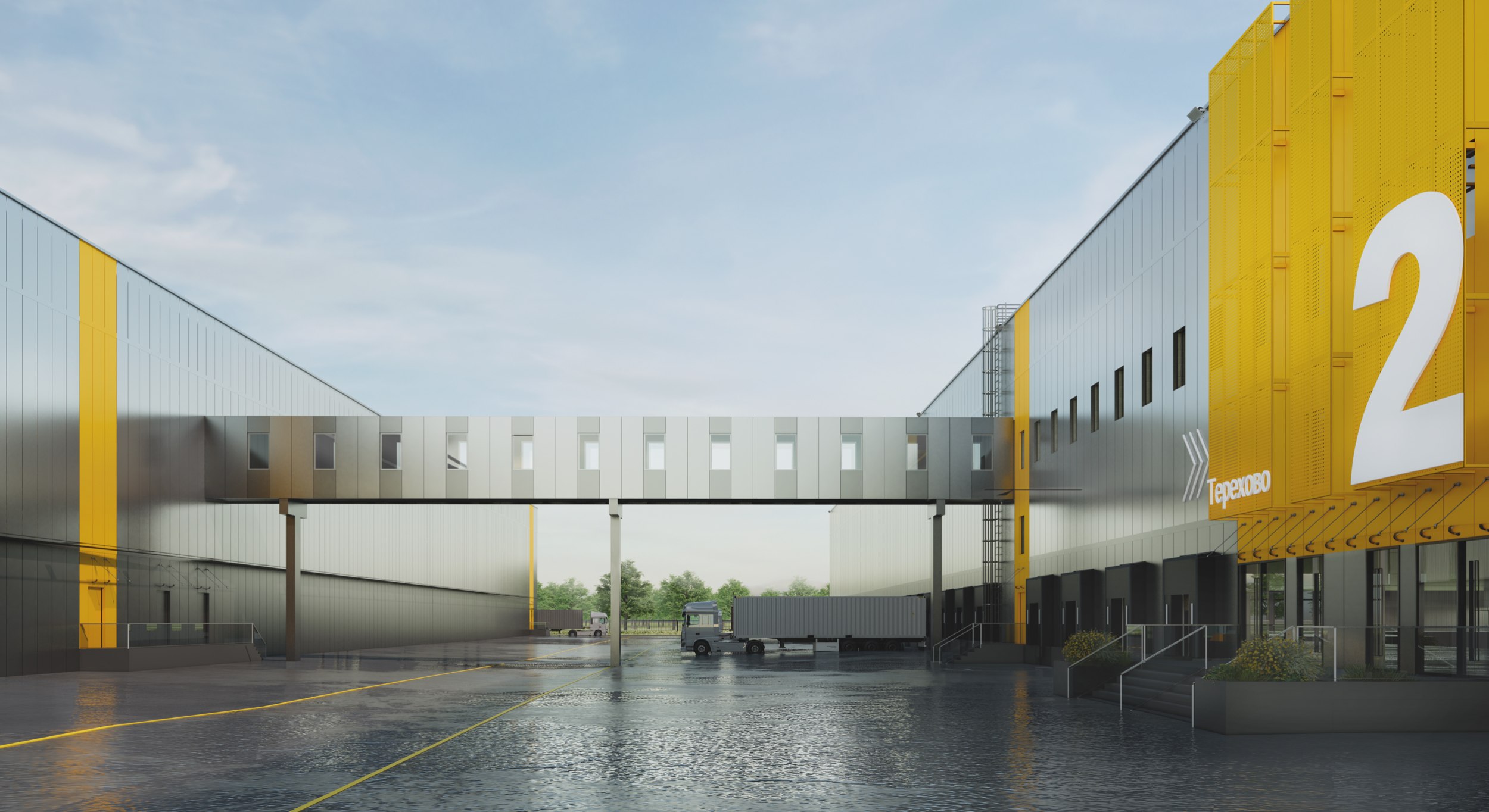 Планировочная структура ясна и логична: два объемных складских корпуса и административно-бытовое здание образуют цельный ансамбль. Масштаб и пропорции подчинены логике потоков – движения транспорта, людей и товаров. Архитектура работает с ритмом и тенью, создавая ощущение технологичности и внутреннего порядка.