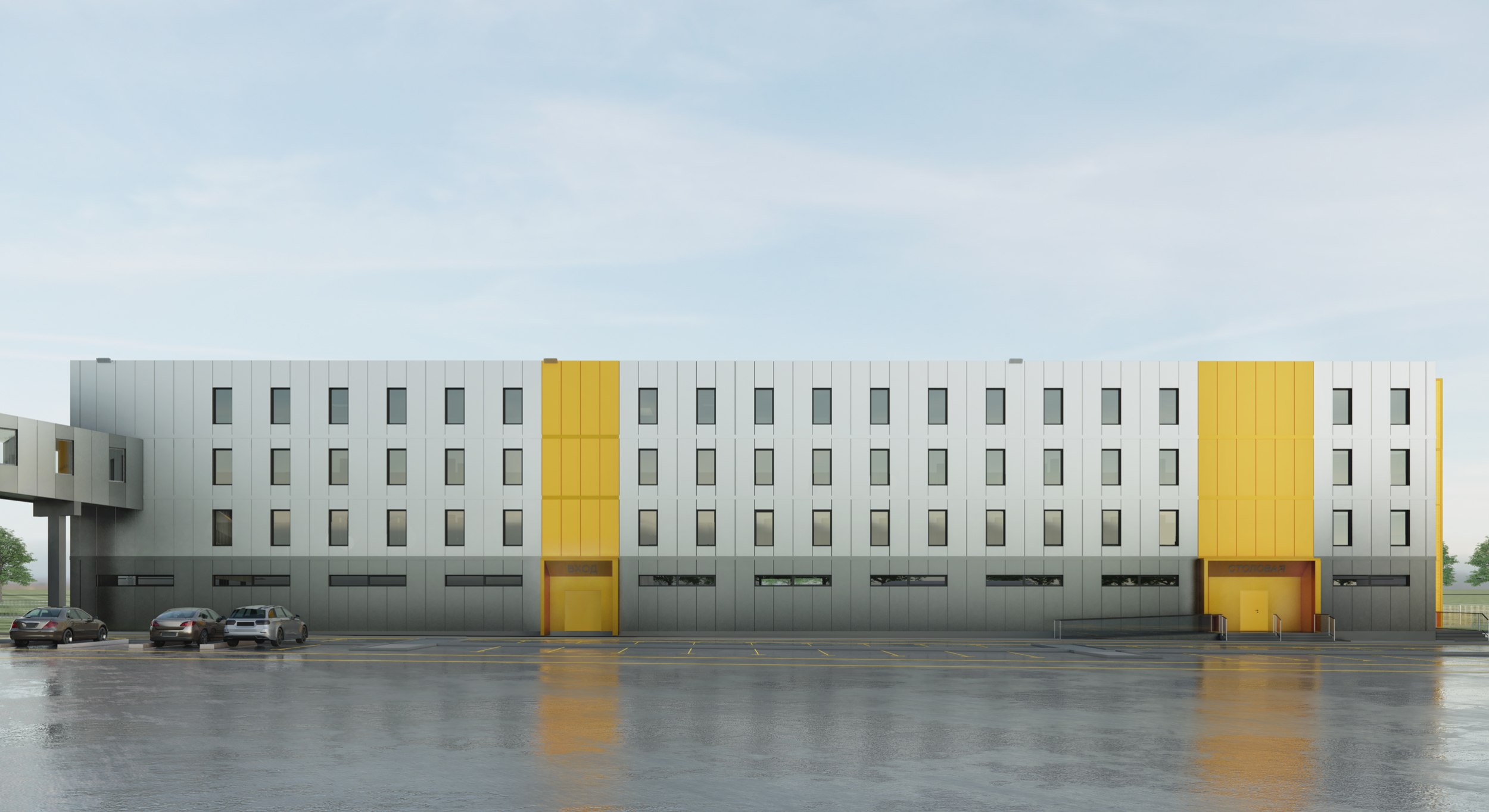 Административно-бытовой корпус ориентирован на комфорт сотрудников: в нем размещены офисные пространства, столовая и зоны отдыха. Горизонтальные ритмы фасадов и обширное остекление создают ощущение открытости и современности.
