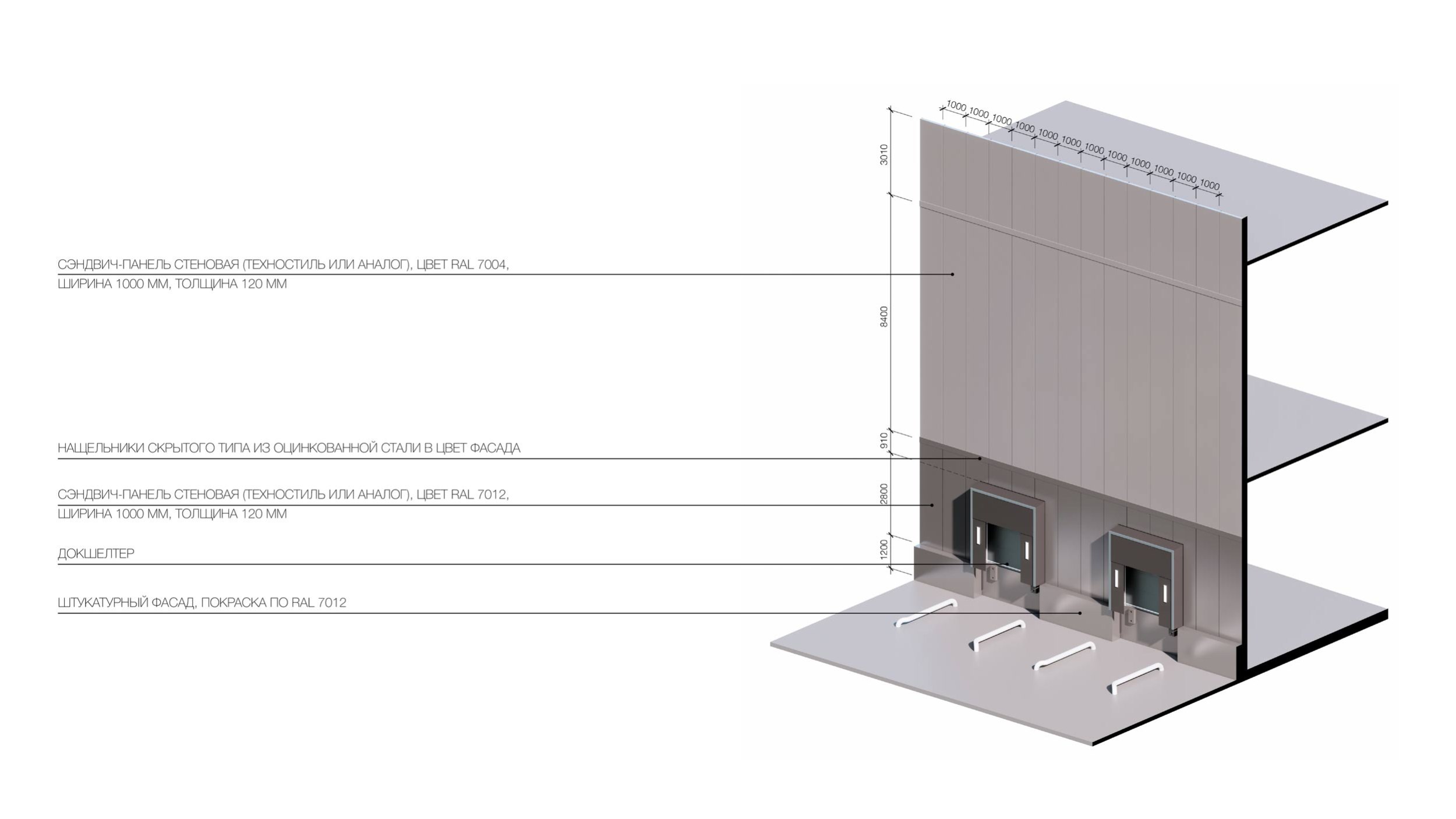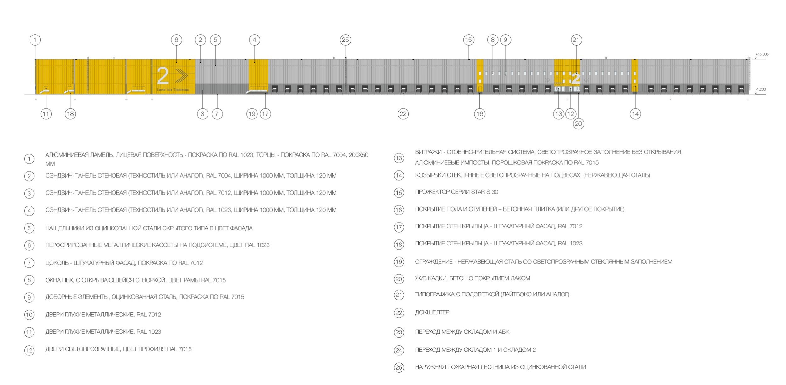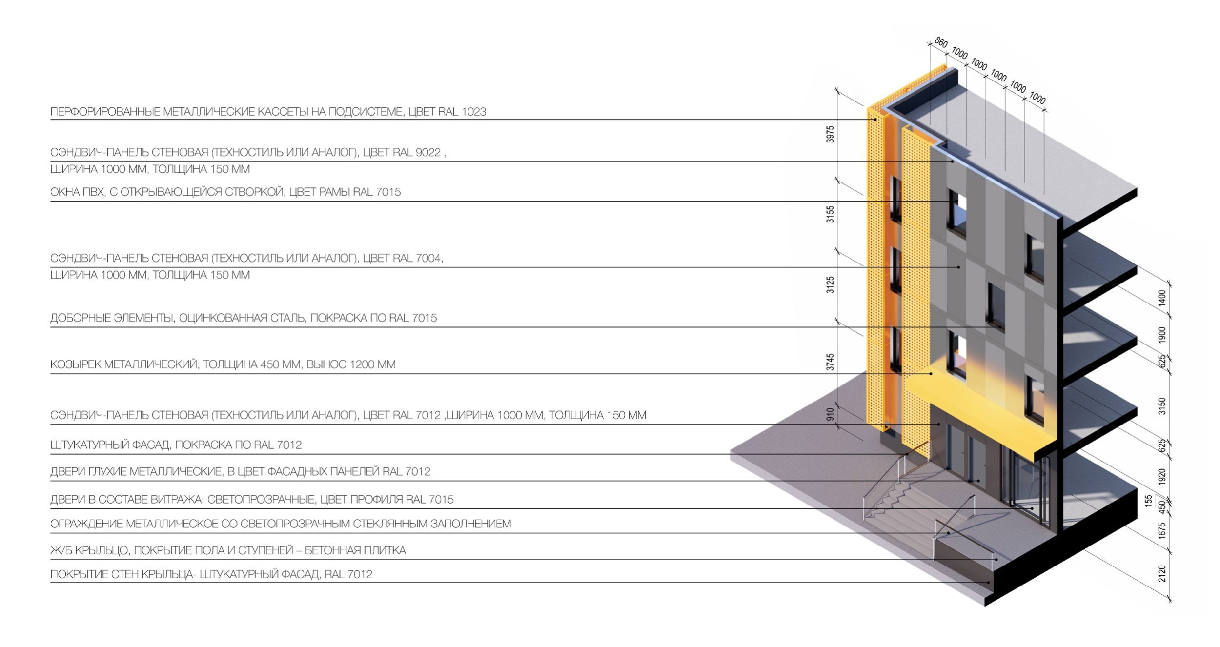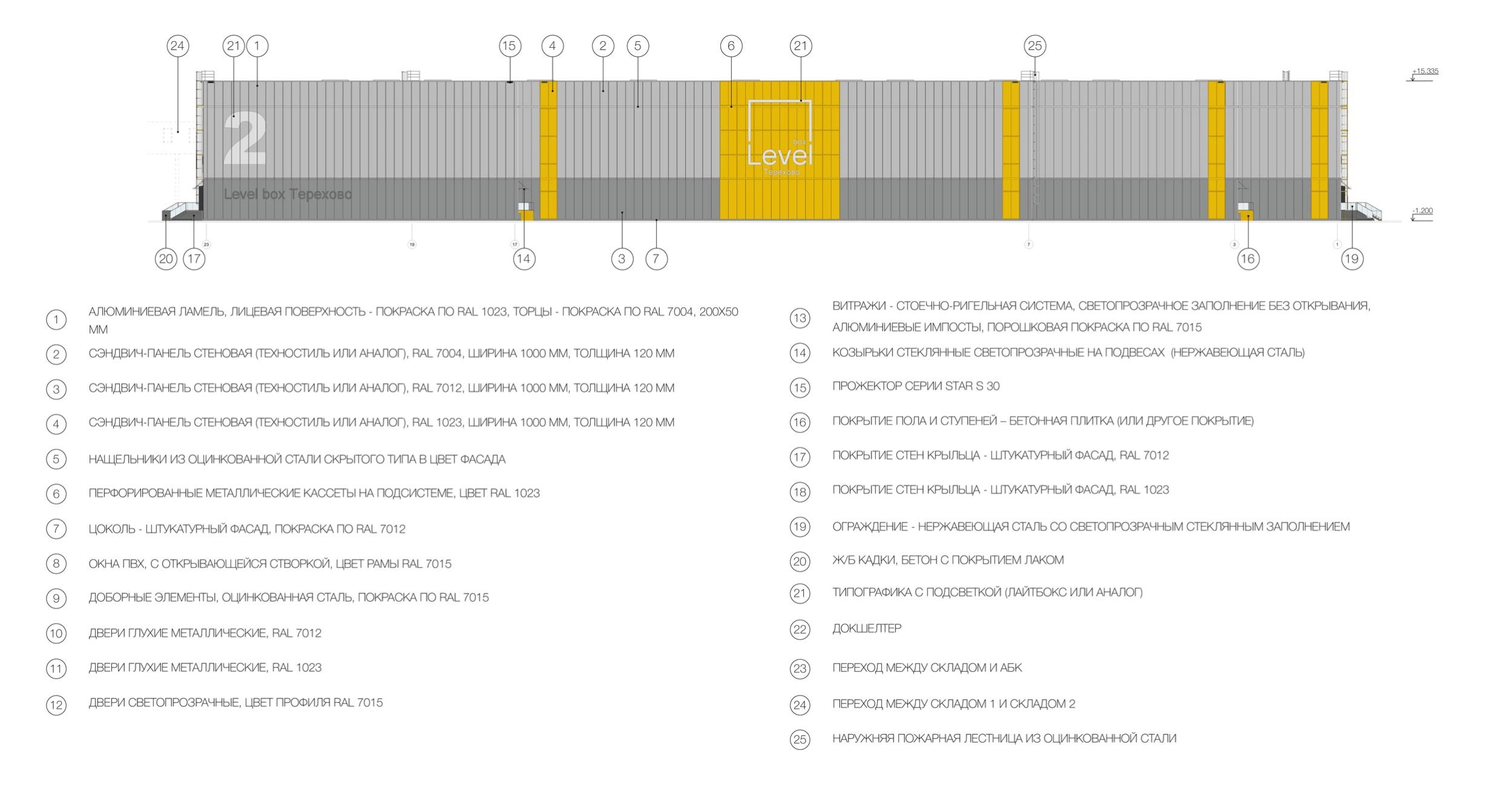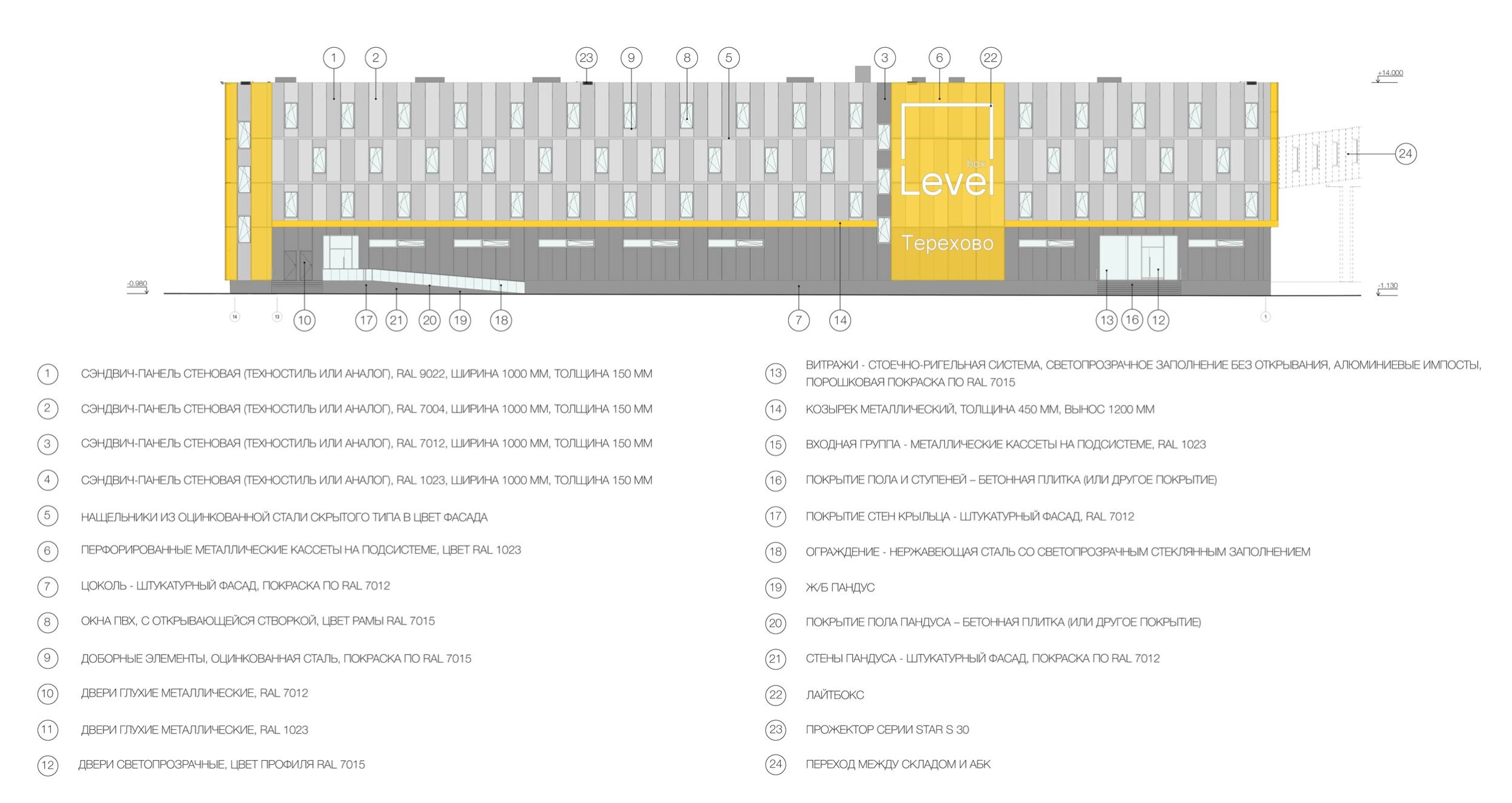 Фасадные конструкции: сэндвич-панель стеновая (RAL 7012, 7004, 1023), перфорированные металлические кассеты на подсистеме (RAL 1023)