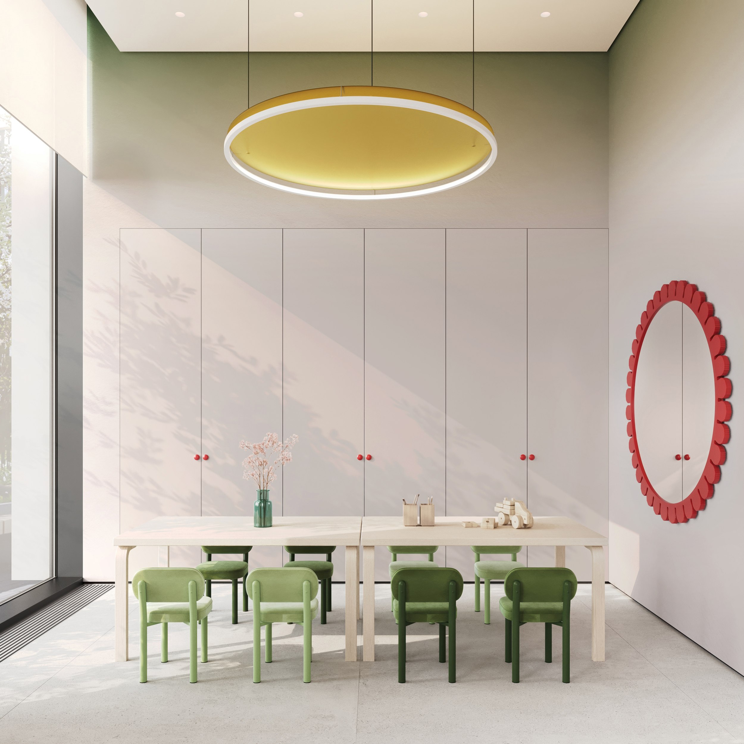 Общая гостиная совмещает функции библиотеки, лаунжа и небольшого лектория. Пространство гибко трансформируется под разные сценарии – от чтения и встреч до кинопросмотров и лекций. Небольшие перепады уровня формируют амфитеатр, а витражи и озеленение создают ощущение связи с внешней средой.