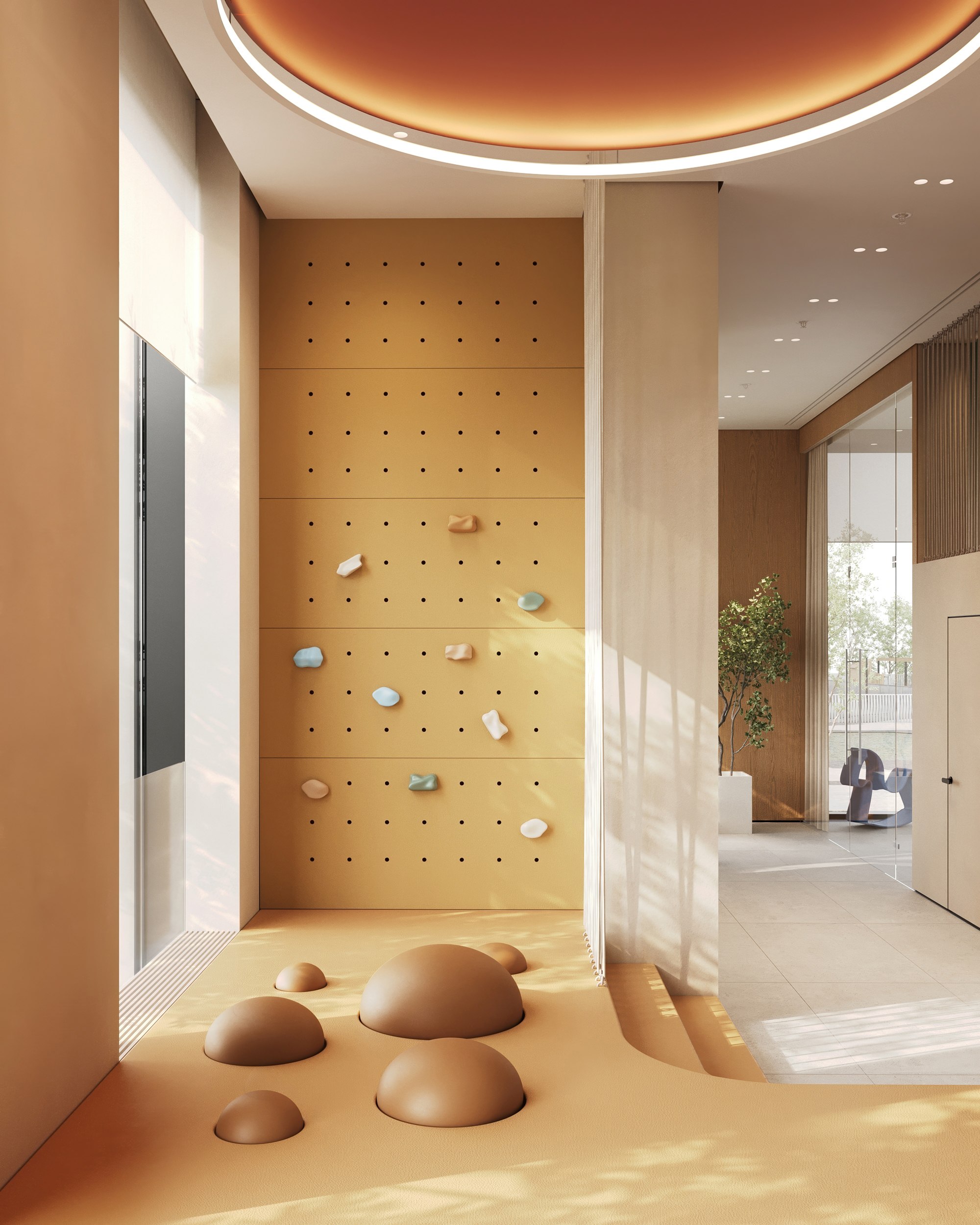 В структуре комплекса выделены три ключевые общественные зоны: гостиная, фитнес-зал и детская игровая.