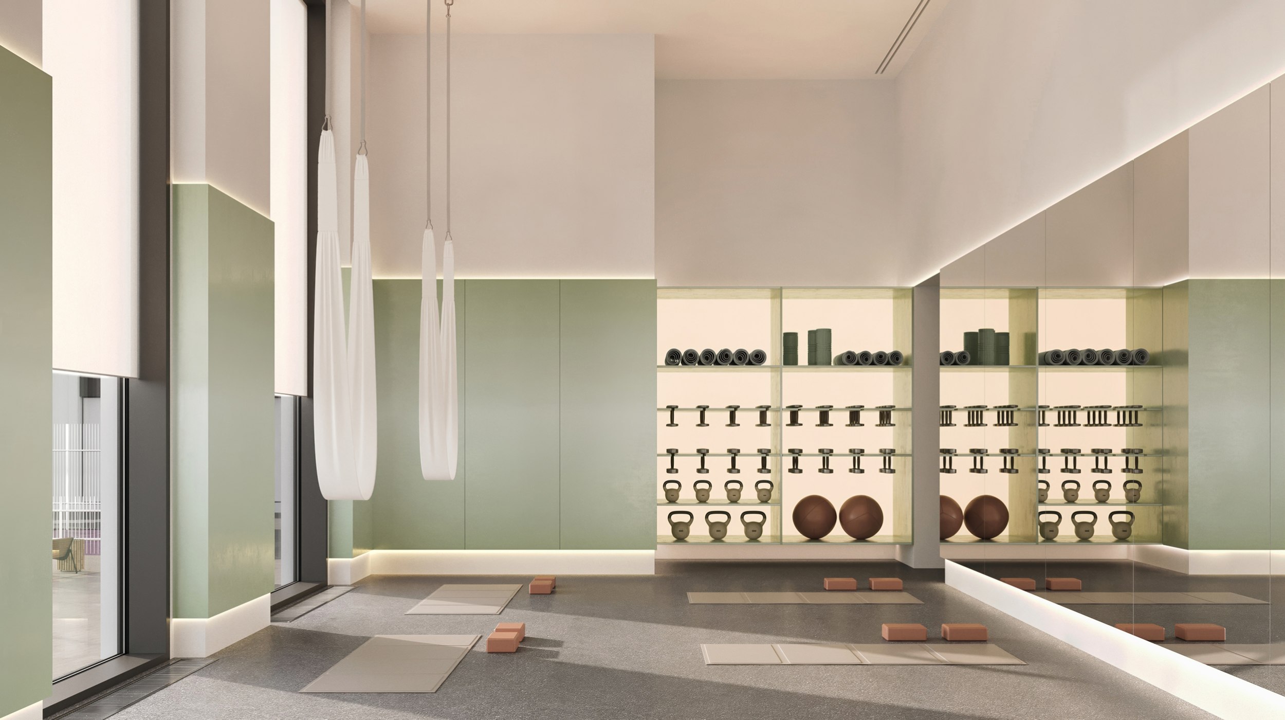Фитнес-зал решён максимально лаконично: просторный, светлый объём с зеркальными поверхностями и сдержанной цветовой гаммой визуально расширяет пространство. Планировка позволяет проводить как индивидуальные, так и групповые занятия. Встроенные стеллажи и осветительные решения интегрированы в архитектуру, создавая ощущение чистоты и покоя.