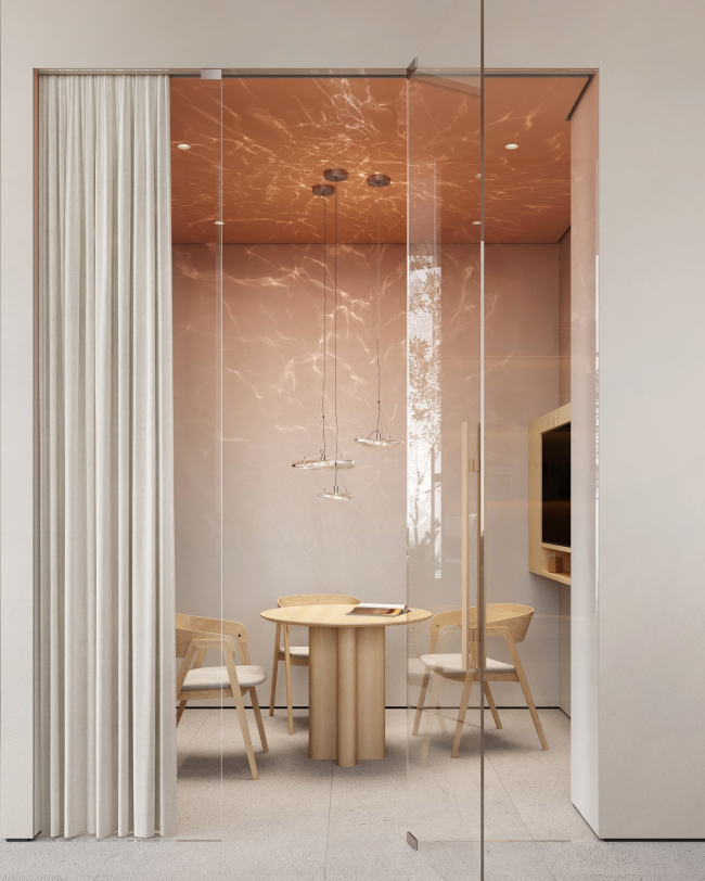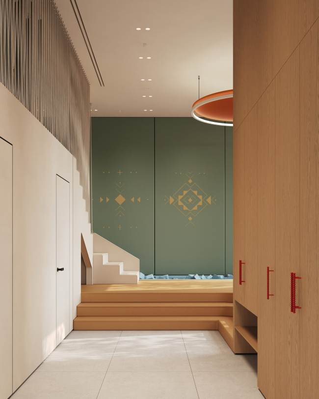 Архитекторы стремились к цельному восприятию комплекса – от планировочных решений до проработки деталей. Цветовая палитра выдержана в тёплых нейтральных тонах с использованием натуральных материалов – дерева, декоративной штукатурки, мягких текстур. Освещение организовано так, чтобы формировать ровный, ненавязчивый световой фон.
