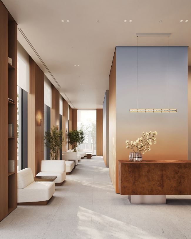 Во всех башнях предусмотрены приватные лобби с мягкими зонами ожидания. Центральным элементом комплекса становится гранд-лобби – просторное общественное пространство, объединяющее функции входной группы, зоны ожидания и кратковременной работы. Здесь можно забрать доставку, провести короткую встречу или просто посидеть с ноутбуком.