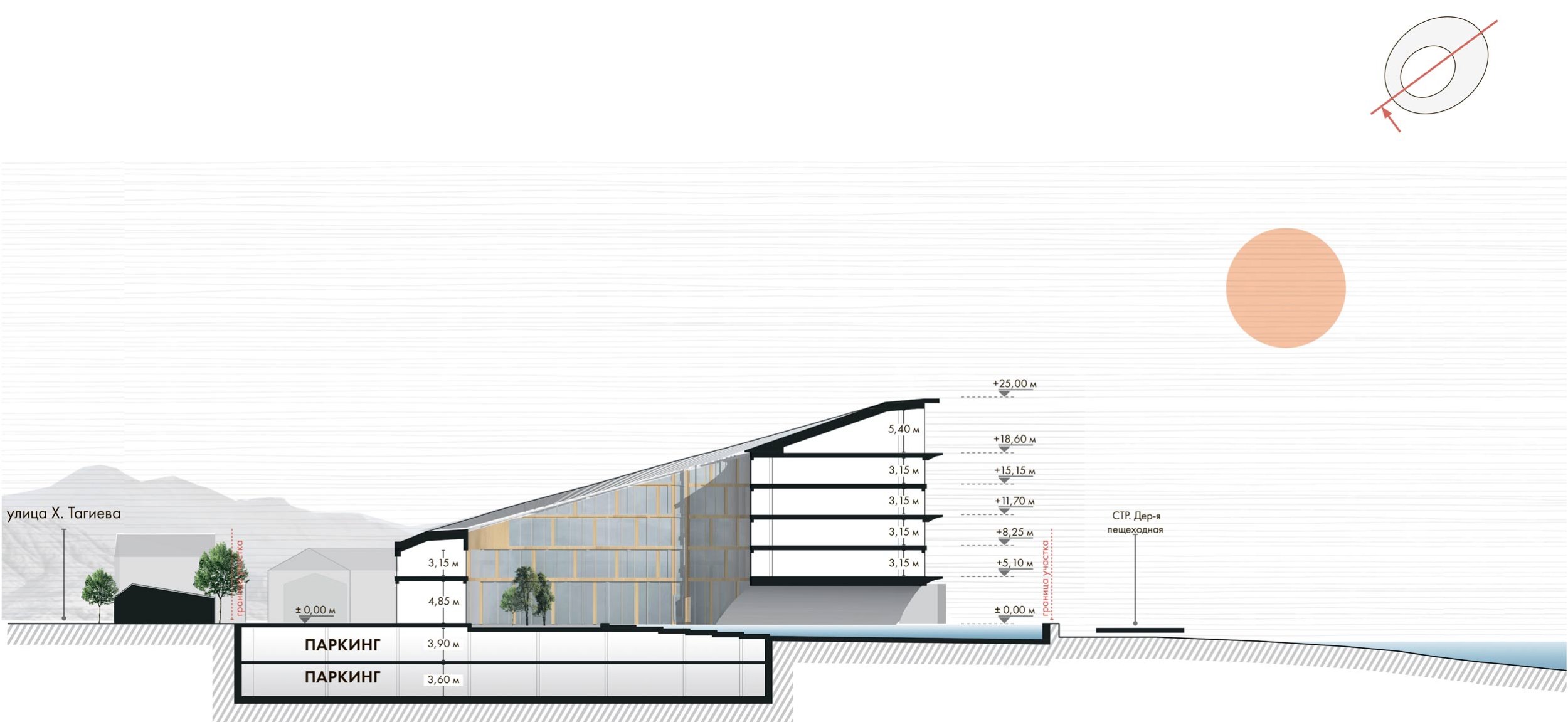 Верхний этаж выделен плавными параболическими арками, создающими эффект парения. В контраст ему фасад первого – коммерческого – уровня решён более монолитно, с широкими бетонными ригелями и витражным остеклением, подчёркивающими функциональность и современность.