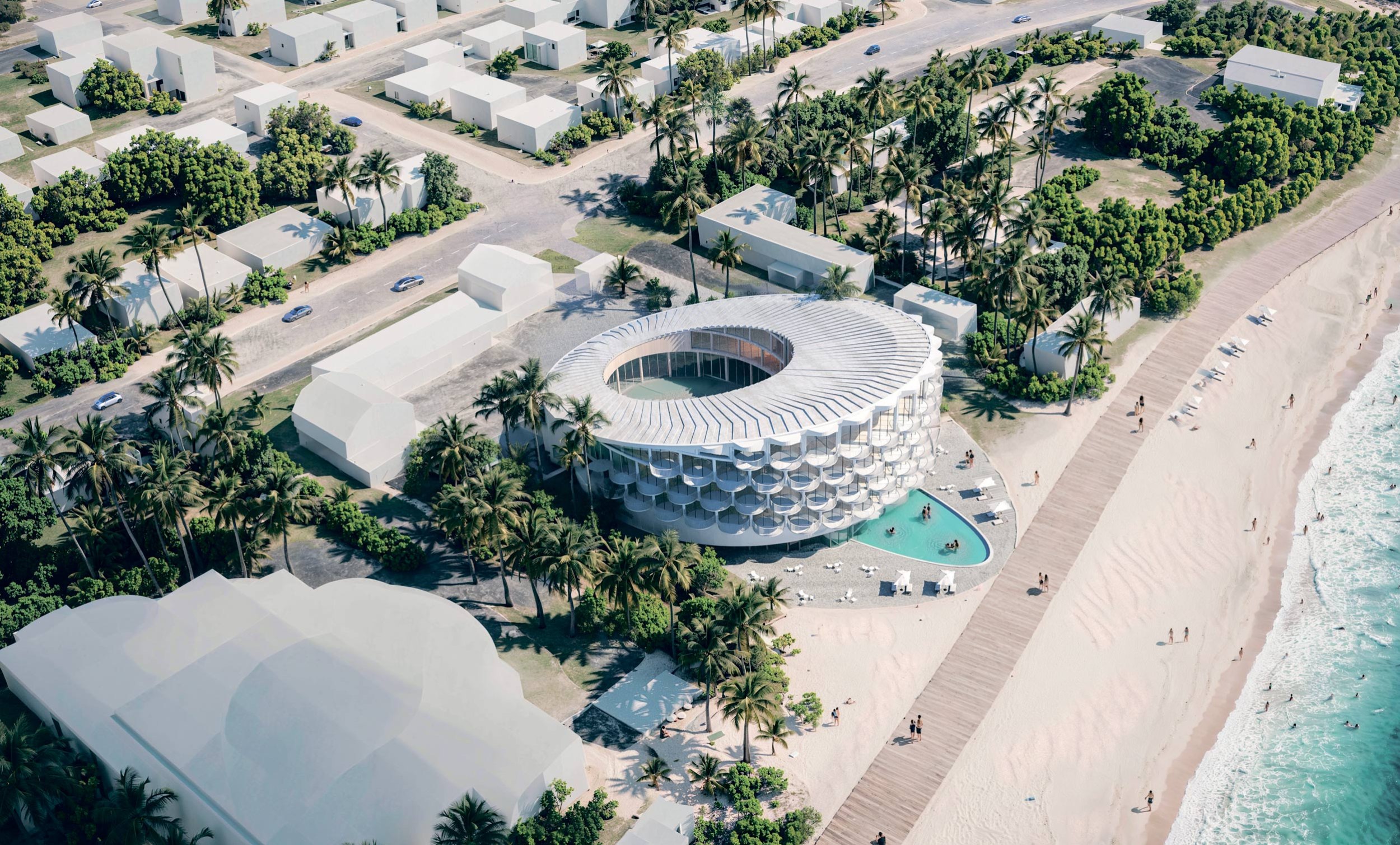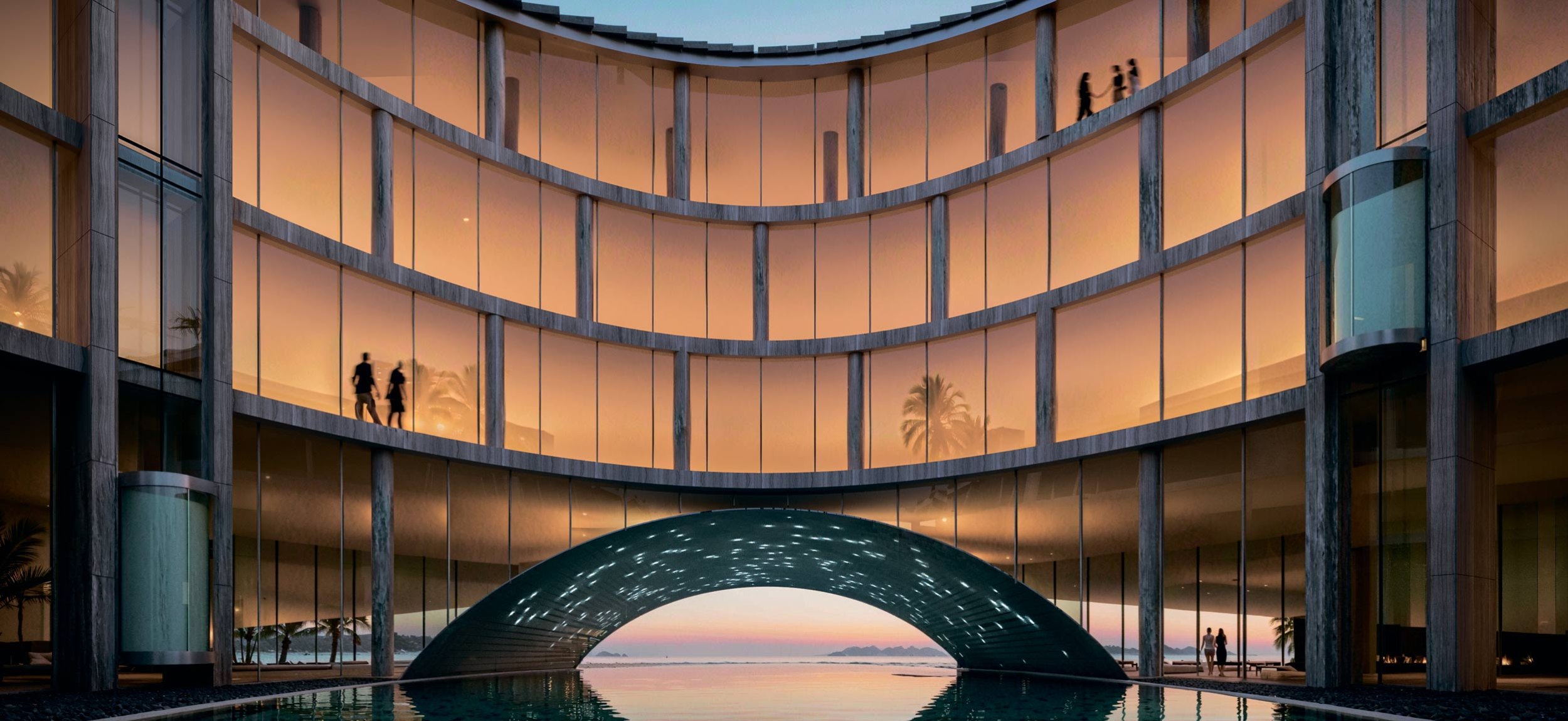 Полость кольца образует внутренний двор, окружённый стеклянными галереями. В его центре расположен бассейн, вода из которого плавно перетекает в сторону моря. Скошенное дно формирует пространственную арку, под которой можно проплыть, что создаёт прямой доступ к пляжу и усиливает ощущение единства с природой.