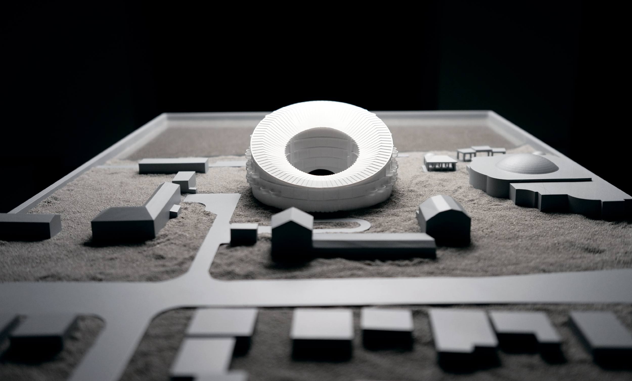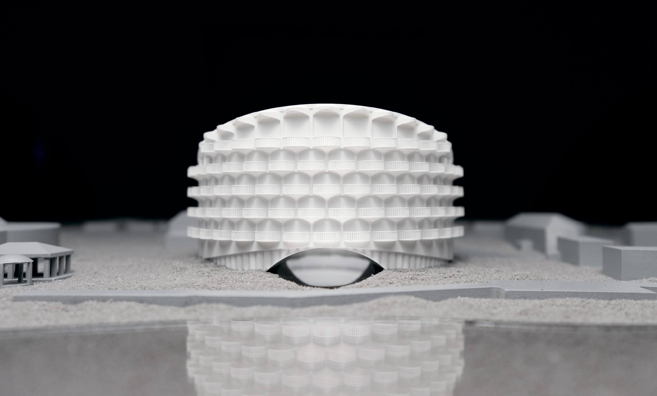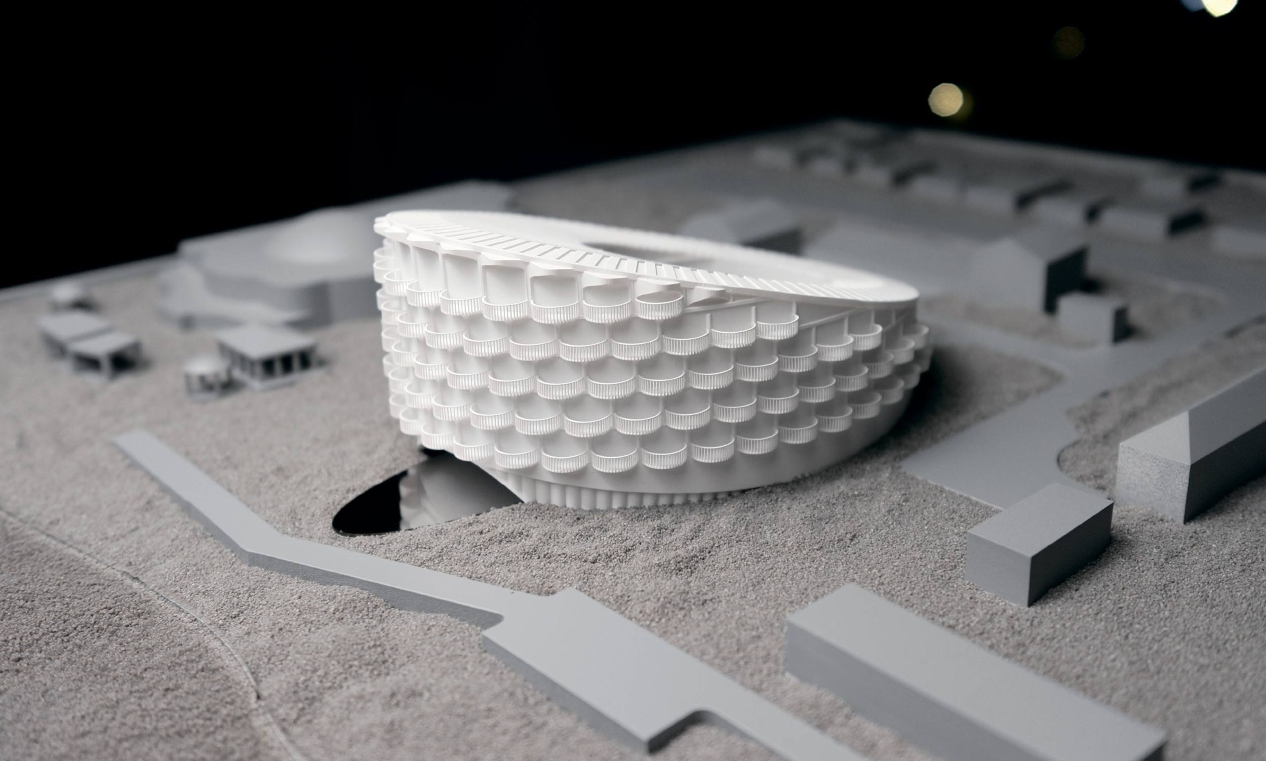 Здание имеет форму кольца со скошенными дном и крышей, создавая впечатление, будто оно «опирается» на землю в одной точке, а свободная часть устремляется к небу. Такая пластика не только притягивает взгляд, но и формирует выразительное внутреннее пространство.
