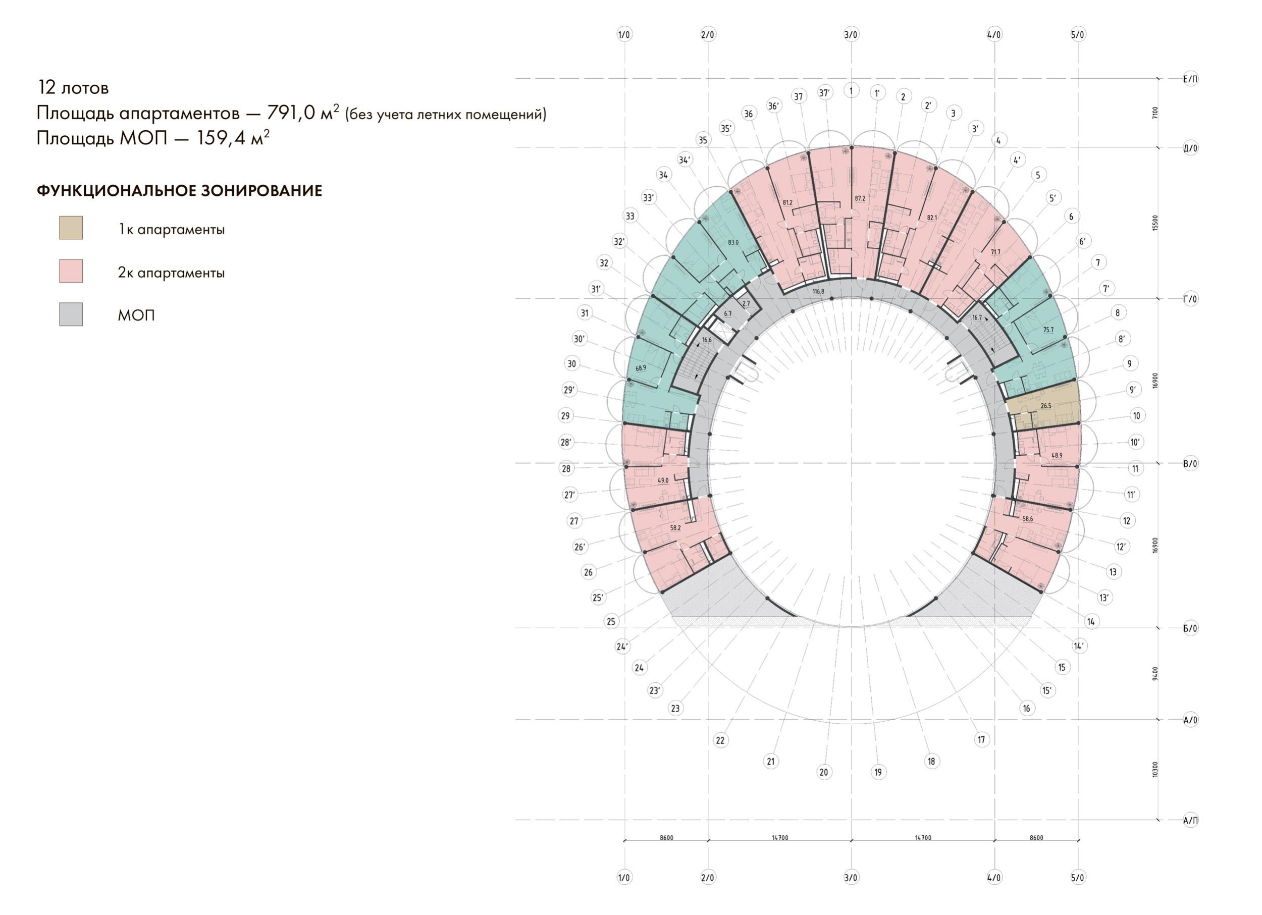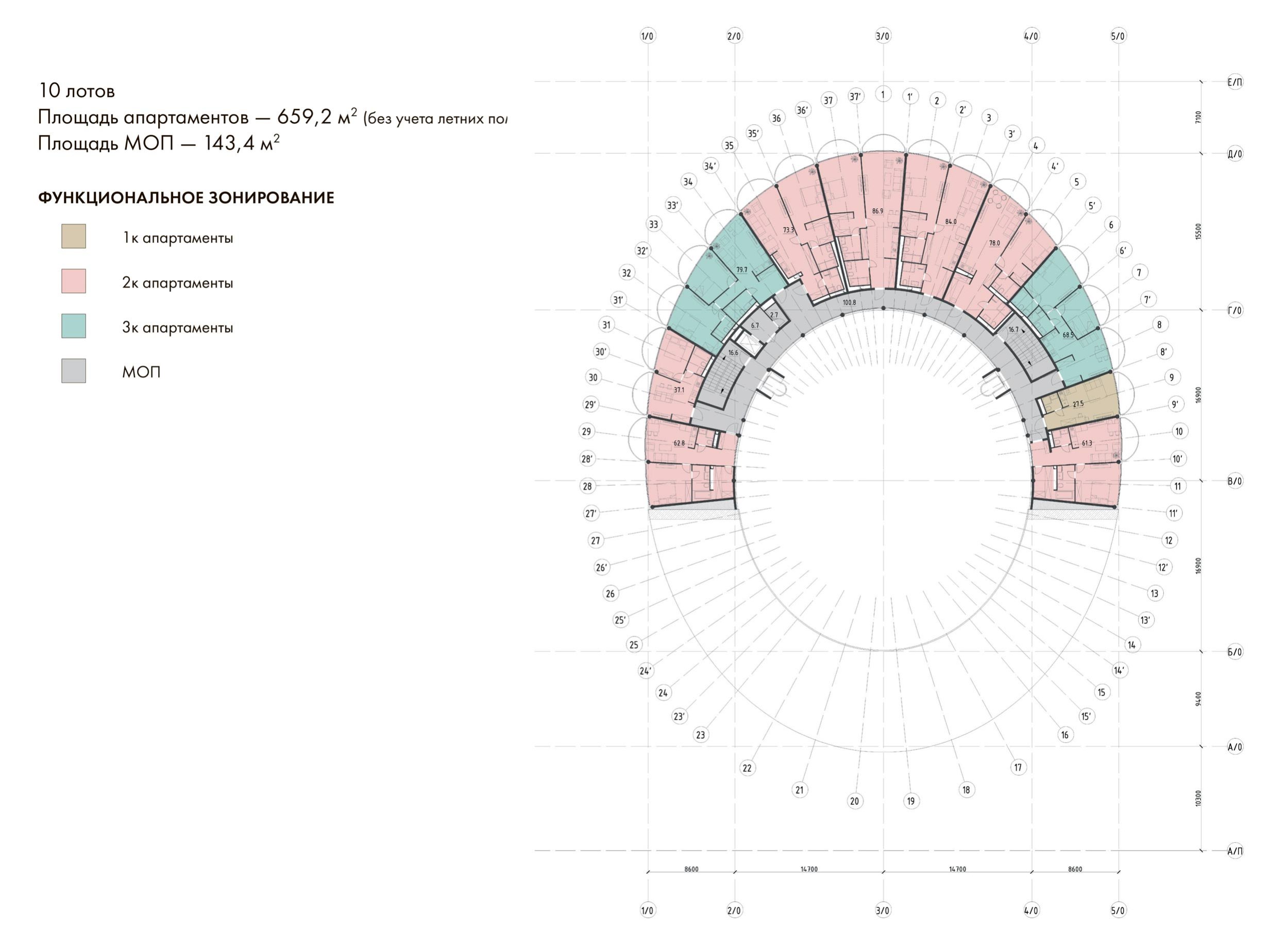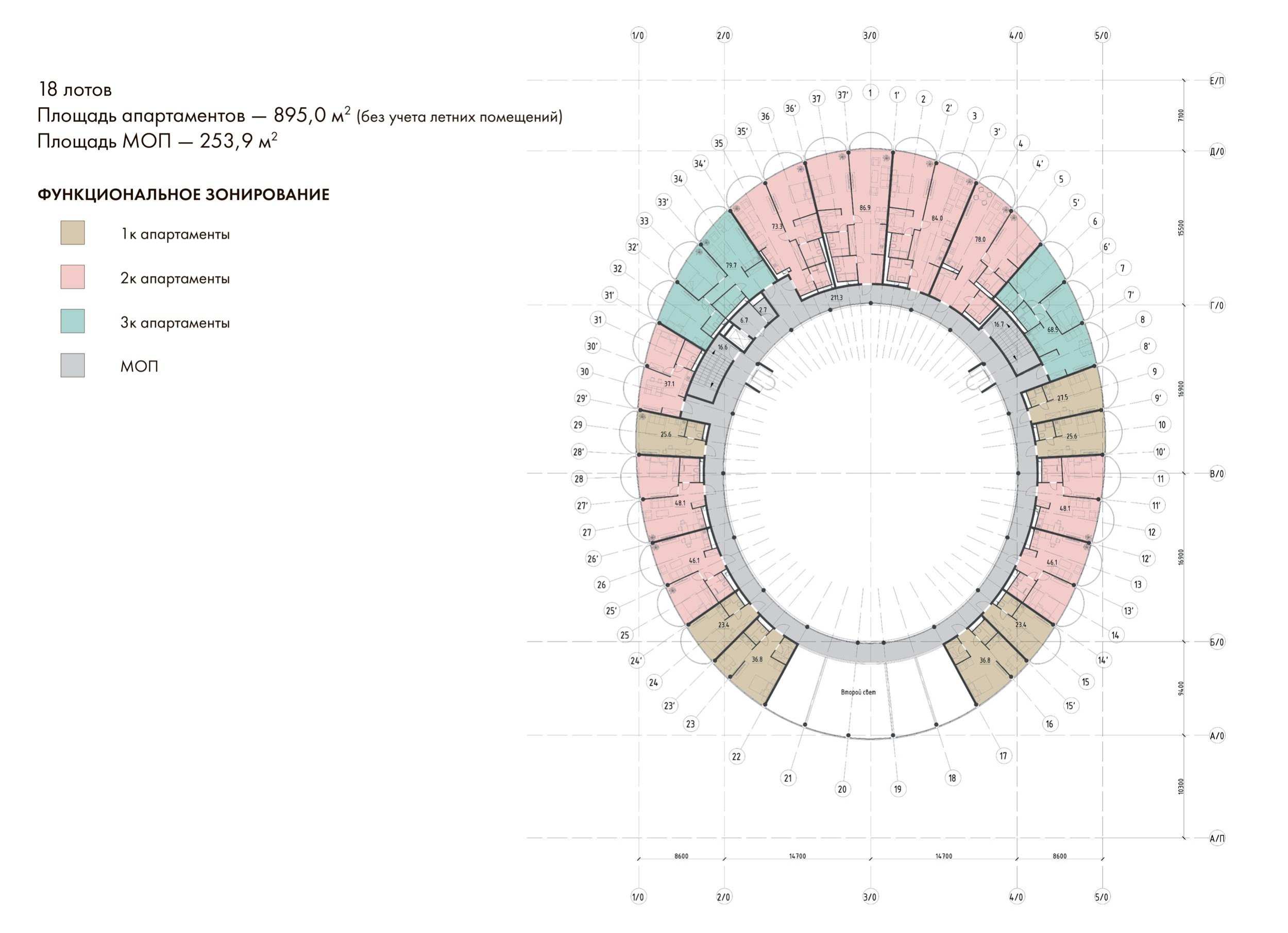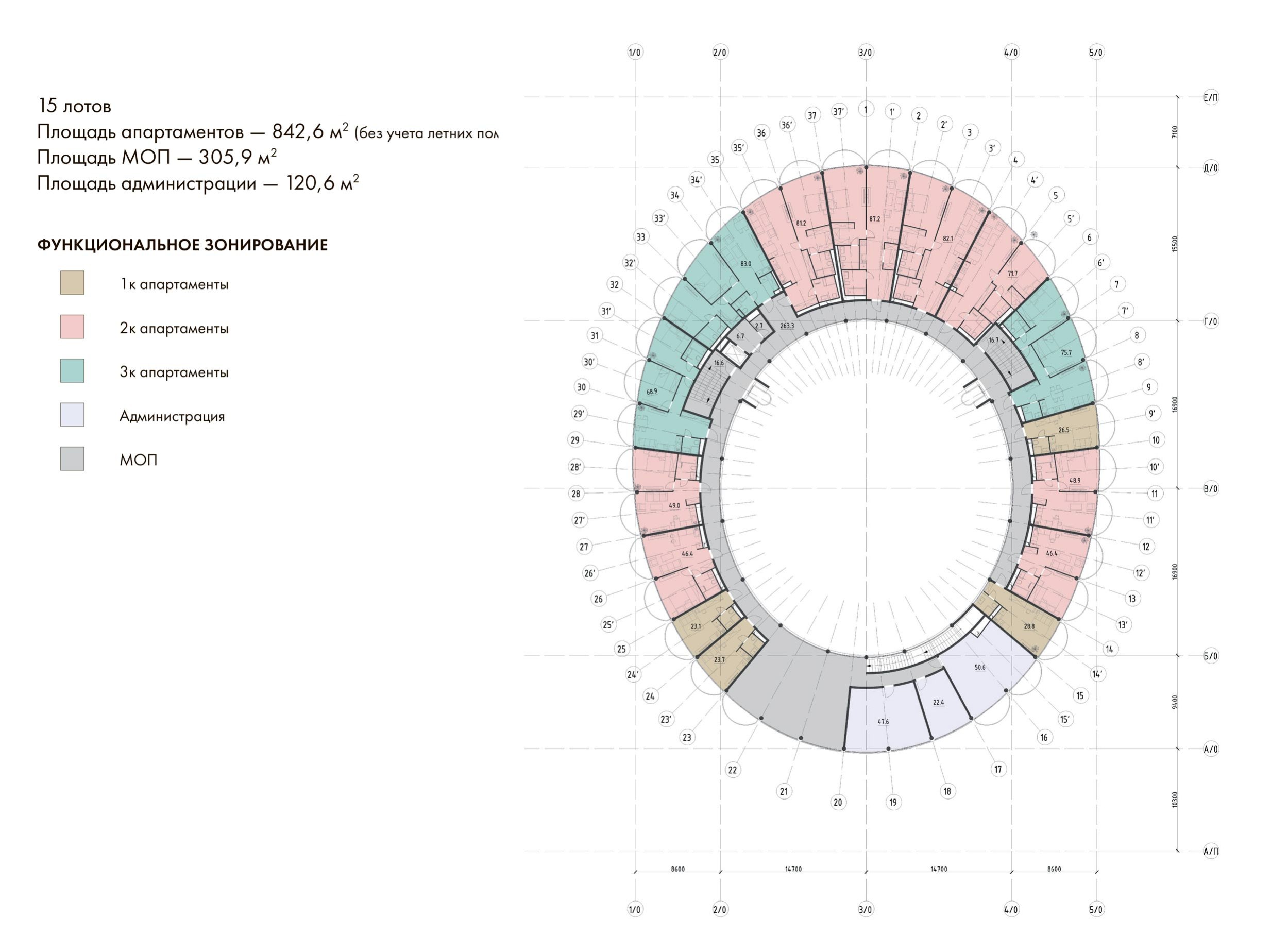 По внешнему контуру кольца расположены балконы – словно нанизанные «бусины», образующие изысканное регулярное кружево фасада. Балконы размещены в шахматном порядке, что придаёт зданию ритмичность и визуальную динамику. Такое решение не только эстетично, но и функционально – обеспечивает жильцам максимум солнечного света и естественной вентиляции.