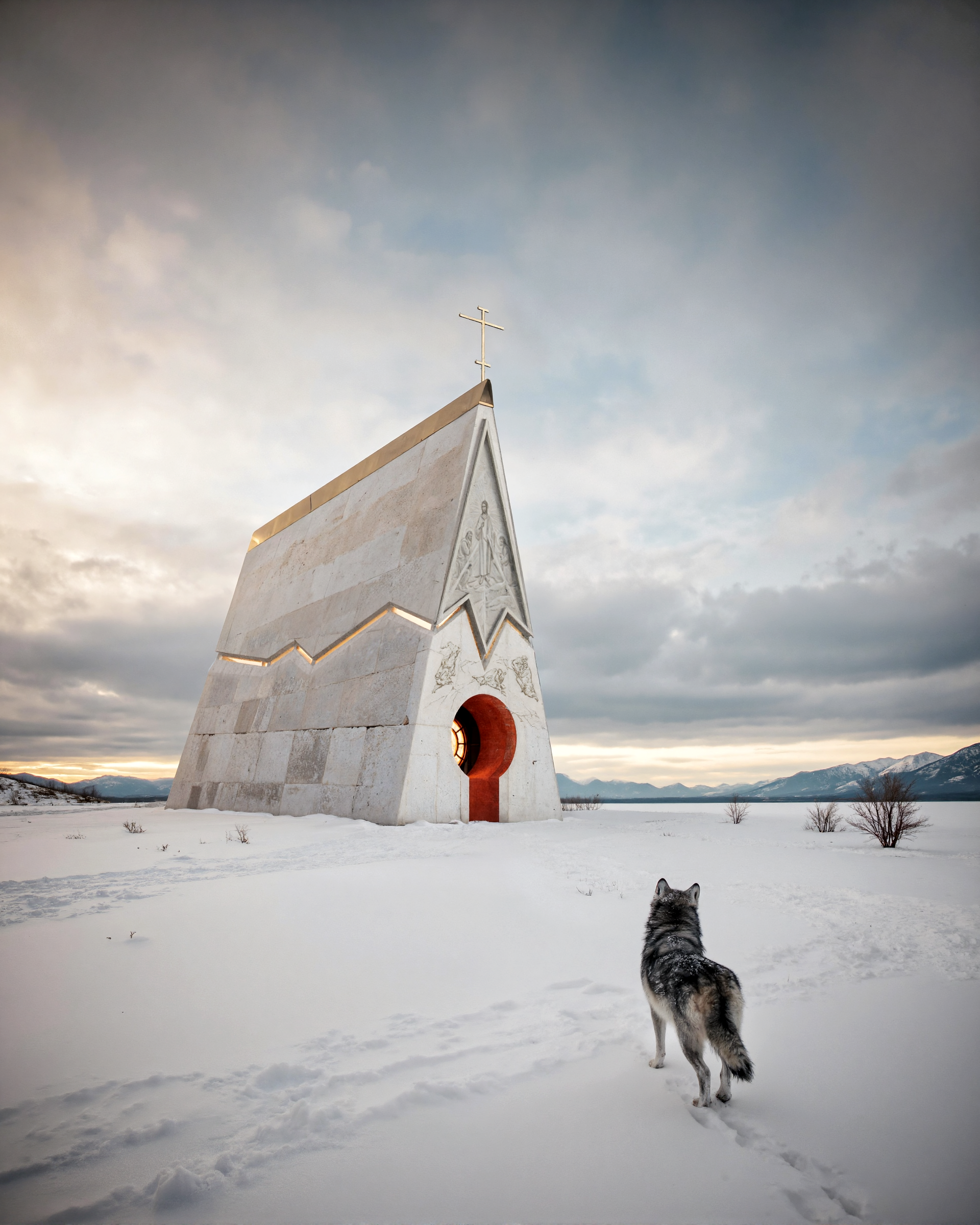 Её предполагаемое местоположение – Крайний Север. Архитектурная форма – треугольная, основана на иконографии Преображения и восходит к древнерусским северным иконам, где Христос изображён в стреловидной треугольной мандорле, из которой нисходят лучи света.