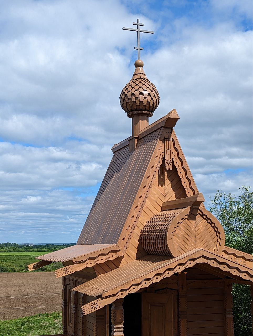 Здание богато украшено резными элементами, кровля завершена главкой с крестом, а лемеховое покрытие используется на главке и кокошнике.