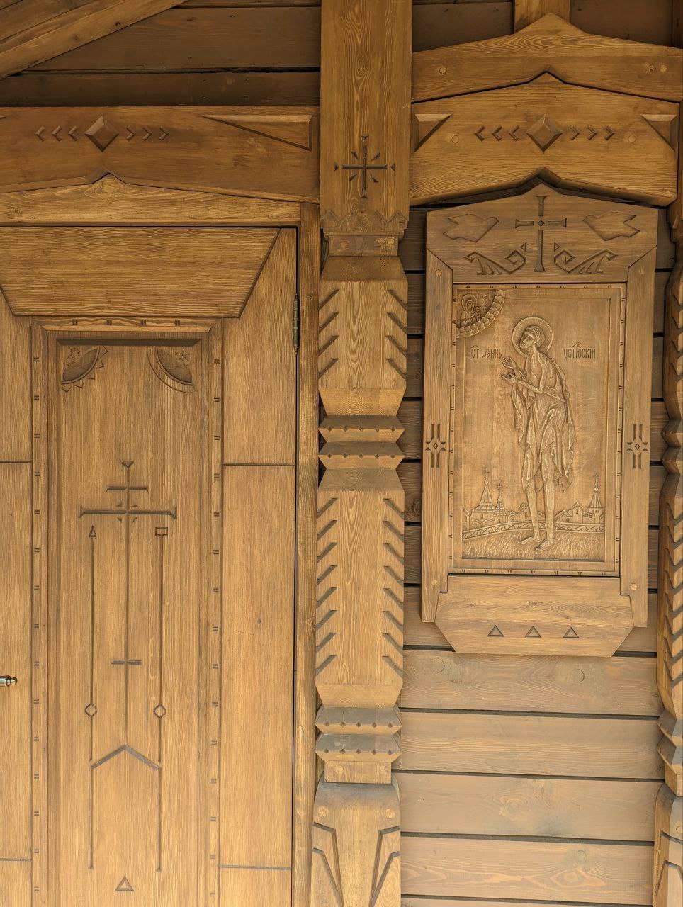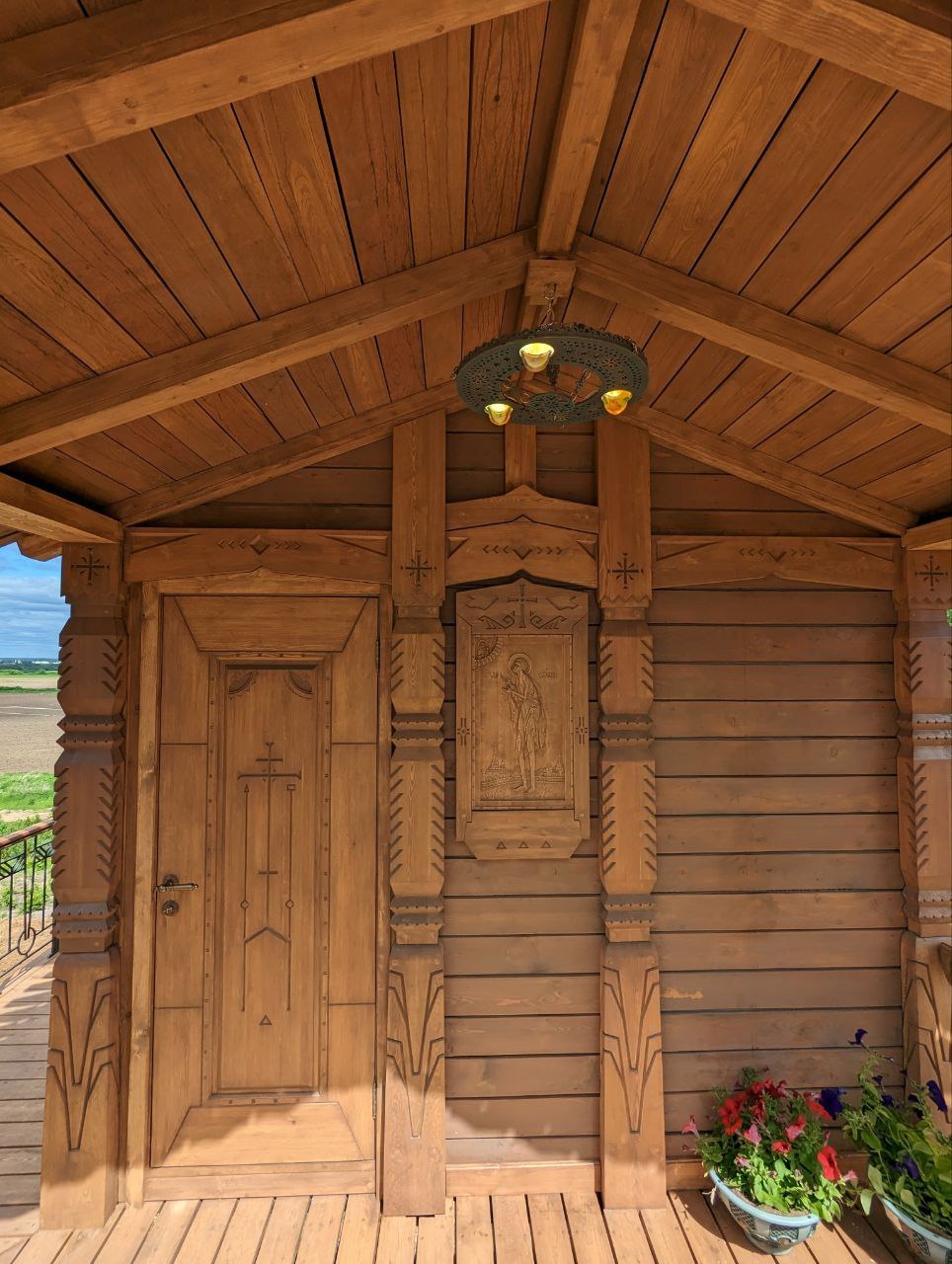 На главном фасаде, у входа, размещена резная икона святого блаженного Иоанна Устюжского, подчёркивающая сакральный характер сооружения.