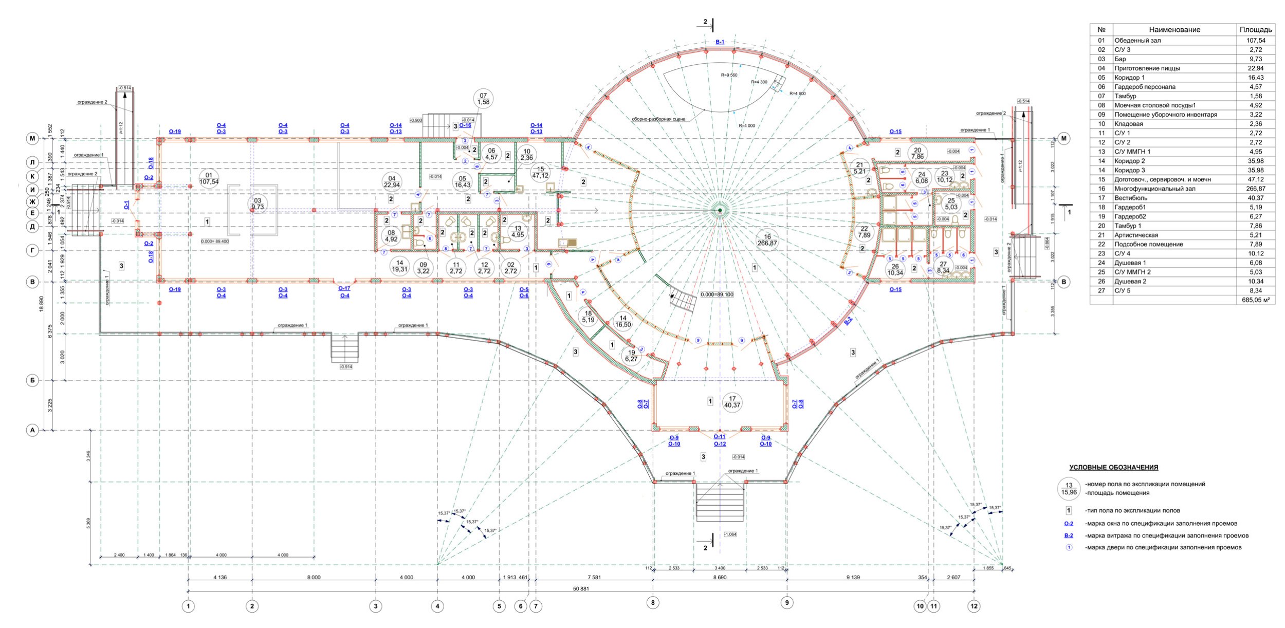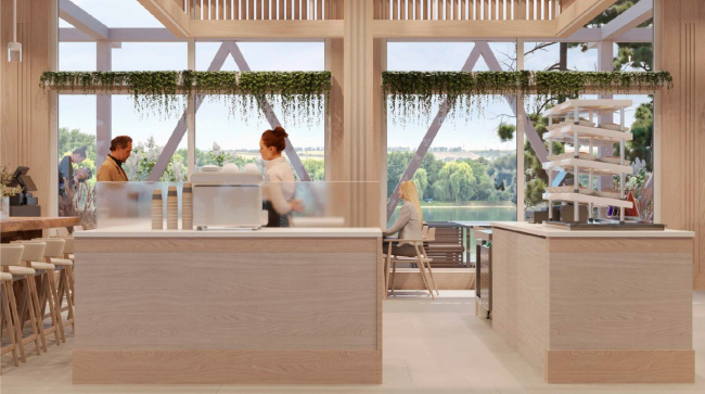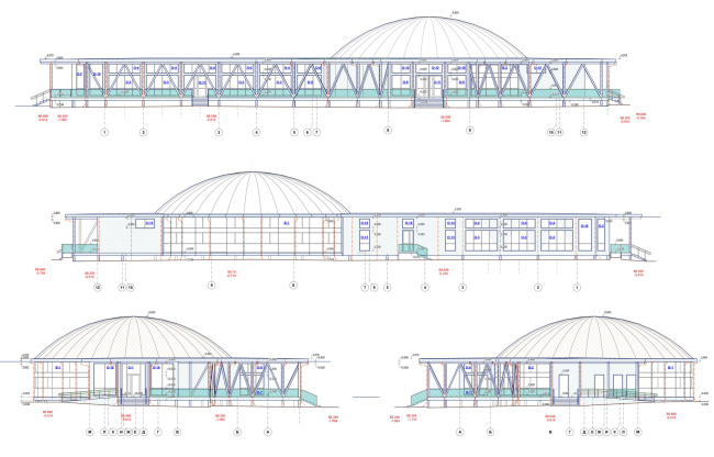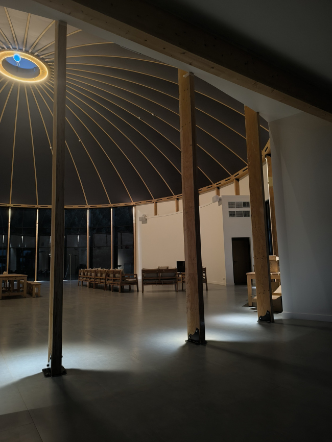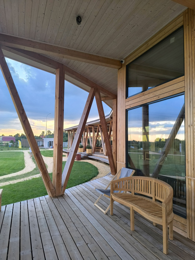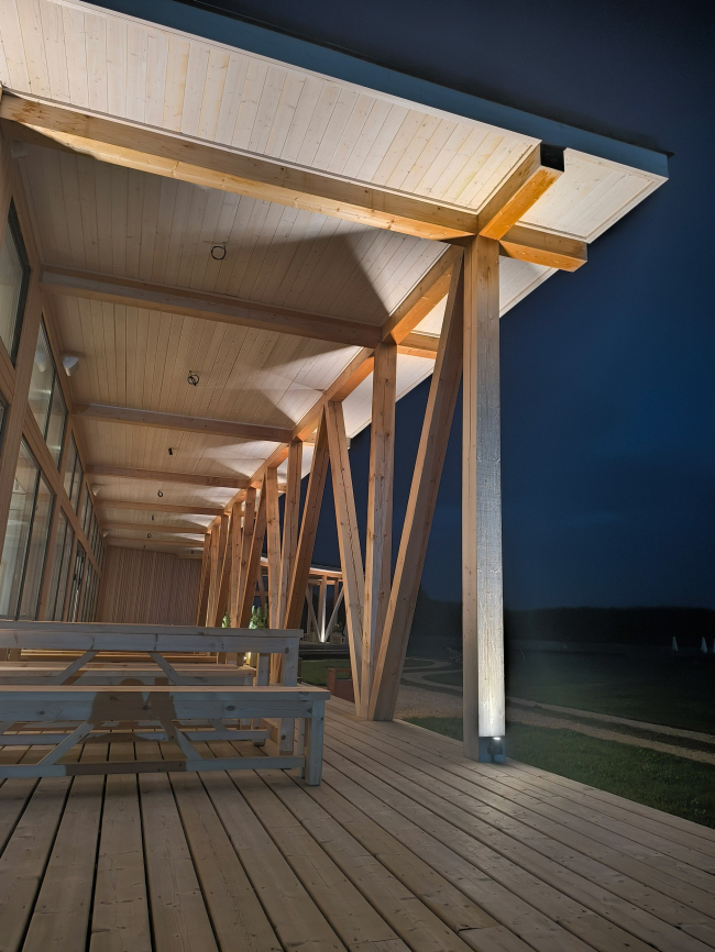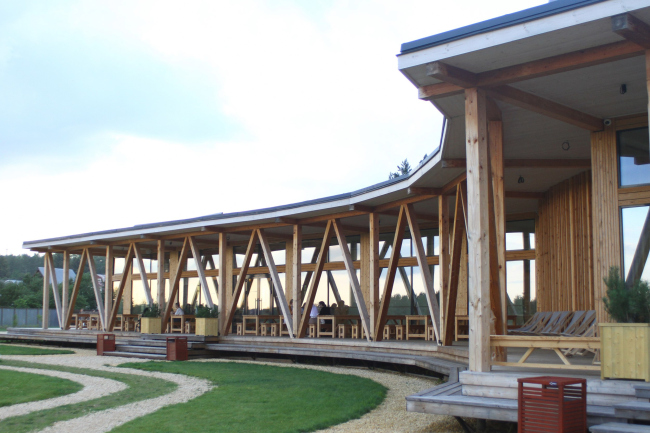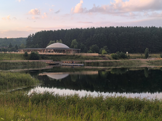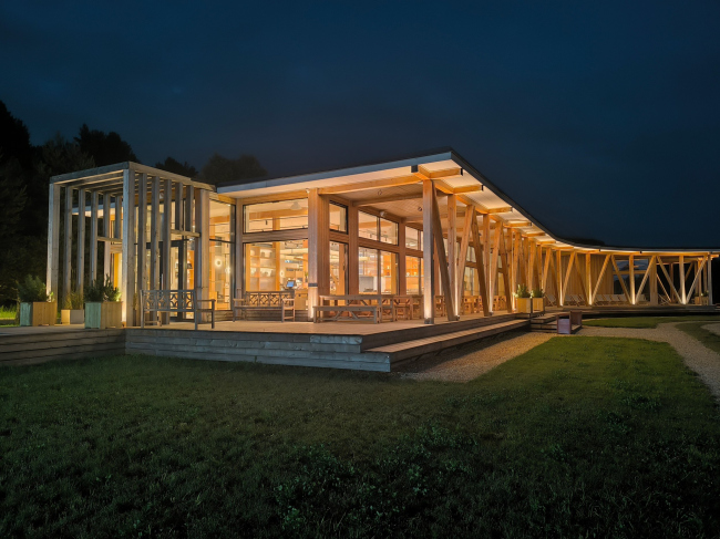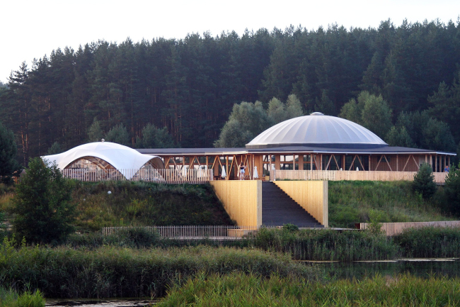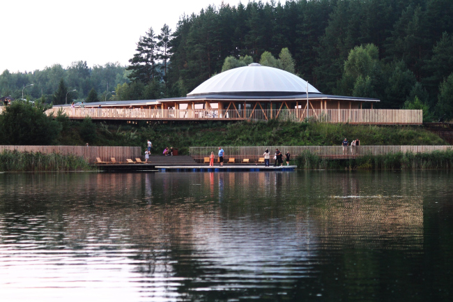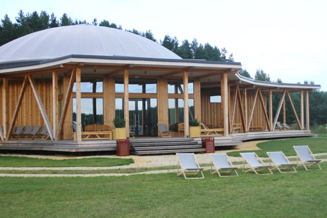 Это деревянный сборно-разборный павильон на винтовых сваях. Купольный конференц-зал – идея заказчика, так же его выбор пал на технологию с SIP-панелями для возведения основного объема павильона. Задачей проекта было «поженить» две разные технологии производителей и не забыть при этом про архитектуру.