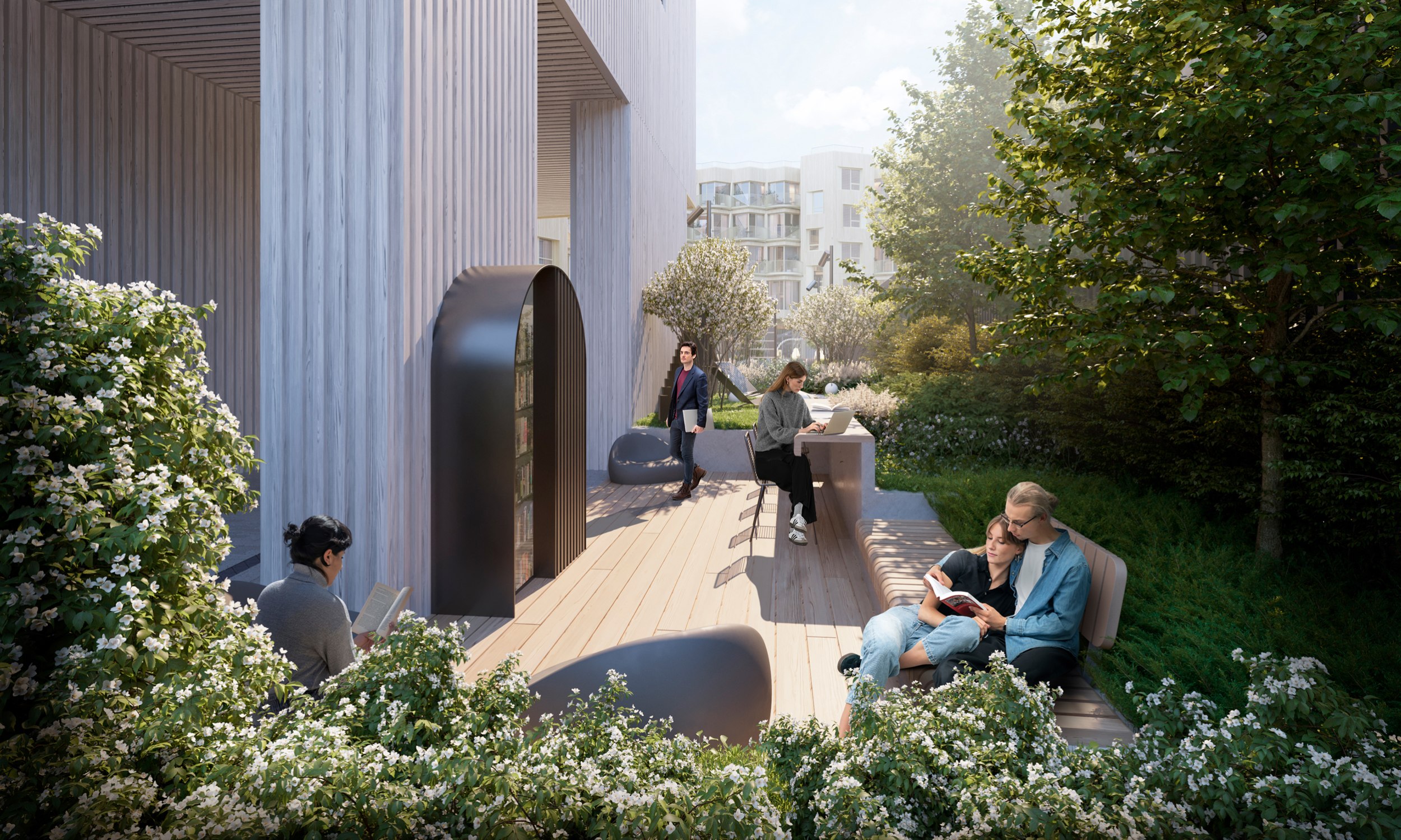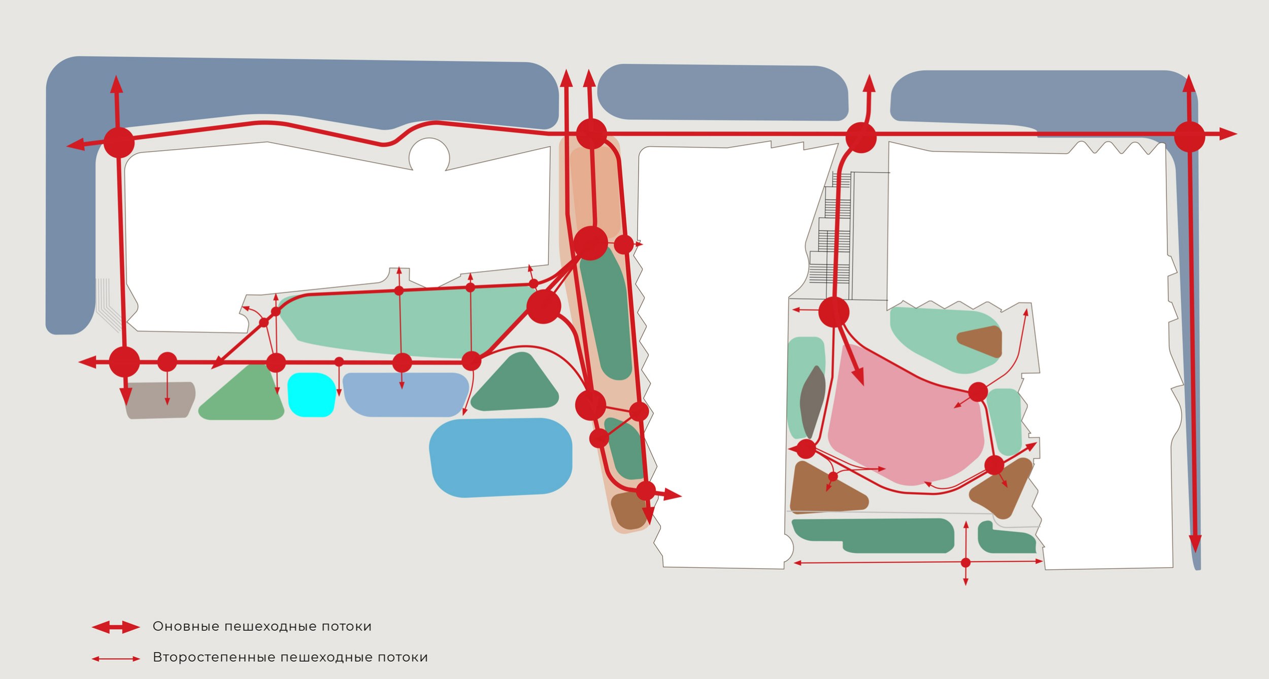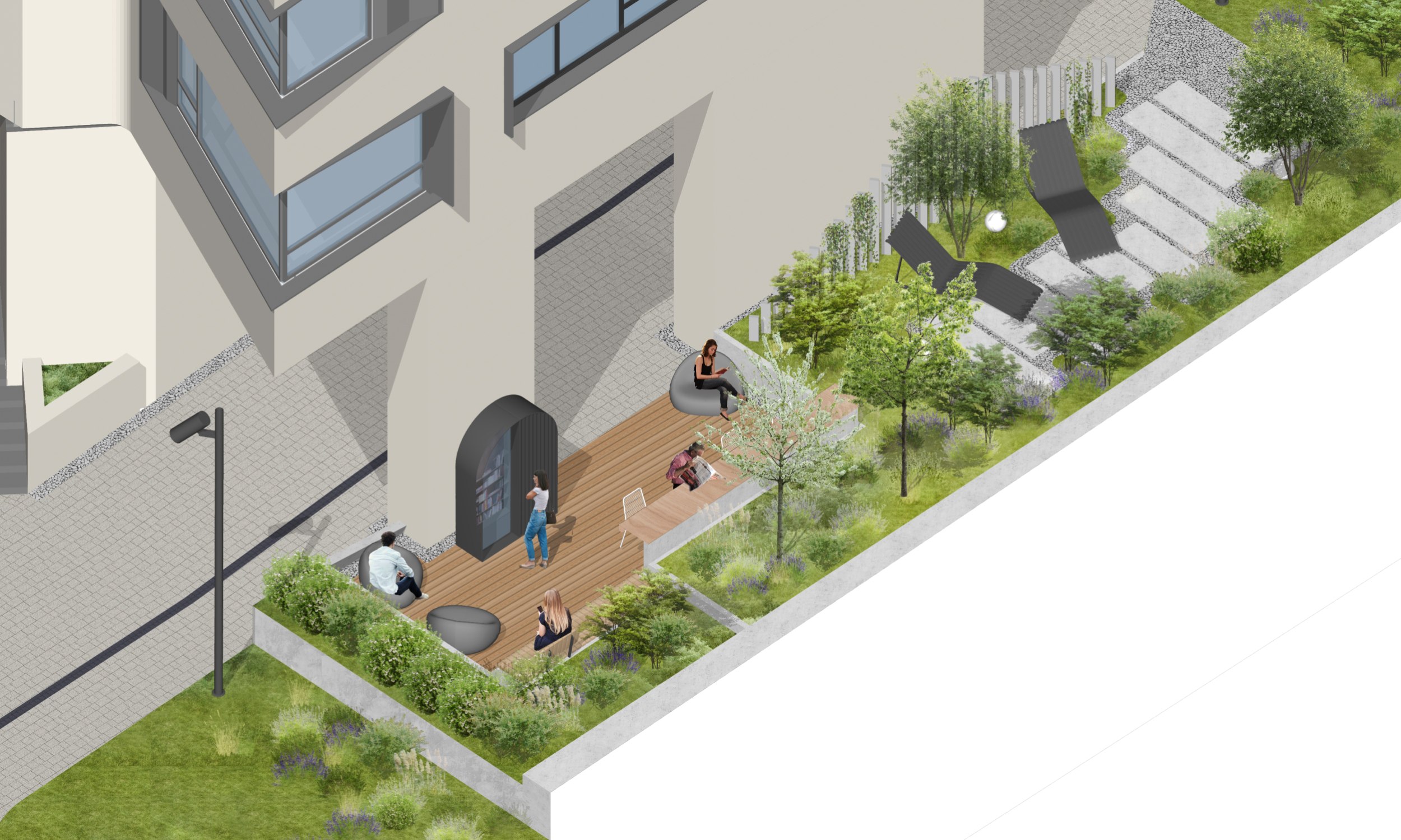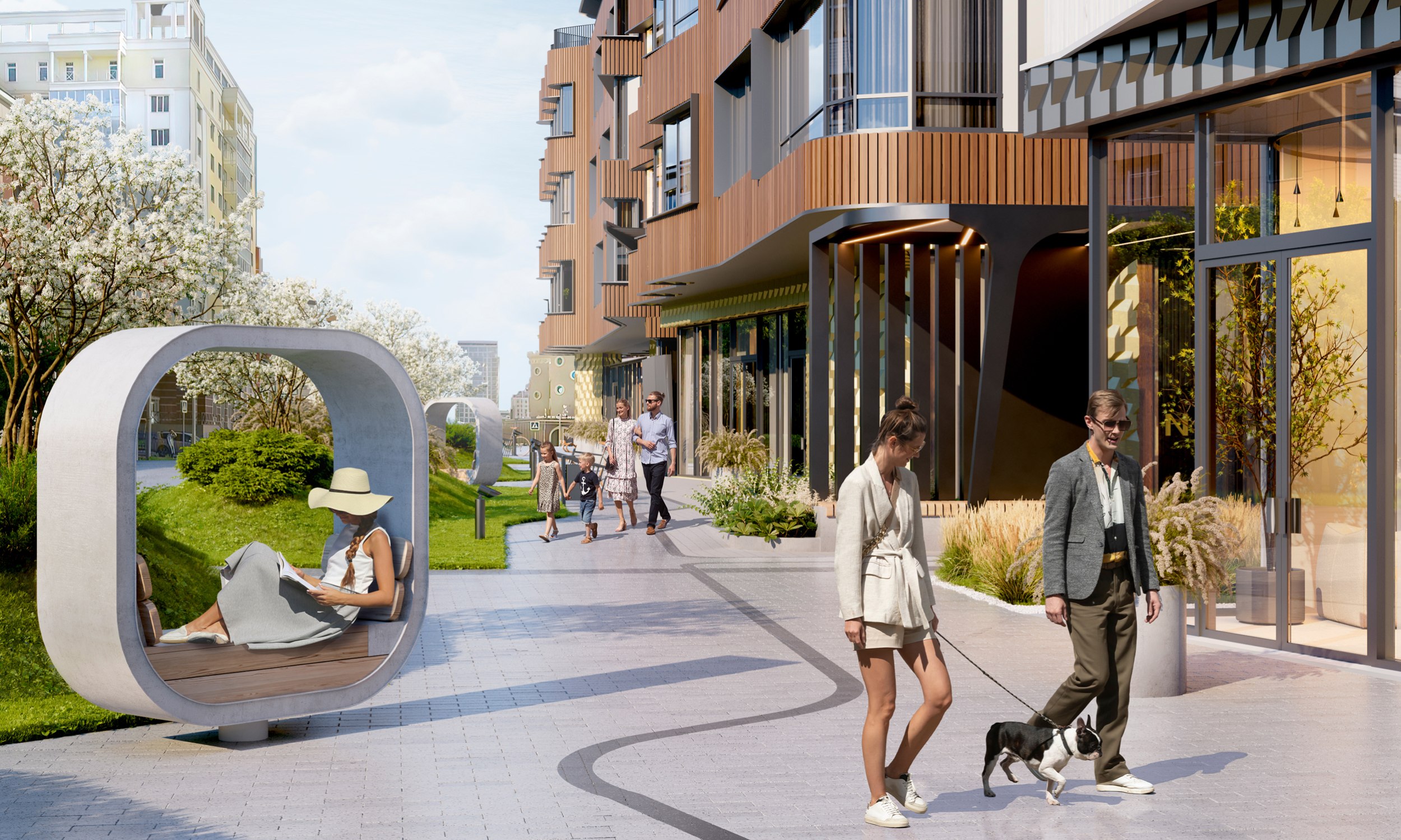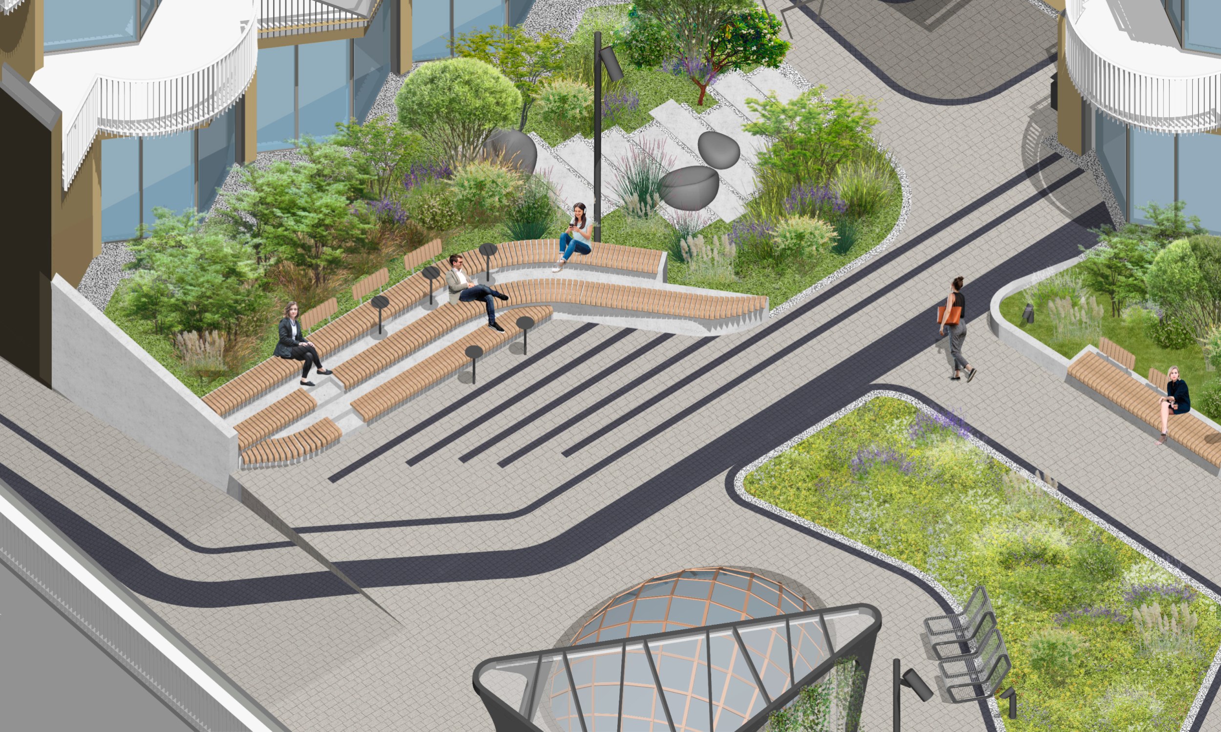 При разработке концепции озеленения и благоустройства перед архитекторами стояла непростая задача: территория проектирования имеет сложную форму и выраженный рельеф, а также находится в окружении объектов культурного наследия. Все это стало отправной точкой для создания концепции, в которой ландшафт подчеркивает исторический контекст, а формы и материалы поддерживают идею преемственности.