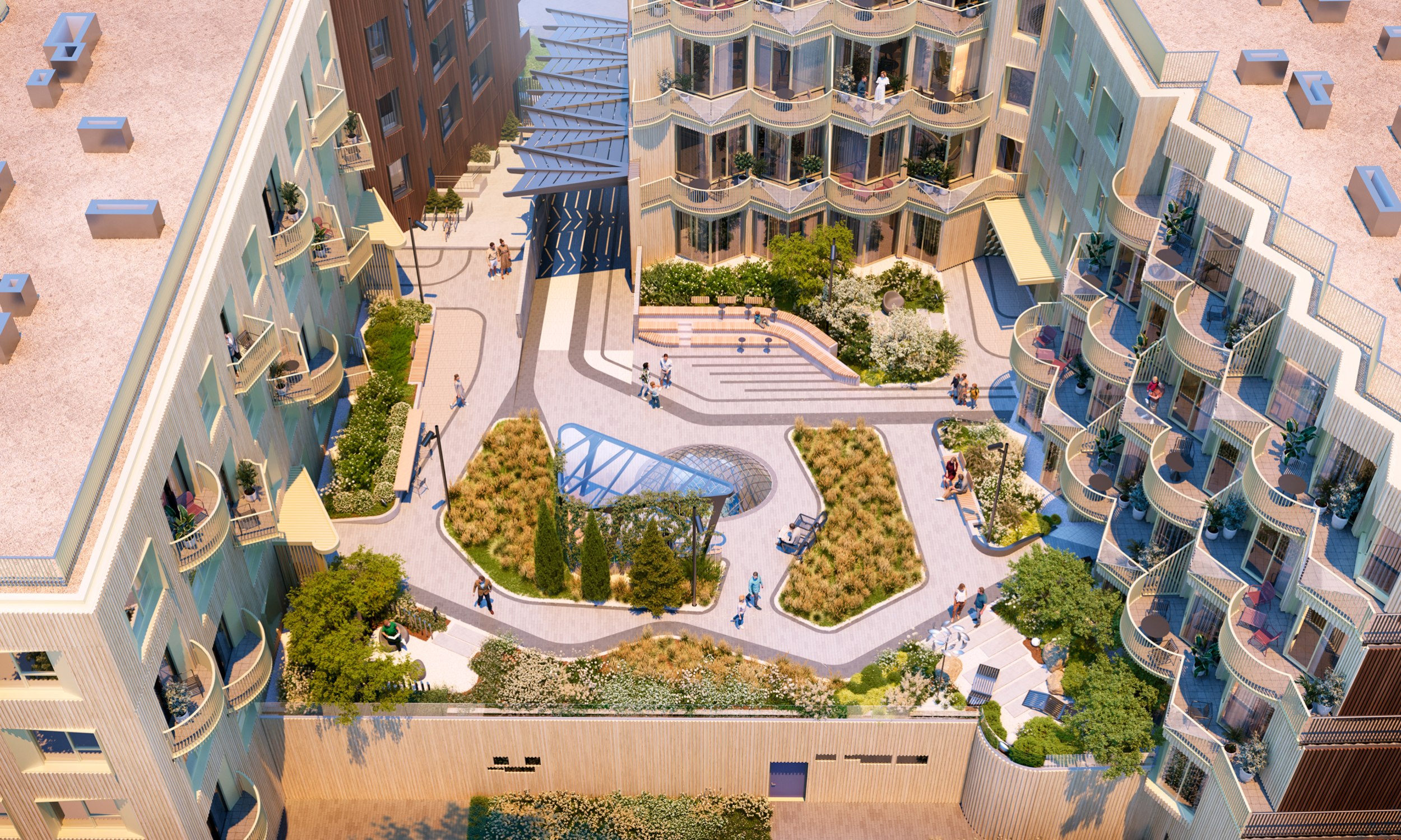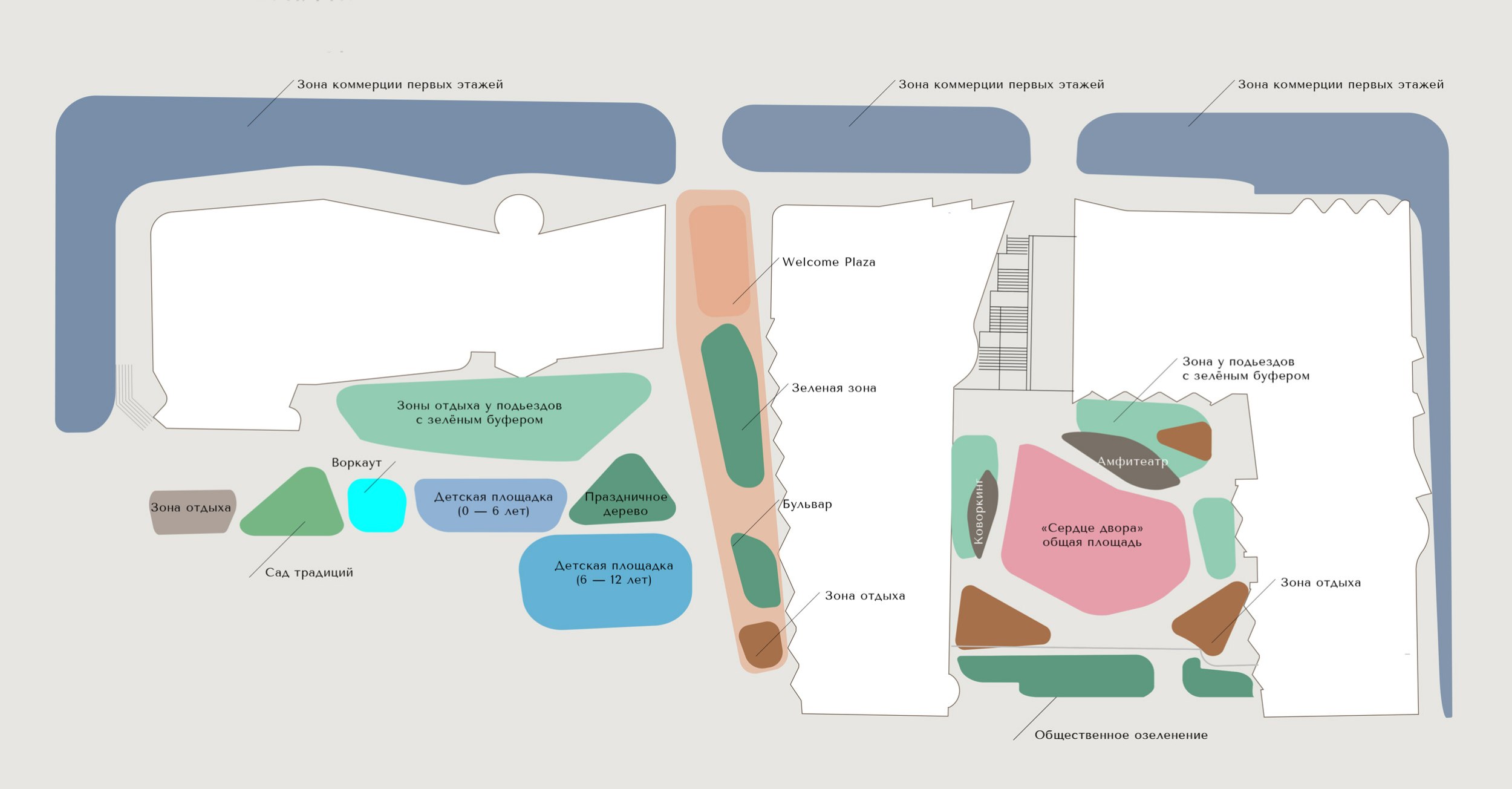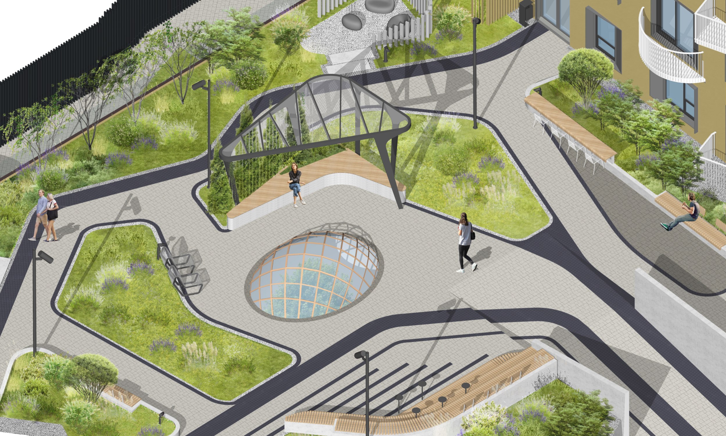 Также, по задумке архитекторов, двор будет разделен на функциональные зоны, переосмысляющие традиции города: