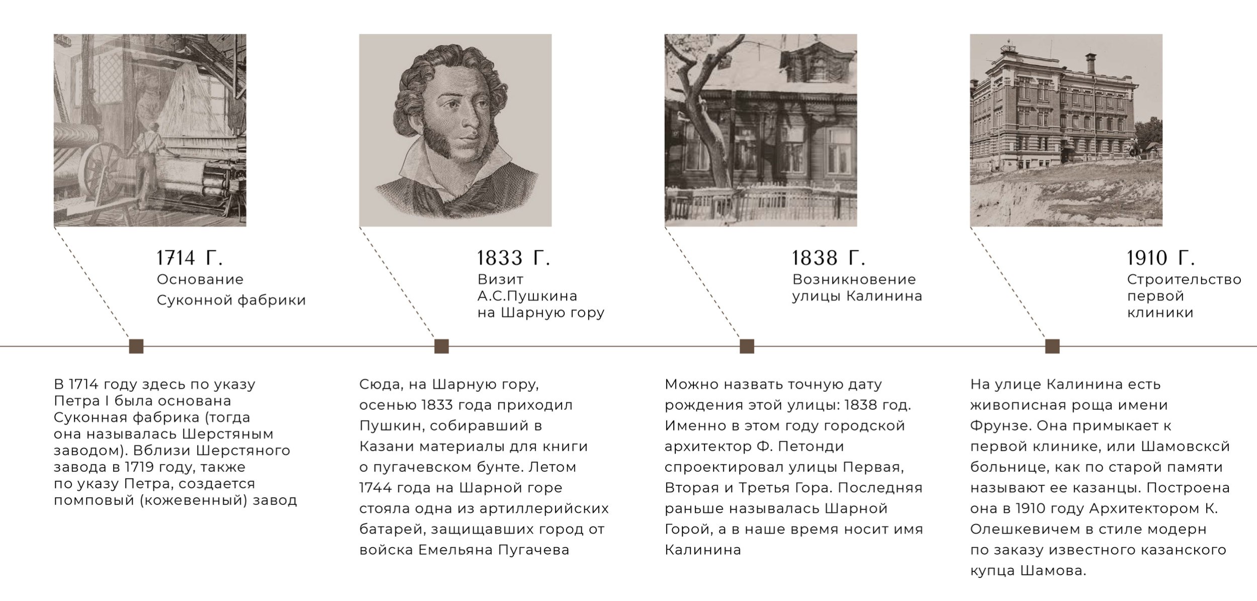 История этой территории начинается в 1714 году, когда по указу Петра I здесь была основана Суконная мануфактура – первая шерстяная фабрика Казани. Это место веками притягивало интеллигенцию, мастеров, купцов и деятелей искусства. Здесь всегда жили люди, для которых важно бережно хранить традиции и создавать новые культурные смыслы. Сегодня район является культурным, деловым и развлекательным центром столицы Татарстана: в шаговой доступности жителей ЖК «Нити» расположены рестораны, кафе, театры, библиотека, улица Тихомирнова – главная артерия района, ведущая к Казанскому Кремлю, и набережная озера Нижний Кабан.